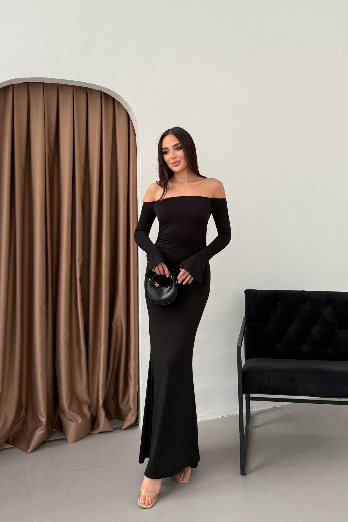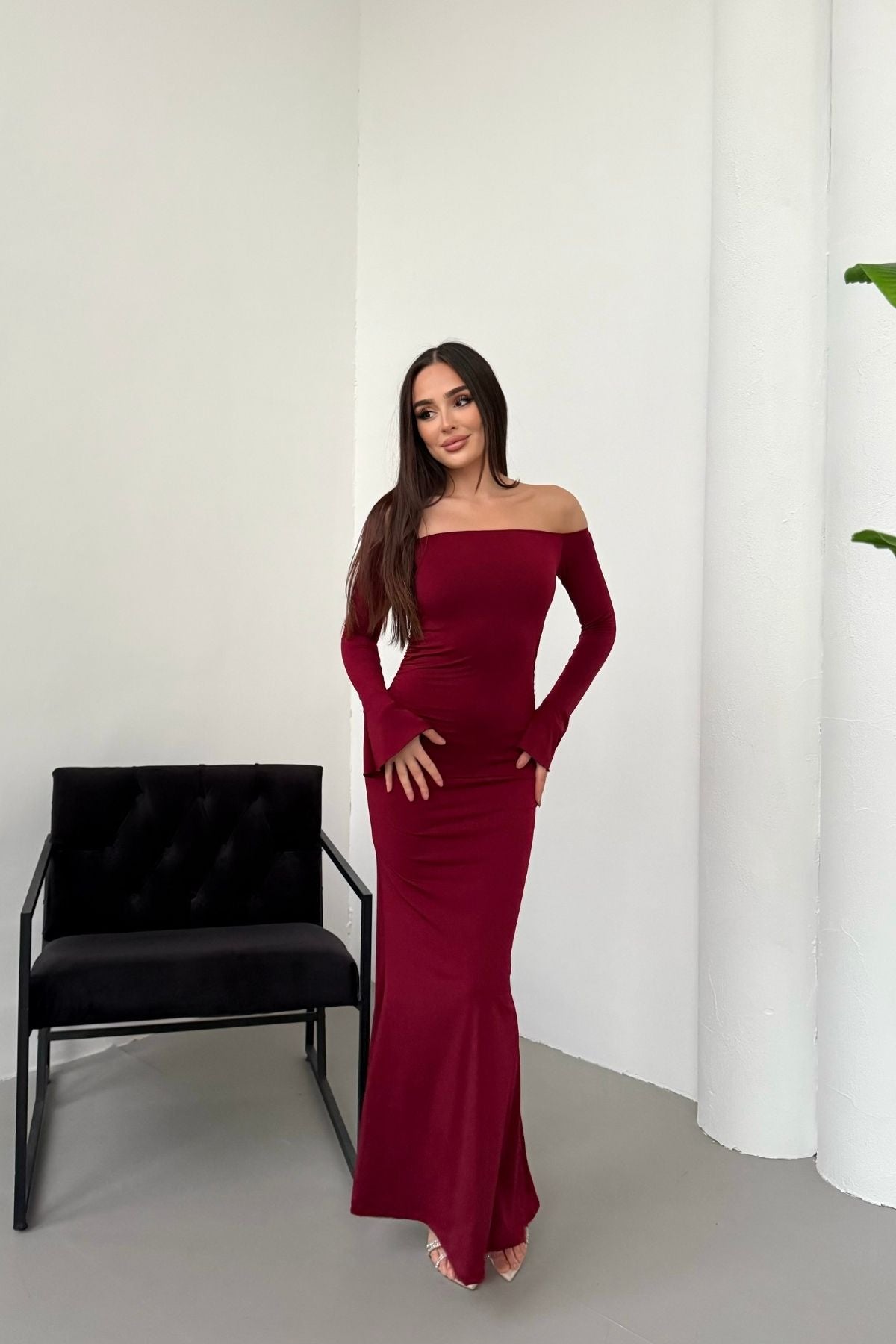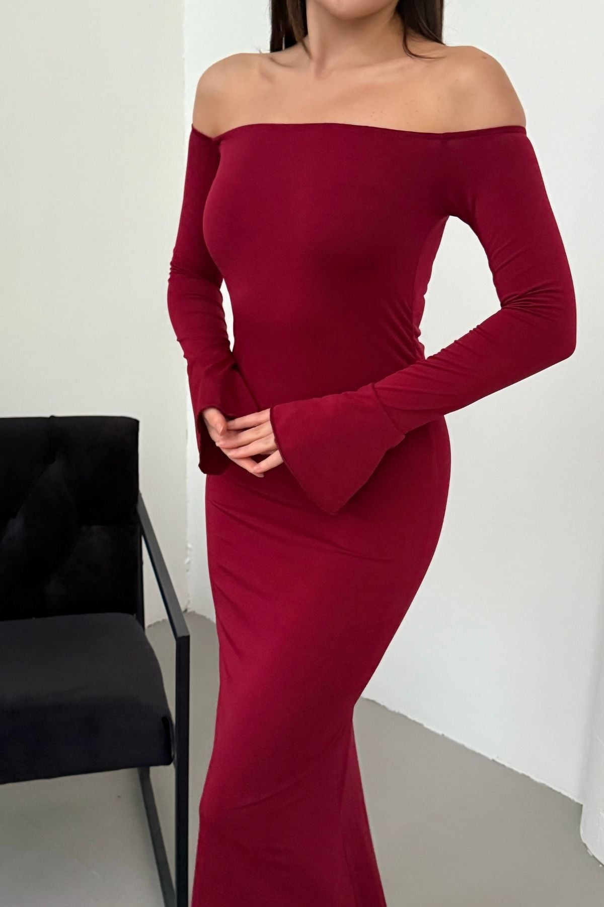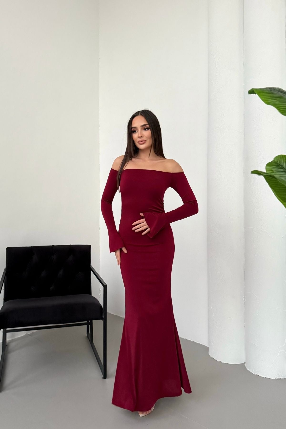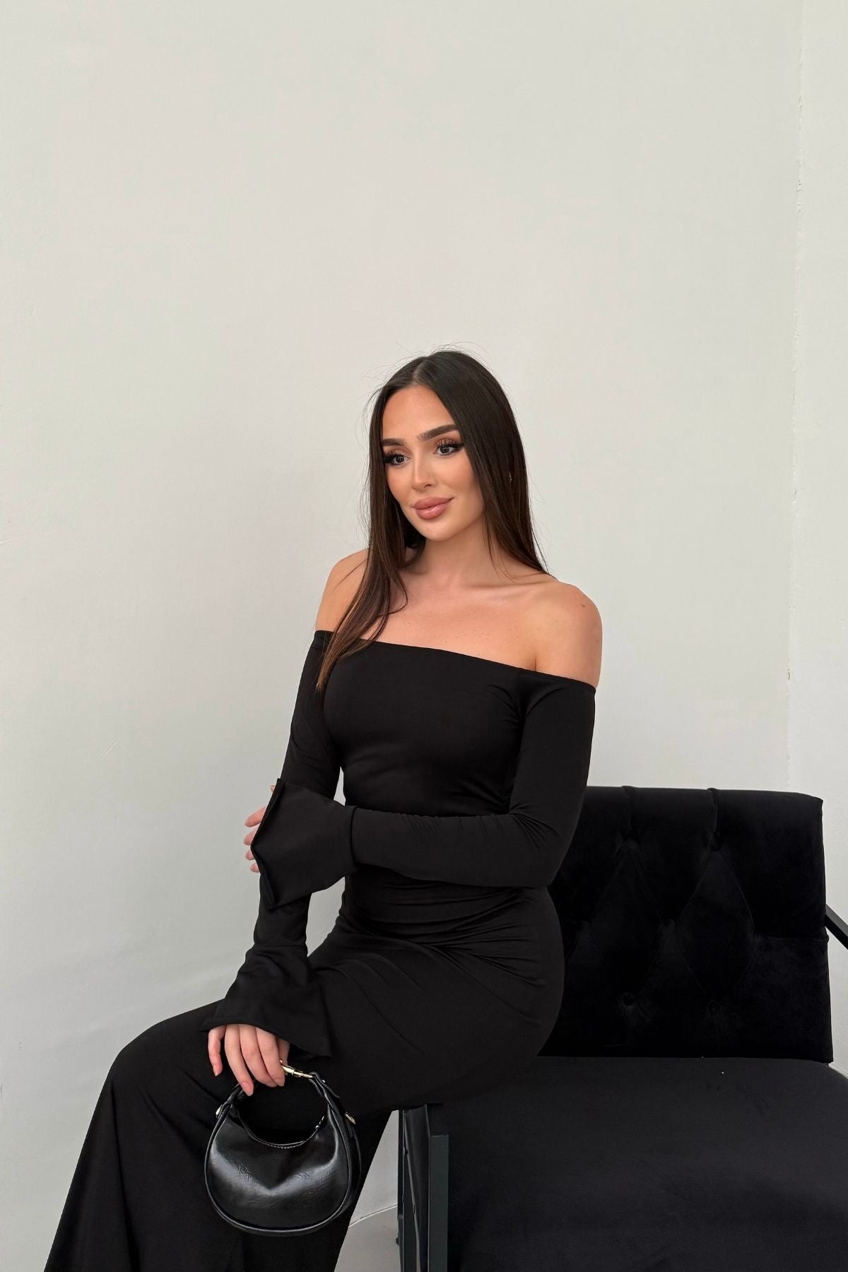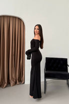 • Modern çizgileri ve iddialı duruşuyla öne çıkan bu elbise, modanna yaka omuz detayı sayesinde güçlü ve zarif bir görünüm sunar.