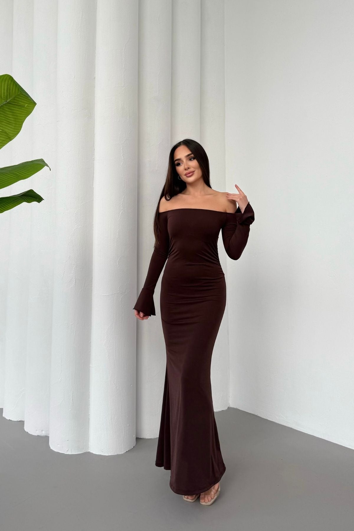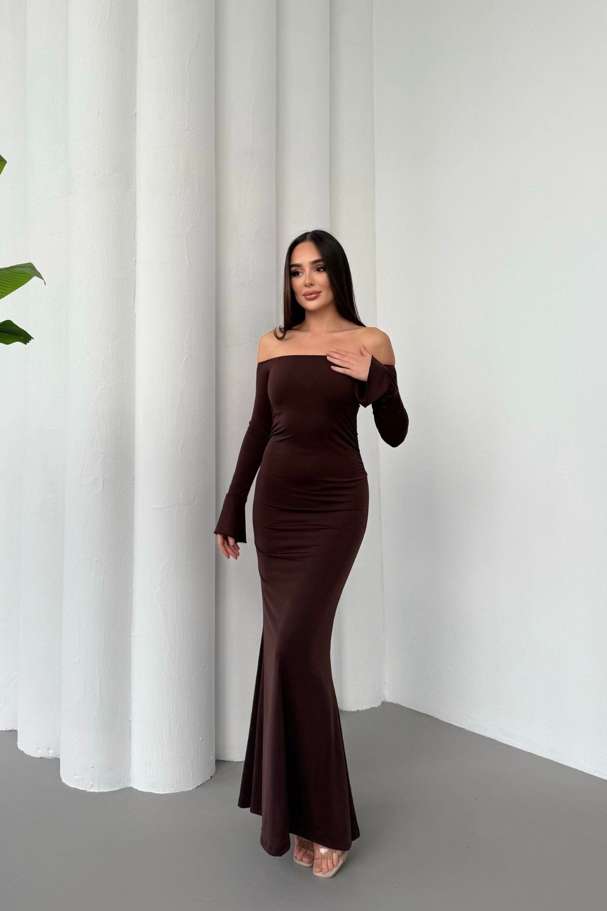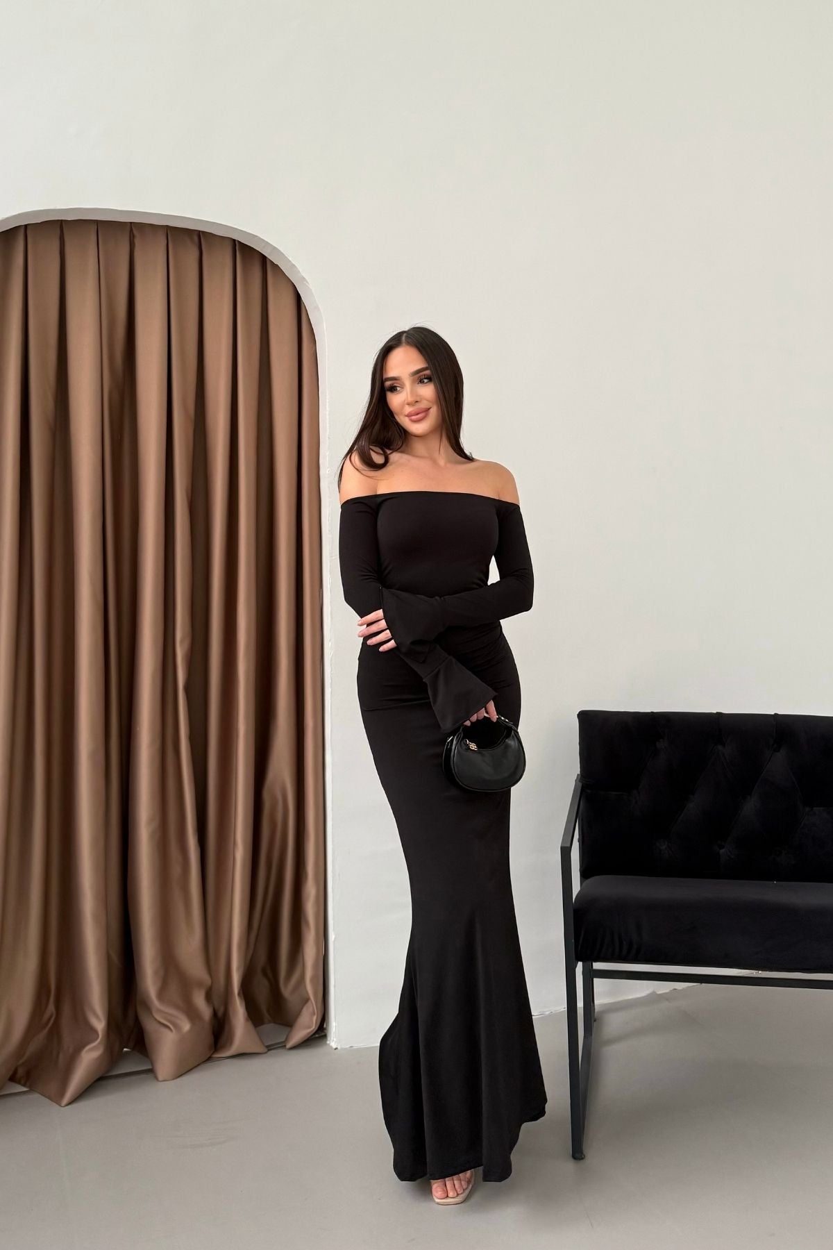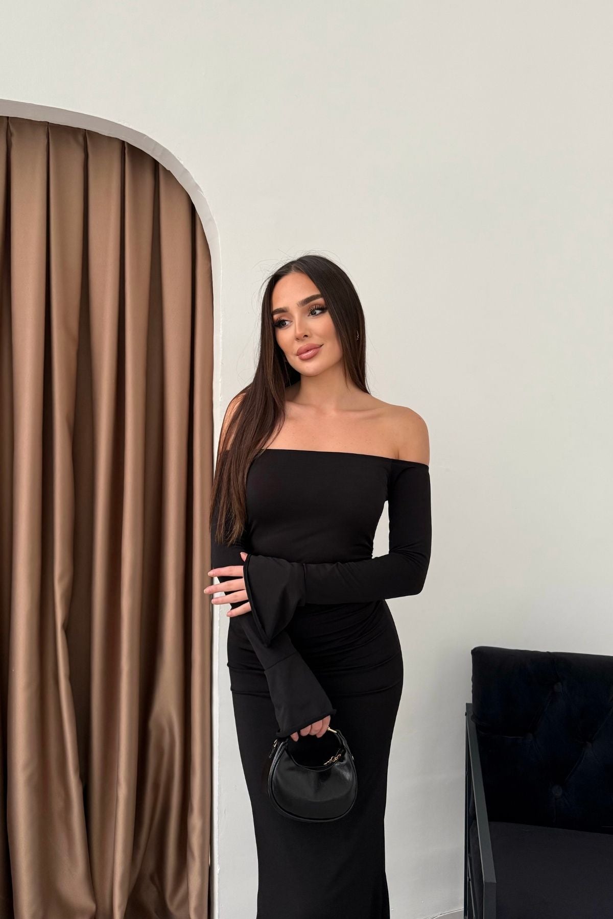 • Modern çizgileri ve iddialı duruşuyla öne çıkan bu elbise, modanna yaka omuz detayı sayesinde güçlü ve zarif bir görünüm sunar.