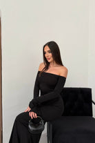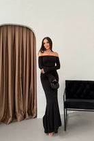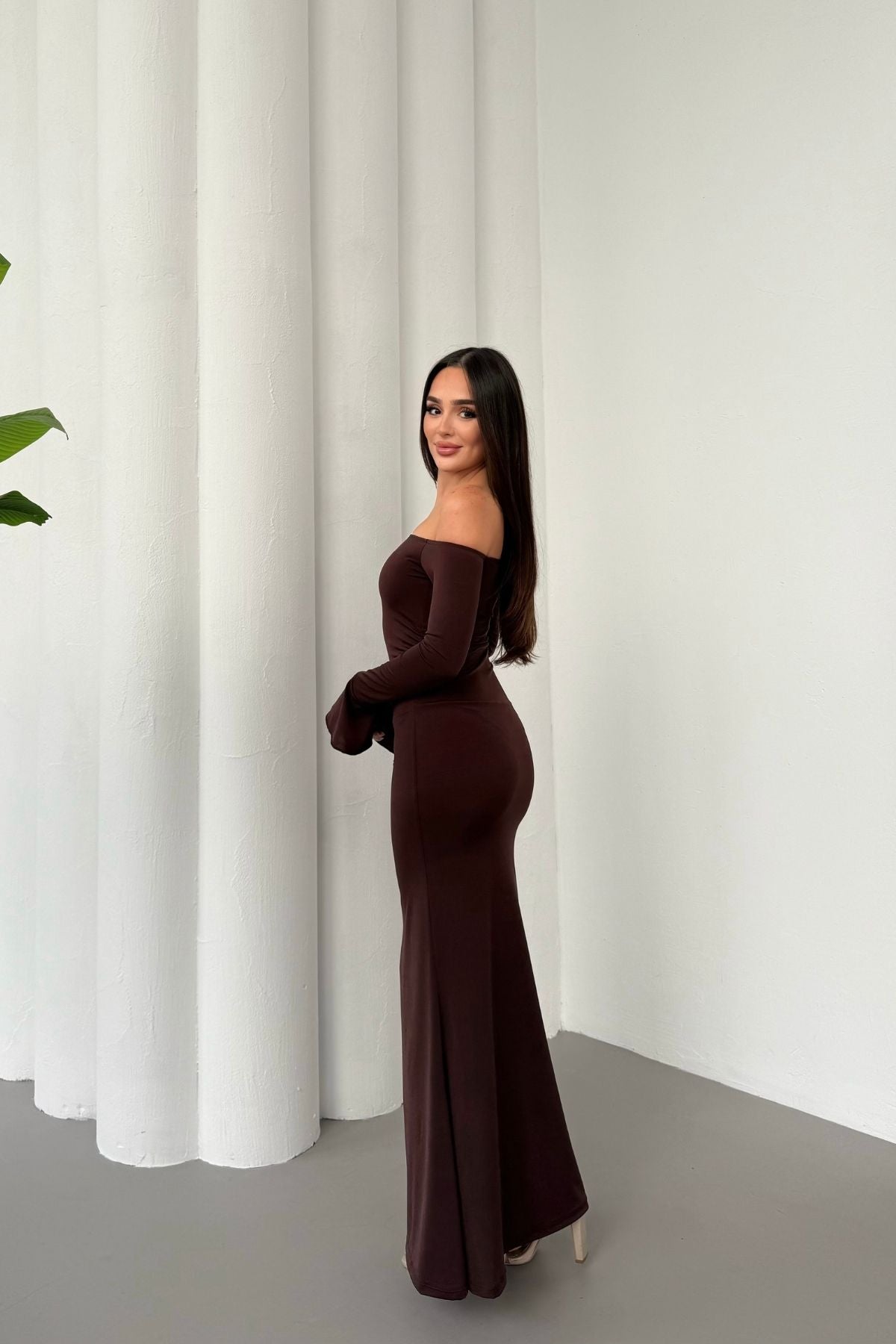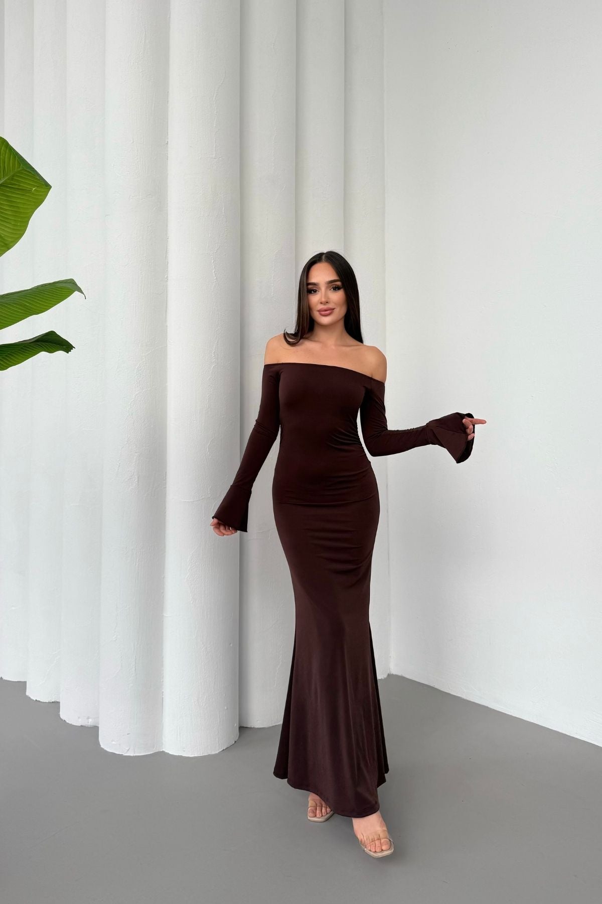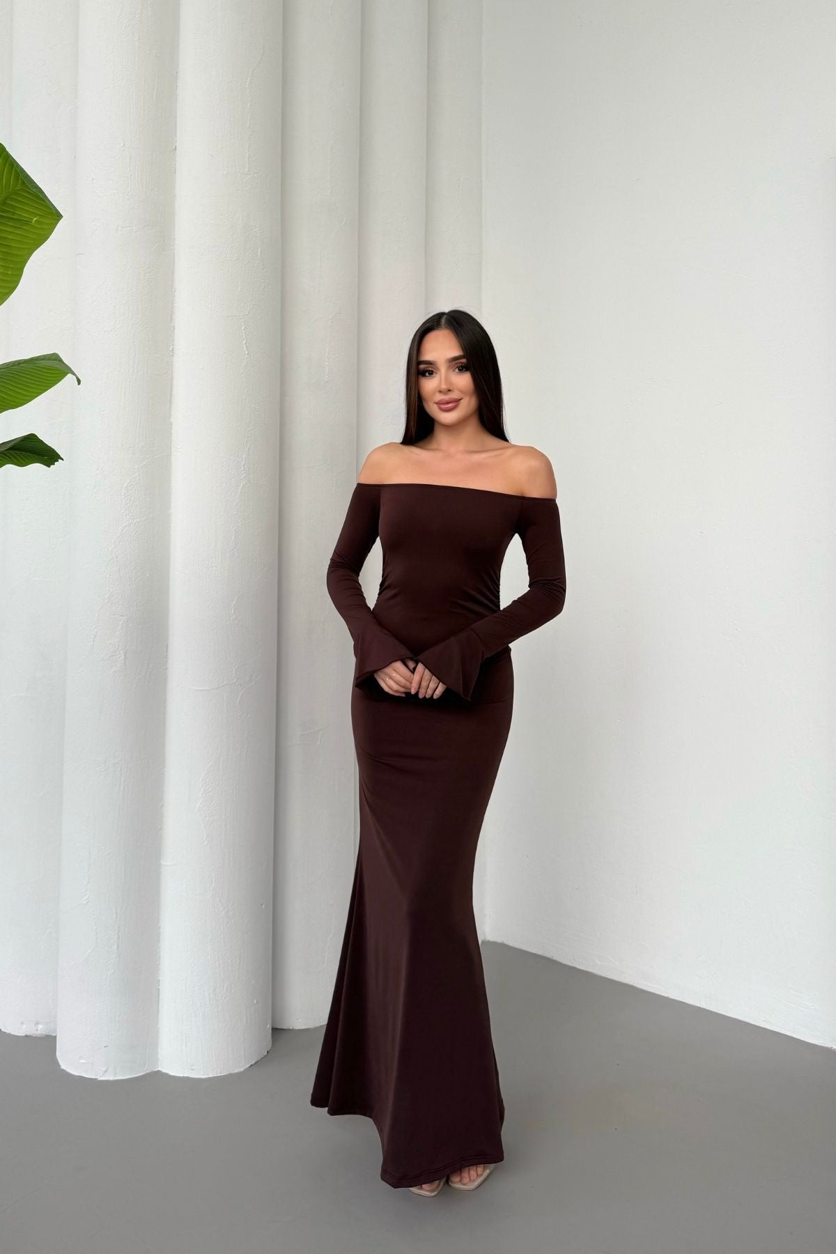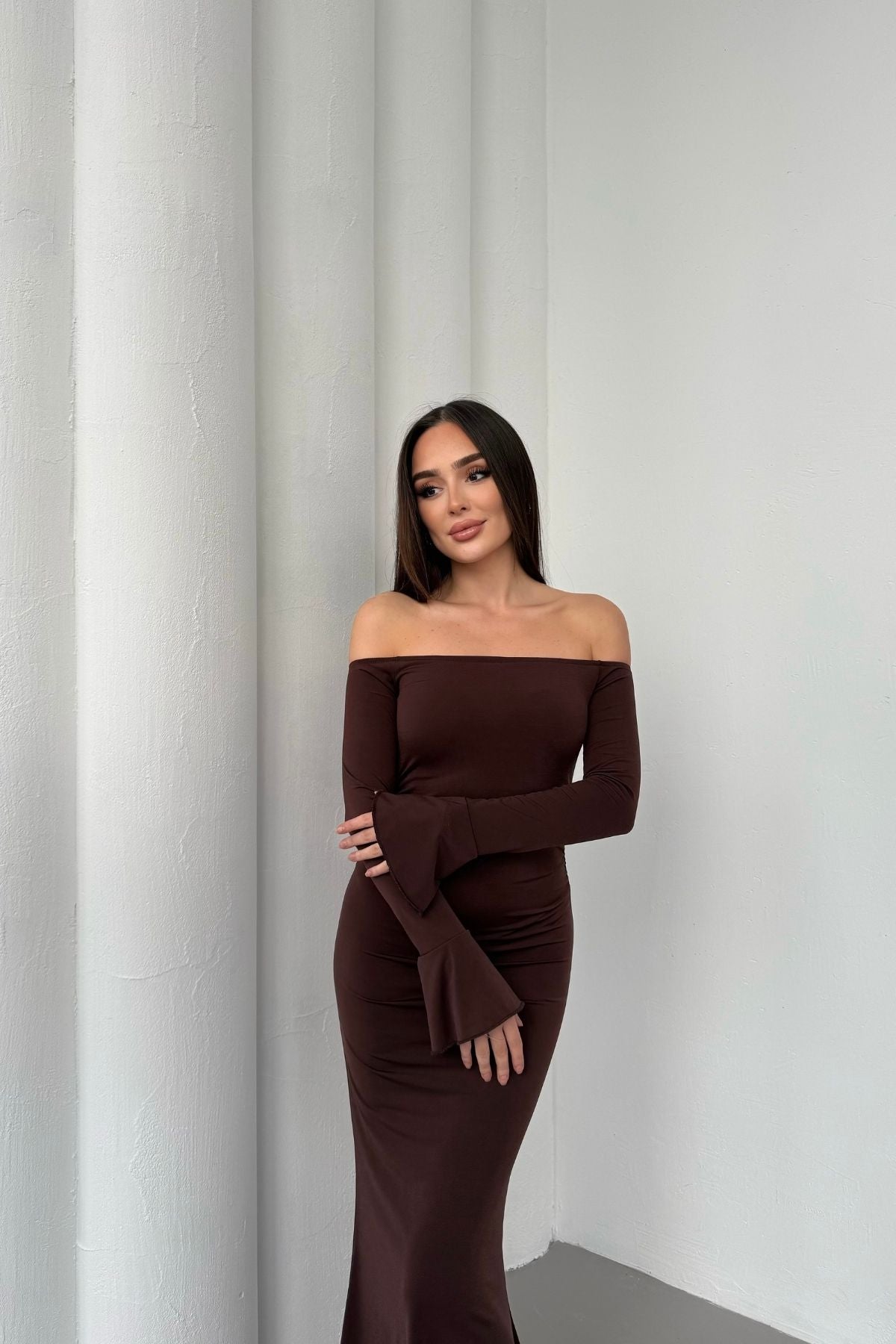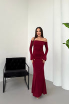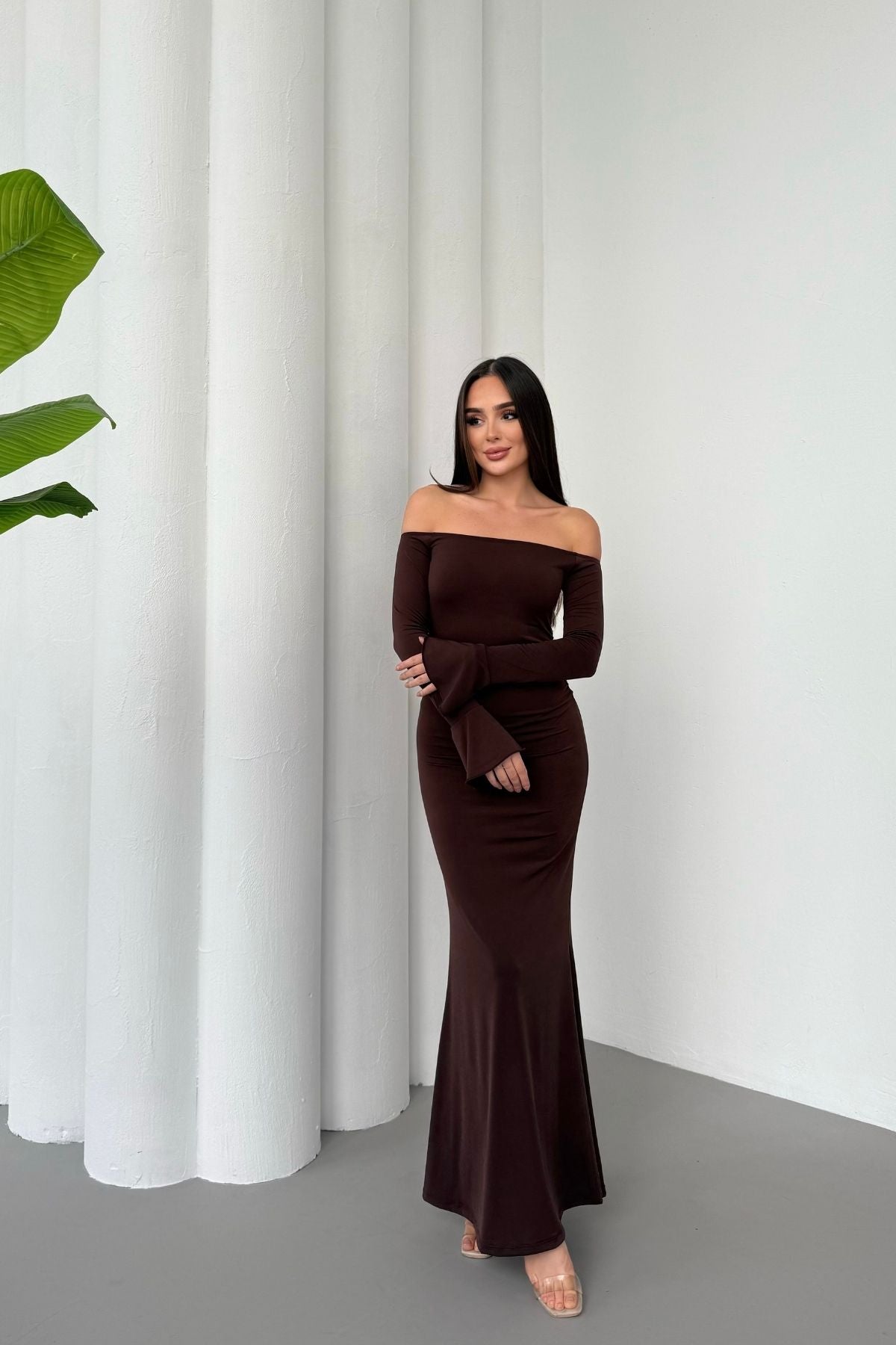 • Modern çizgileri ve iddialı duruşuyla öne çıkan bu elbise, modanna yaka omuz detayı sayesinde güçlü ve zarif bir görünüm sunar.