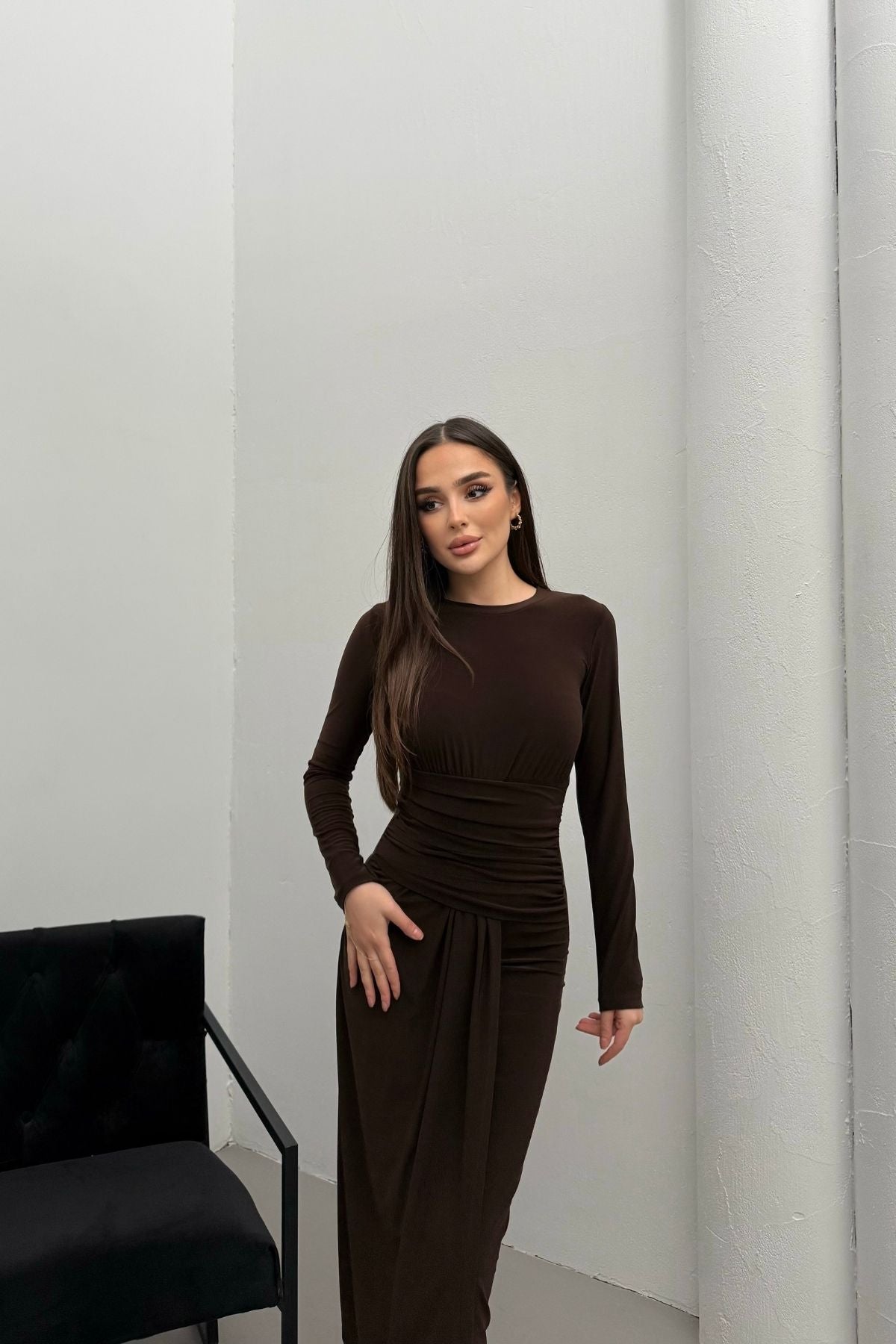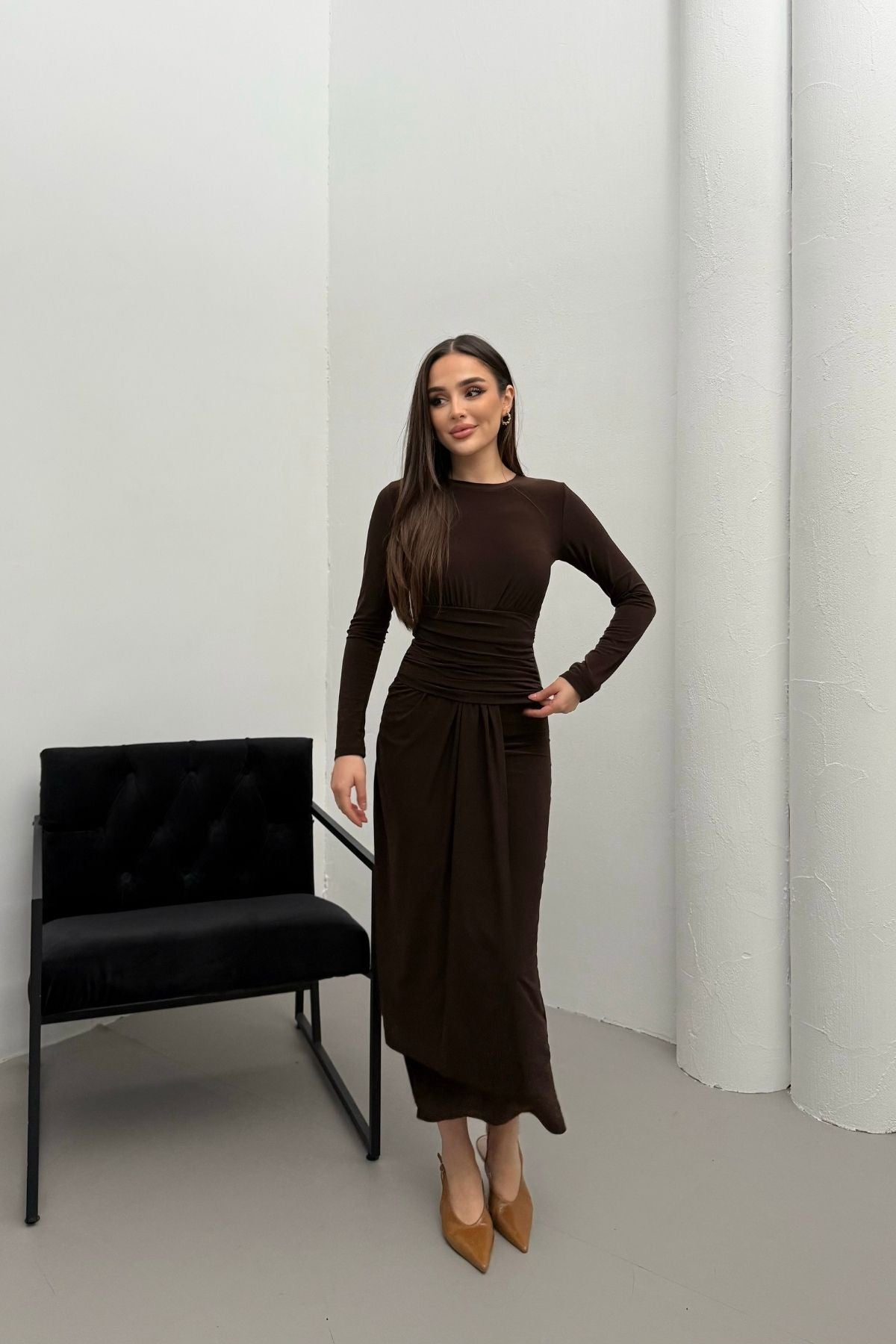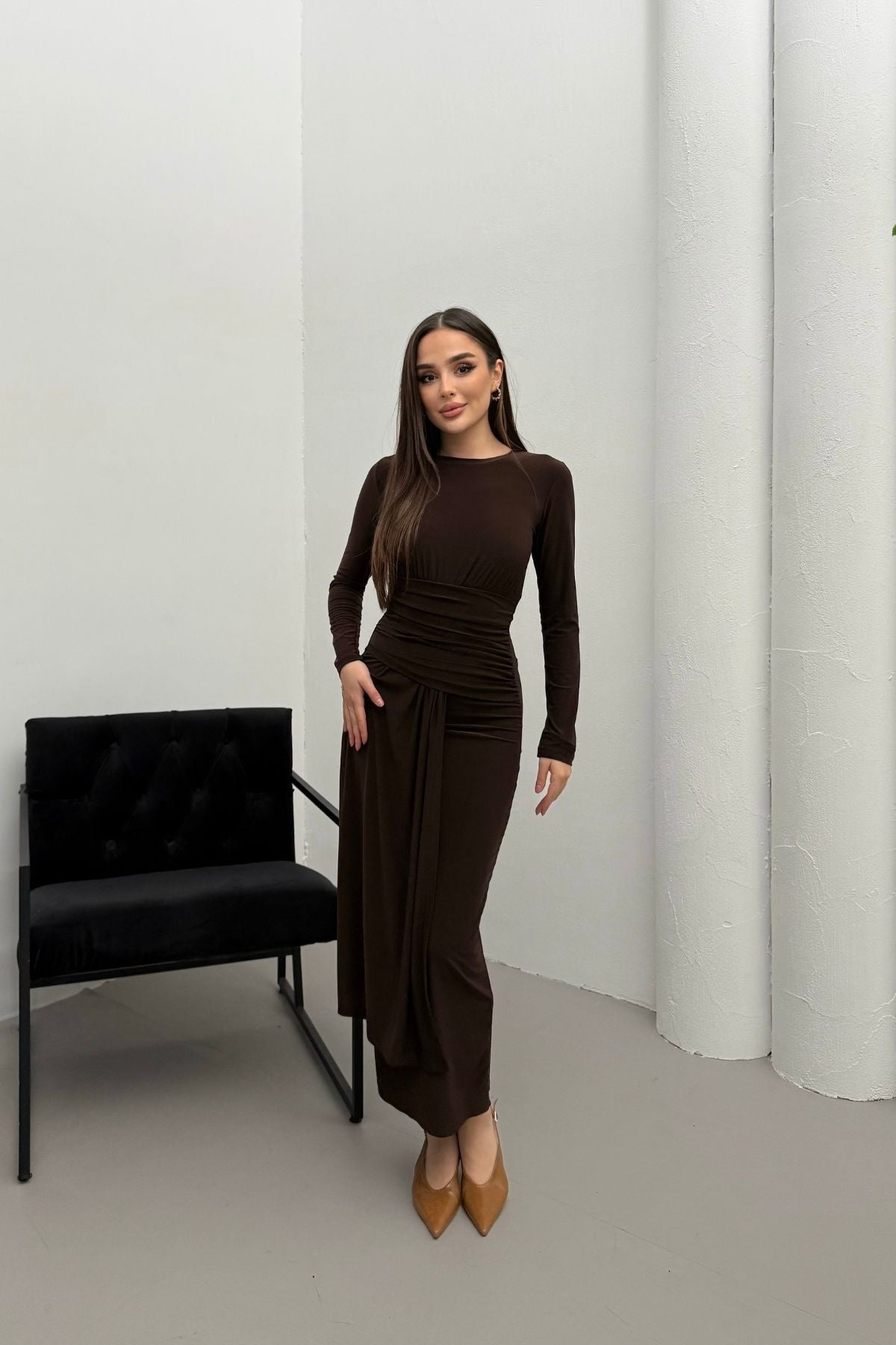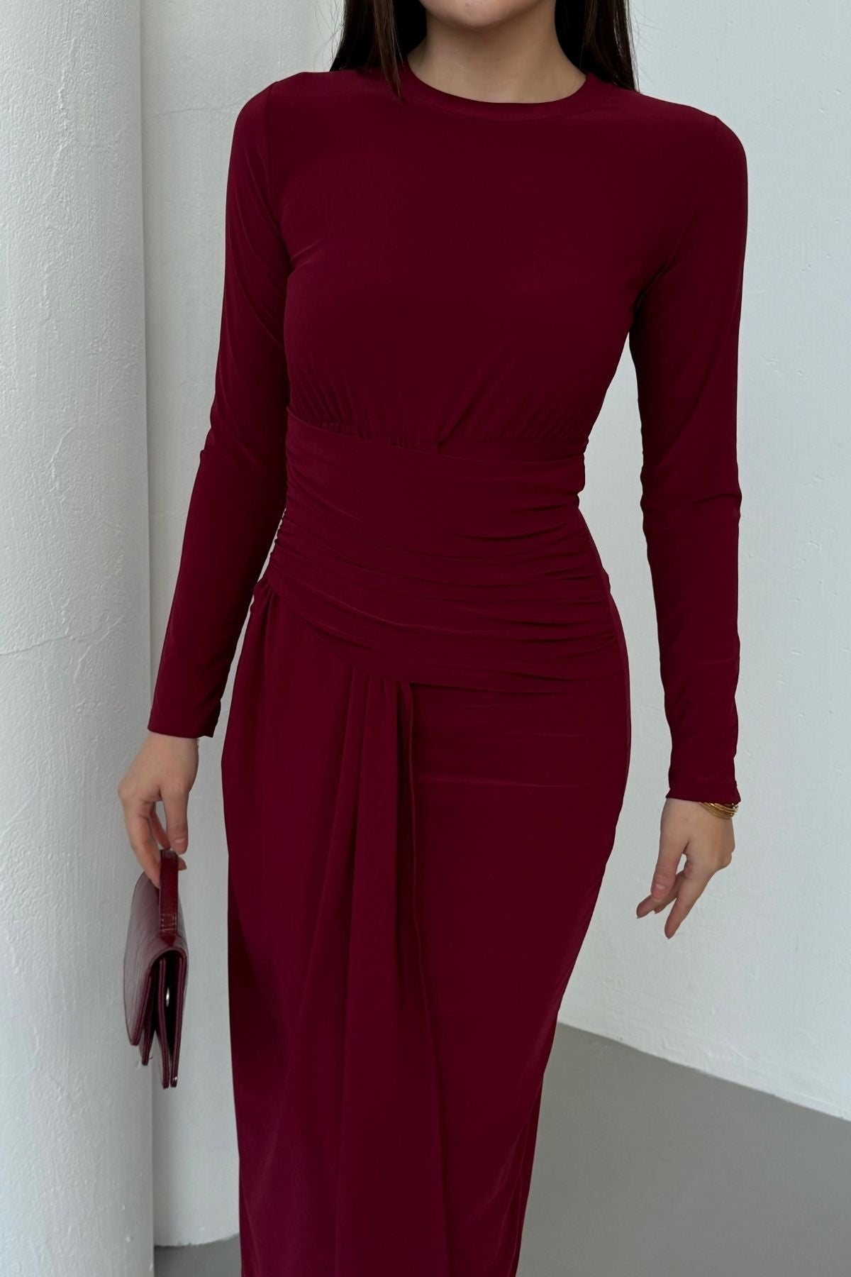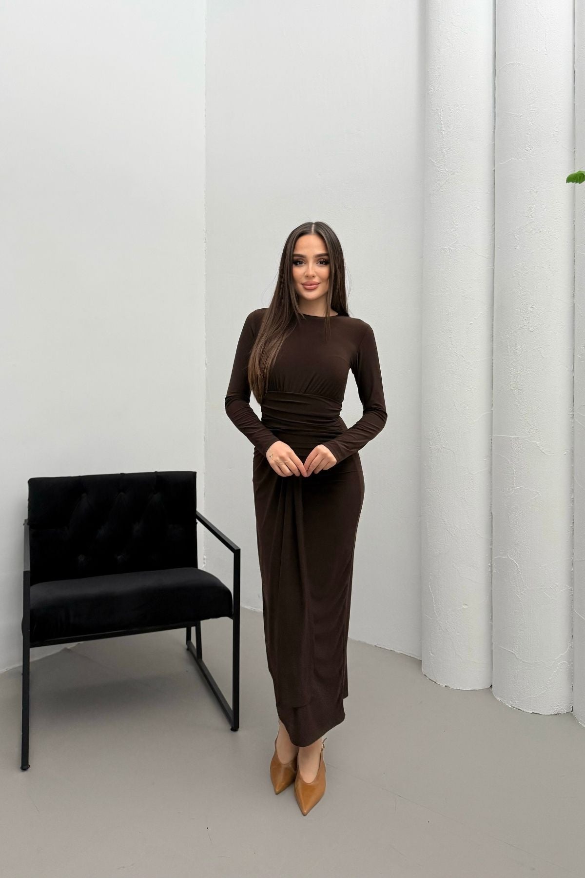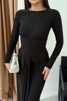 • Modern çizgileri ve iddialı duruşuyla öne çıkan bu elbise, Kadın Drapeli Uzun Kollu ön parça detay Büzgülü Detaylı Elbise • Vücudu saran formu, bel bölgesindeki drape tasarımıyla kusurları ustaca gizlerken, feminen bir siluet oluşturur.