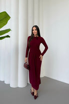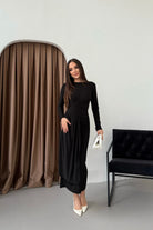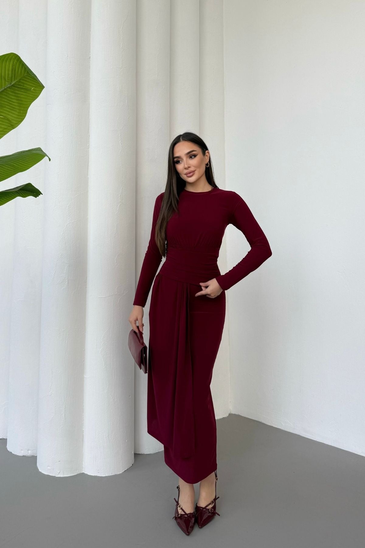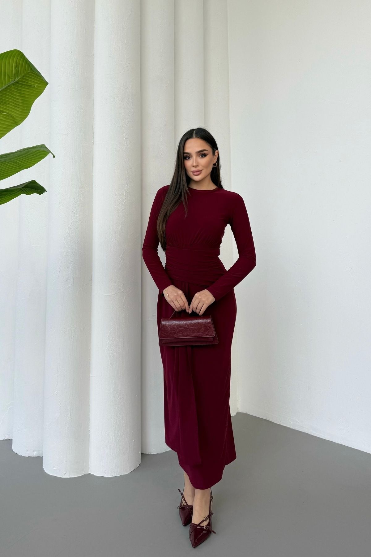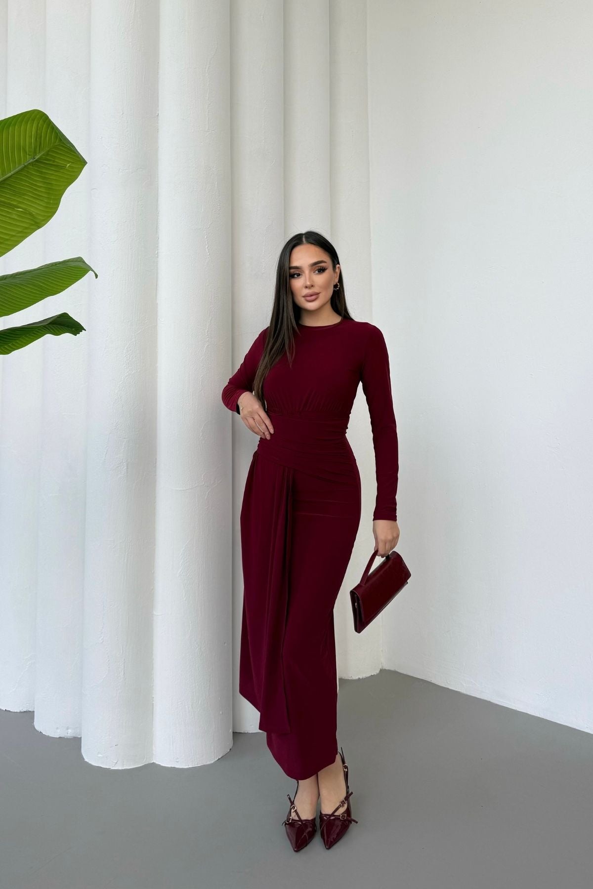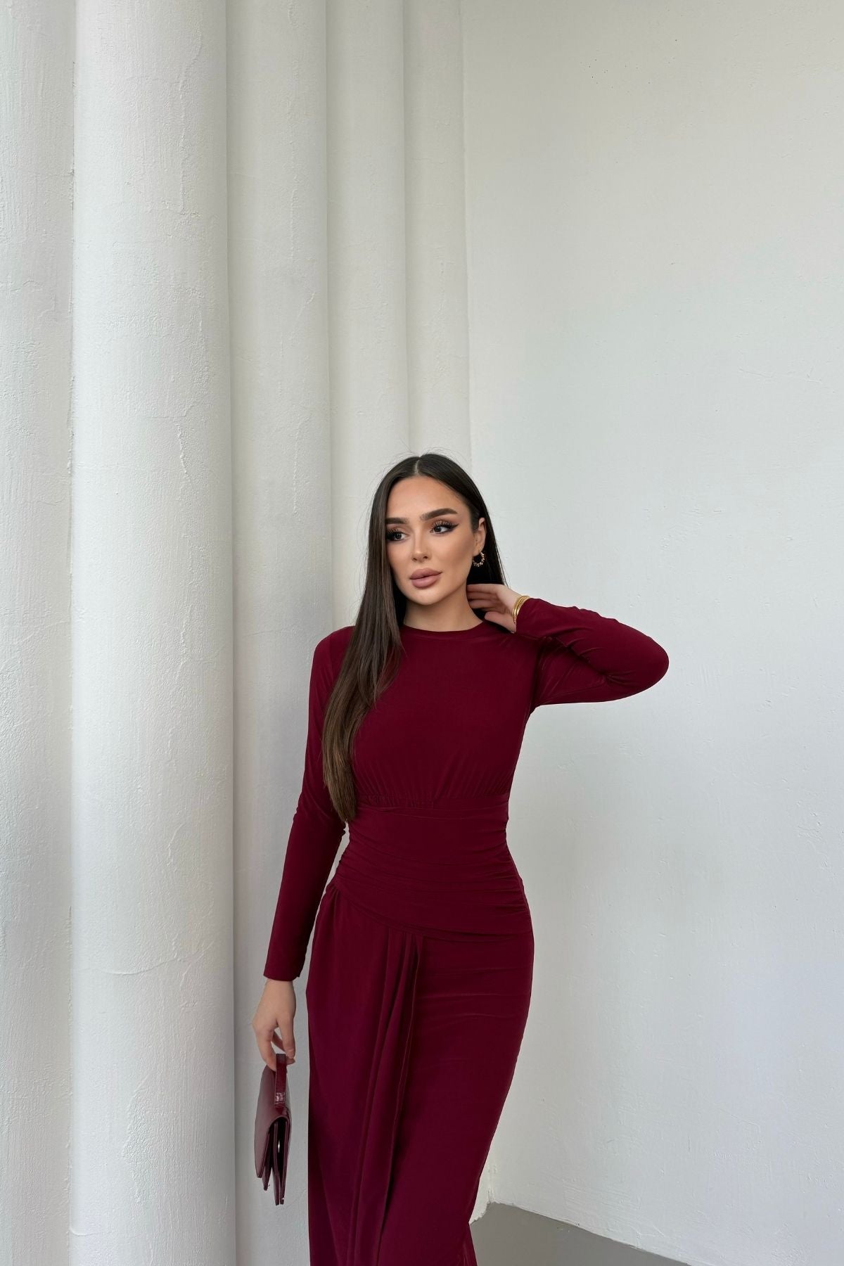 • Modern çizgileri ve iddialı duruşuyla öne çıkan bu elbise, Kadın Drapeli Uzun Kollu ön parça detay Büzgülü Detaylı Elbise • Vücudu saran formu, bel bölgesindeki drape tasarımıyla kusurları ustaca gizlerken, feminen bir siluet oluşturur.