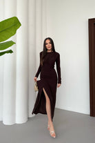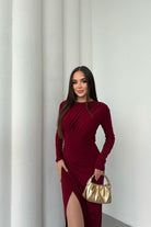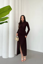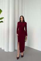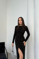 • Modern çizgileri ve iddialı duruşuyla öne çıkan bu elbise, Kadın Drapeli Uzun Kollu ön yırtmaç detay Büzgülü Detaylı Elbise • Vücudu saran formu, bel bölgesindeki drape tasarımıyla kusurları ustaca gizlerken, feminen bir siluet oluşturur.