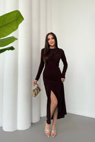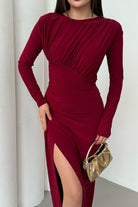 Kadın Drapeli Uzun Kollu Yırtmaç Detaylı Büzgülü Elbise