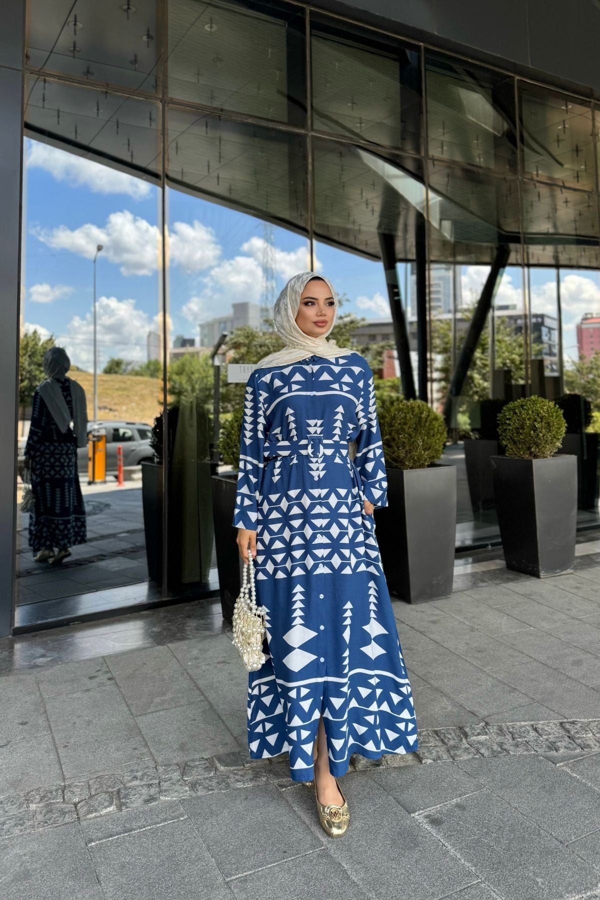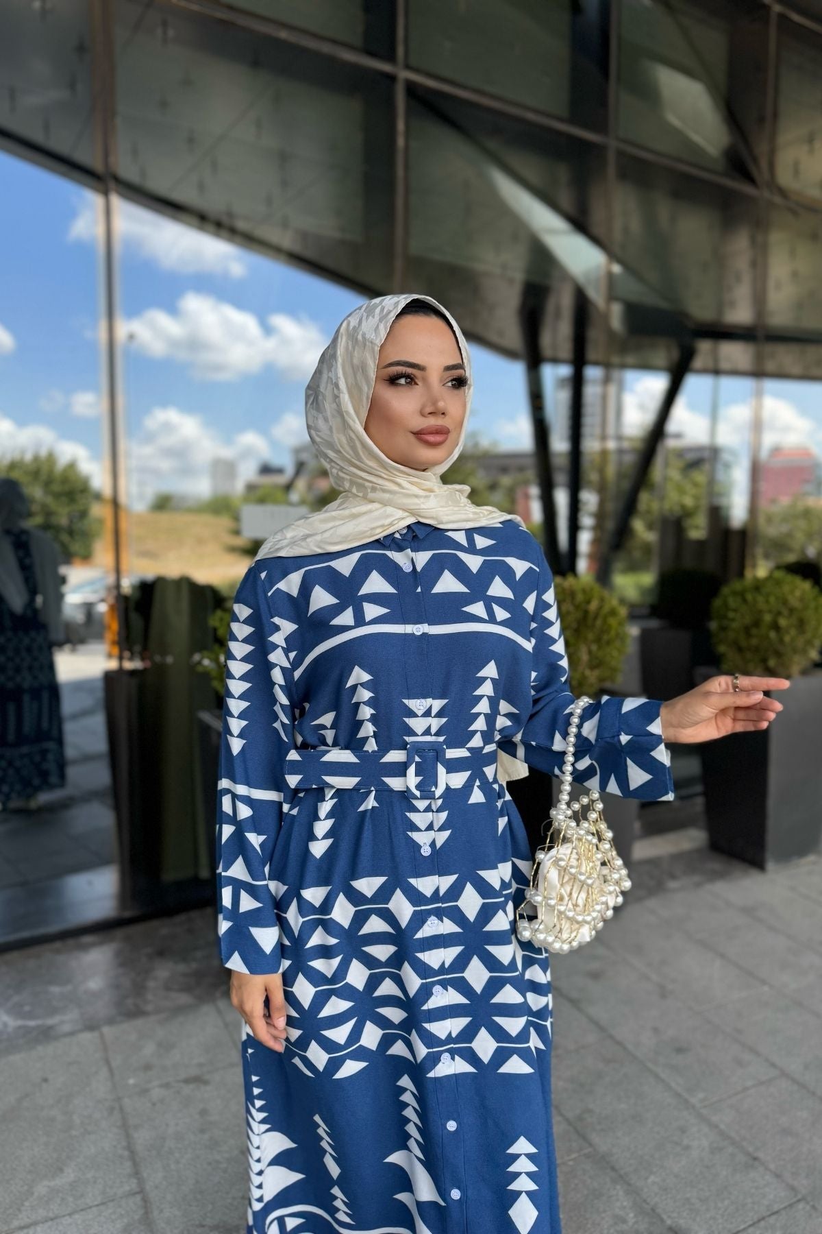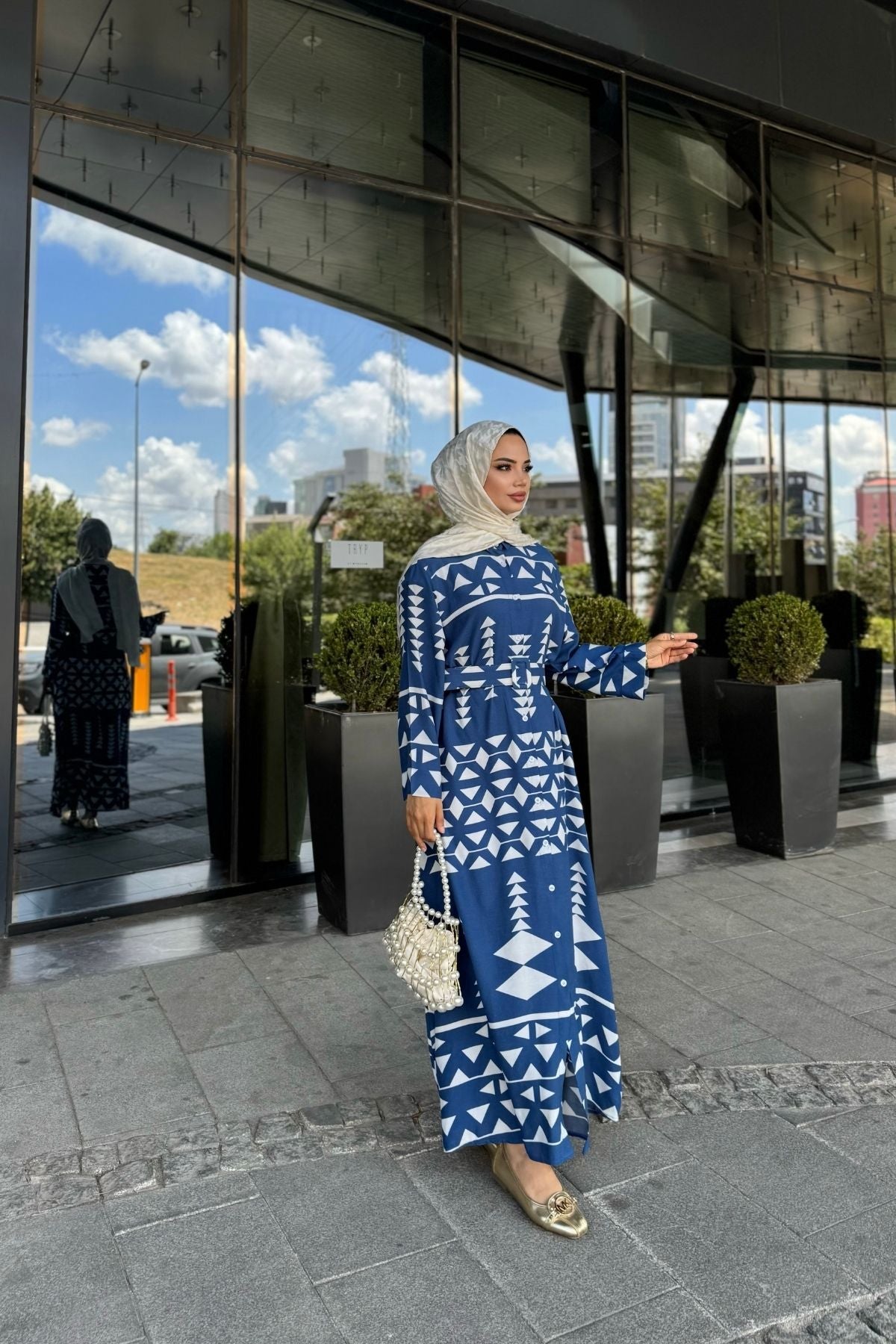 Kadın Etnik Desenli Mavi Uzun Kol, Kemerli Cepli, Uzun Viskon Gömlek Elbise