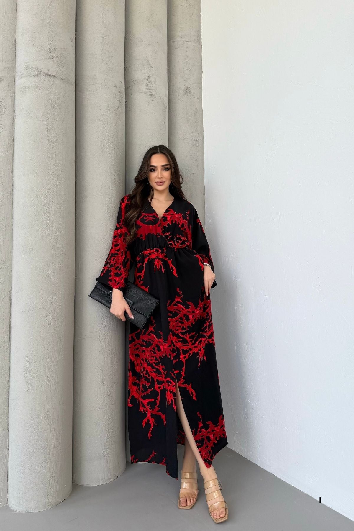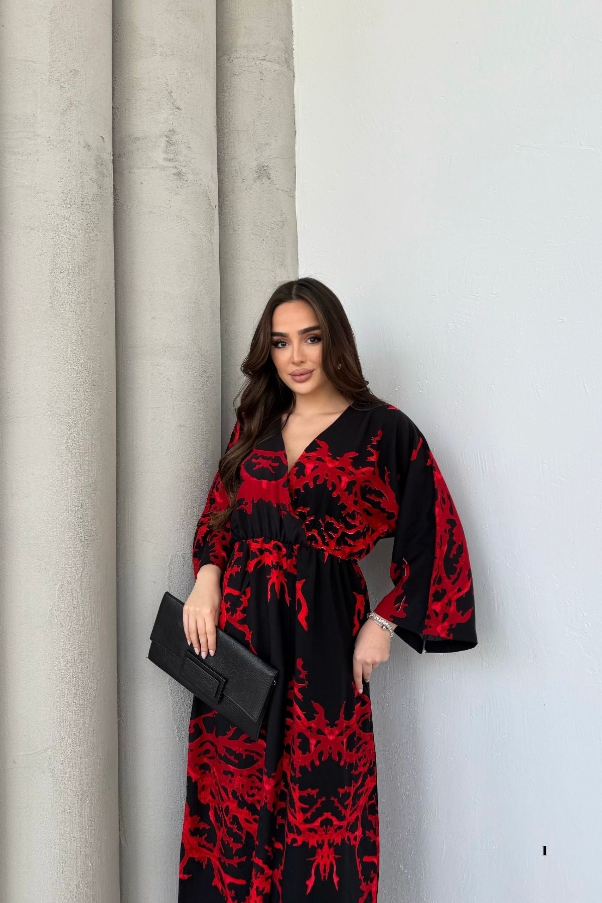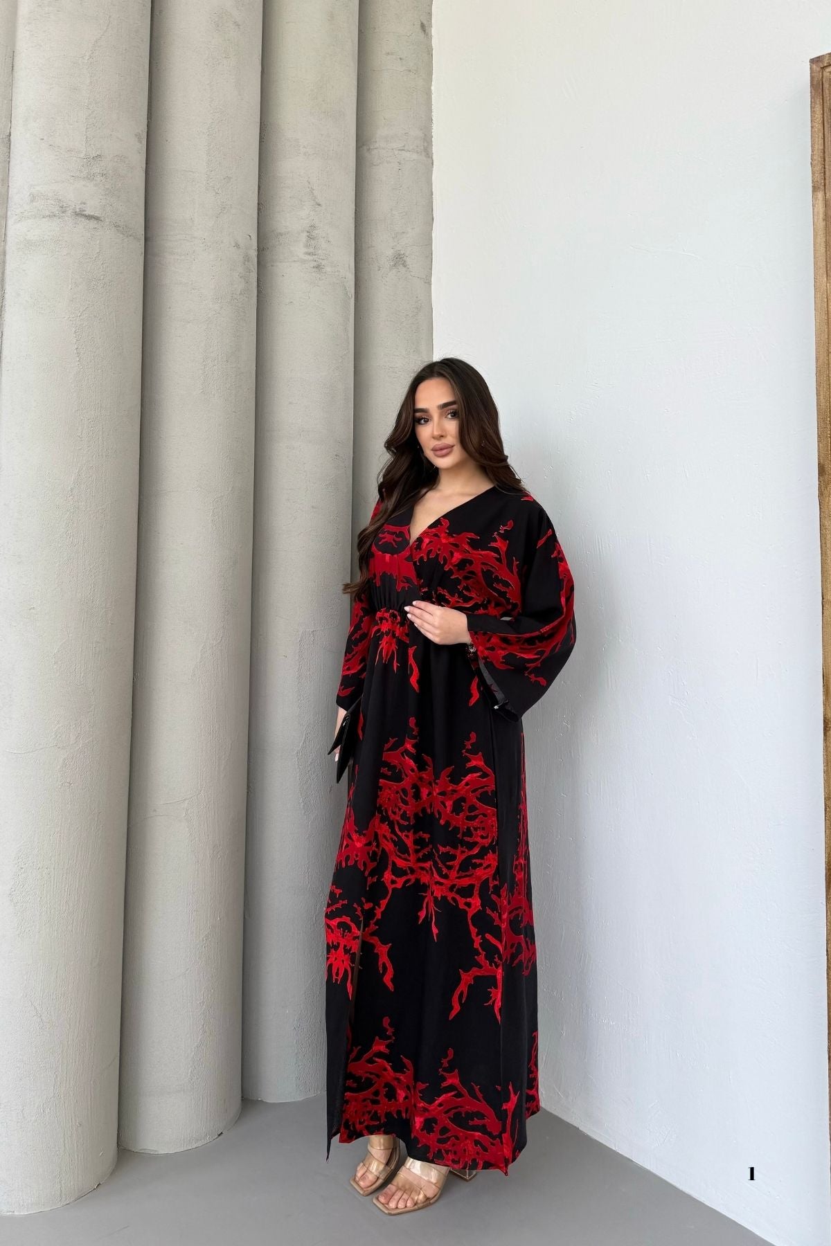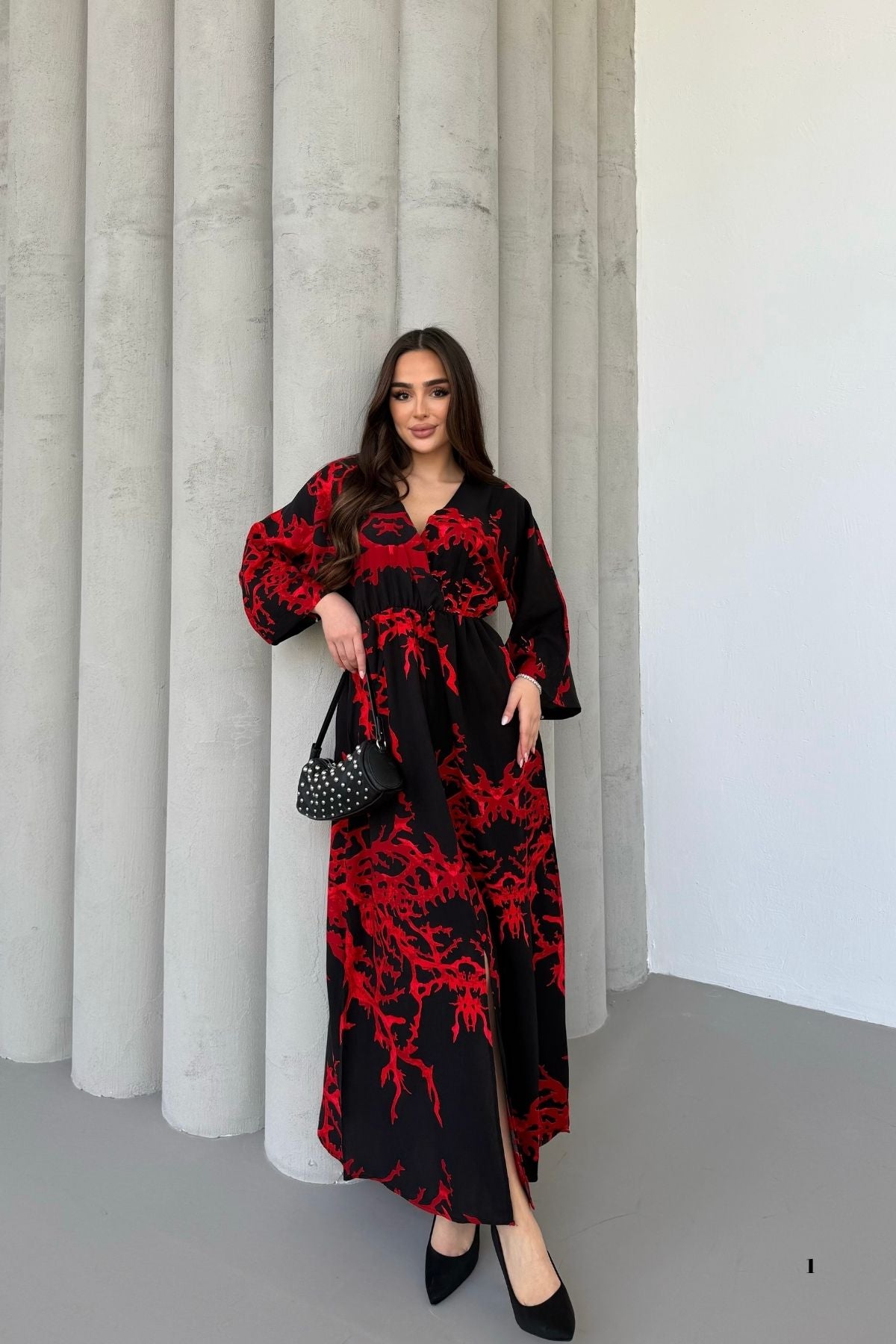 Kadın Kırmızı Dal Desenli Beli Lastikli Uzun Yırtmaçlı Kruvaze Elbise