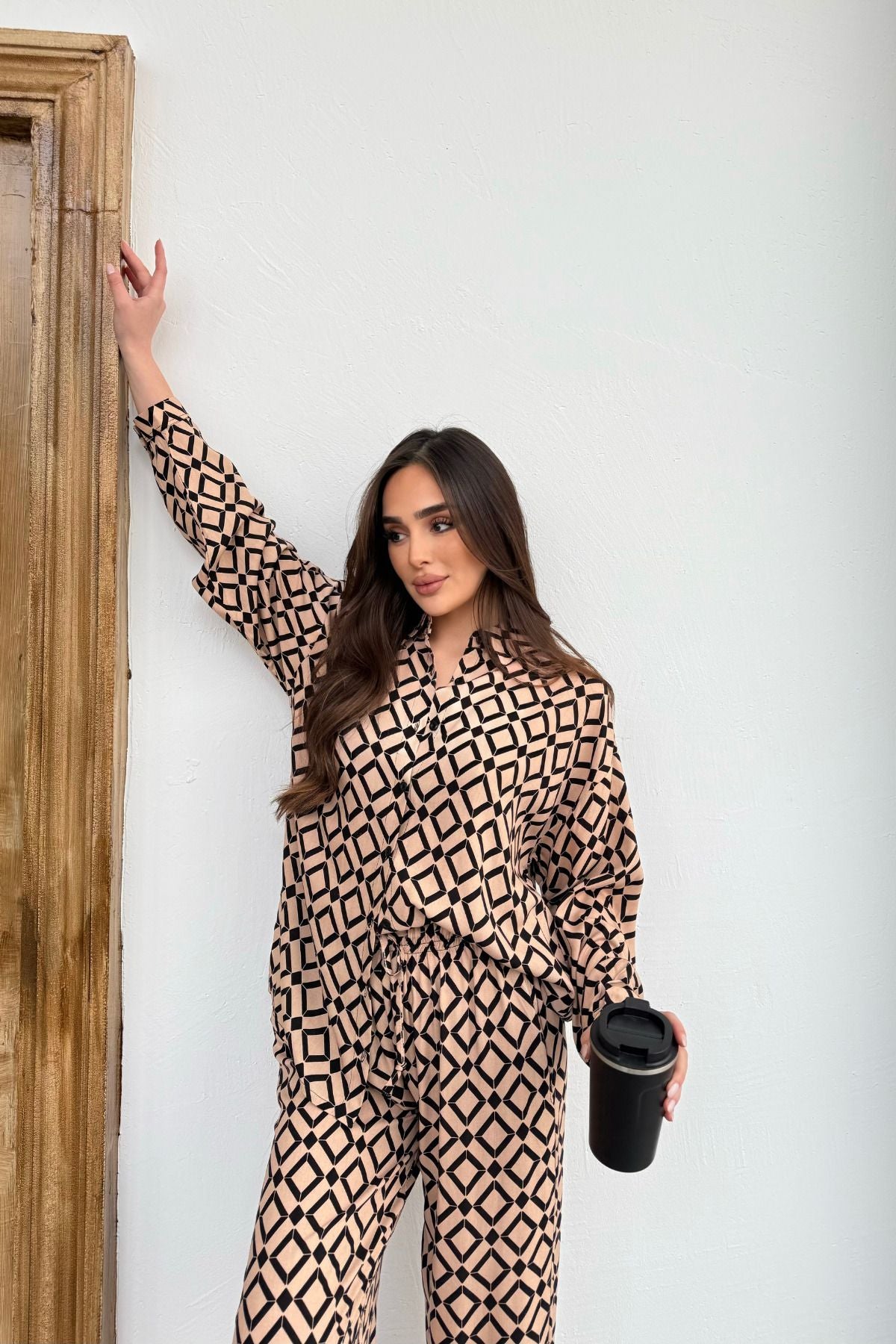 Kadın Krem Siyah Desenli Rahat Kalıp Keten Alt Üst Takım