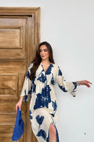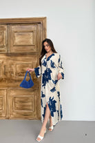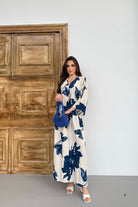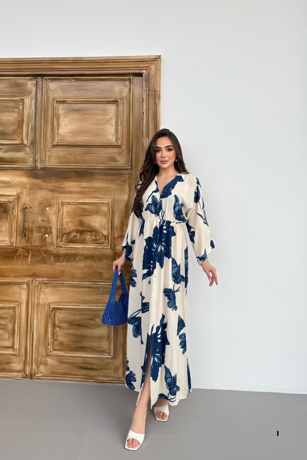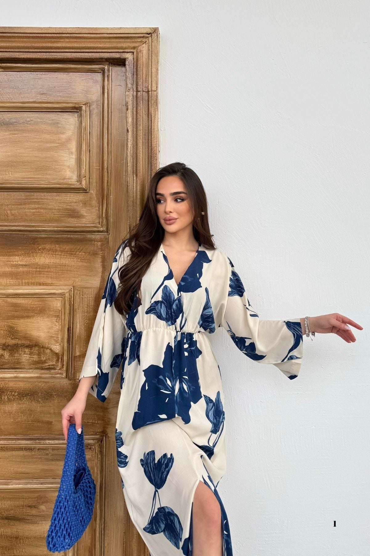 Kadın Mavi Beyaz Çiçek Desenli Beli Lastikli Uzun Yırtmaçlı Kruvaze Elbise