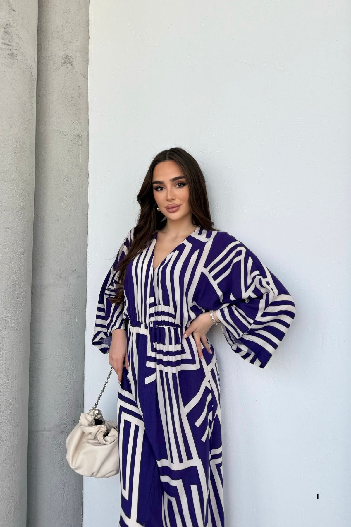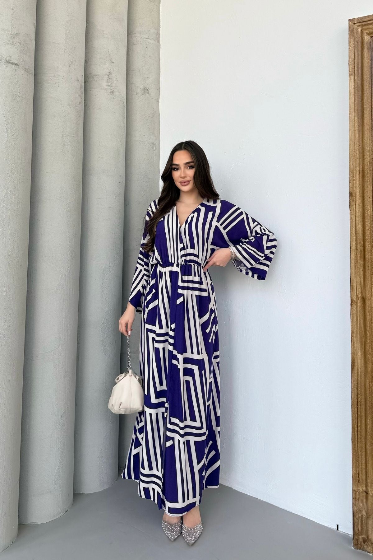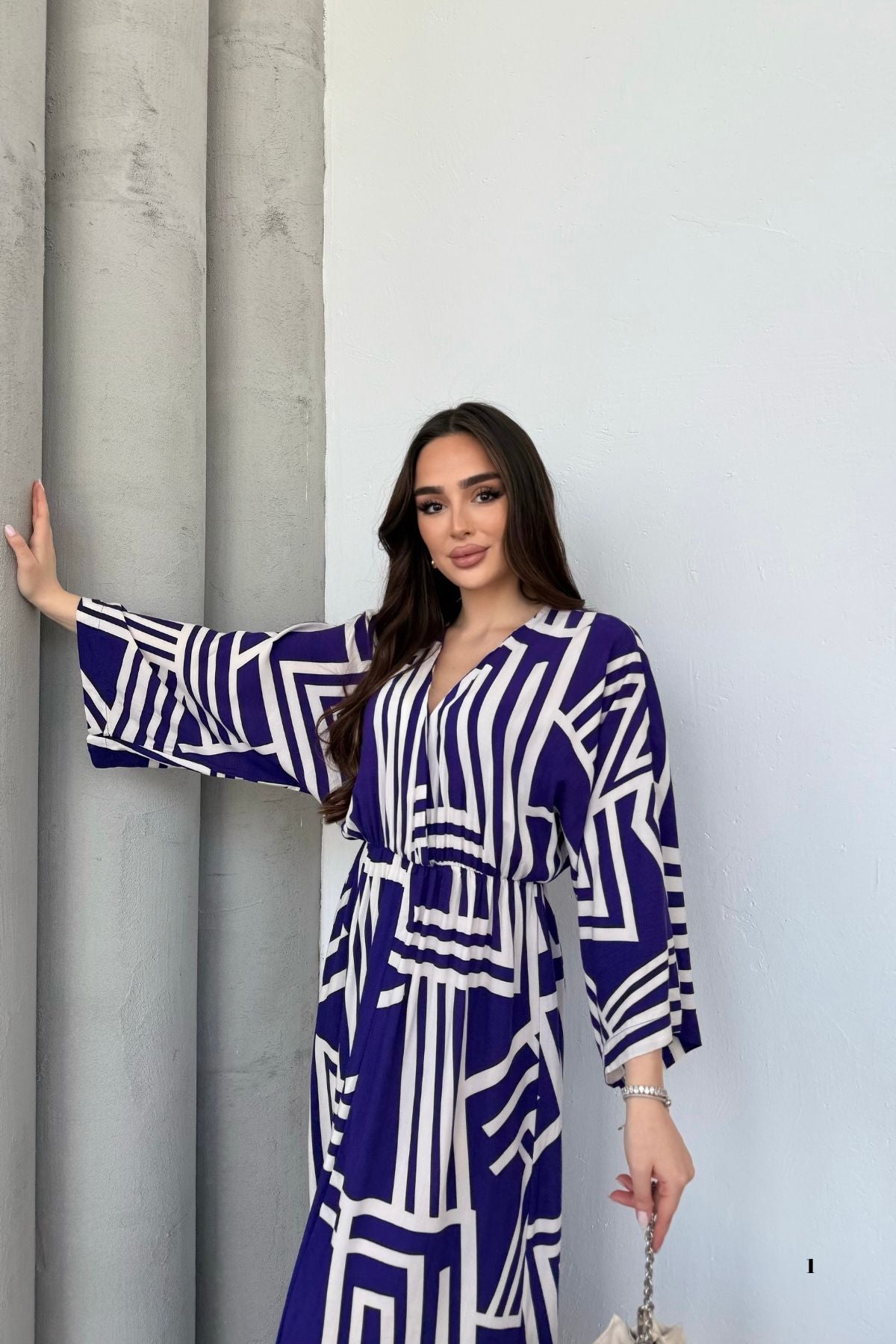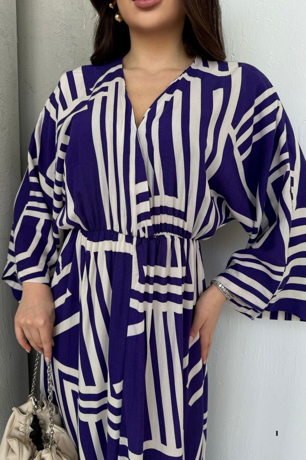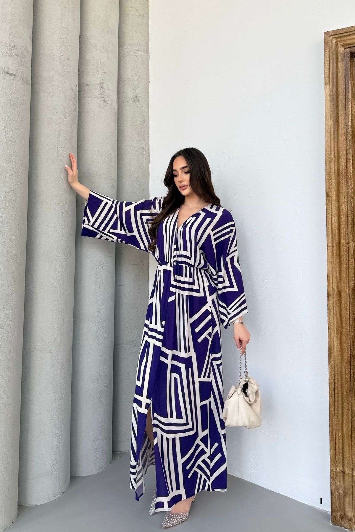 Kadın Mavi Geometri Desenli Beli Lastikli Uzun Yırtmaçlı Kruvaze Elbise