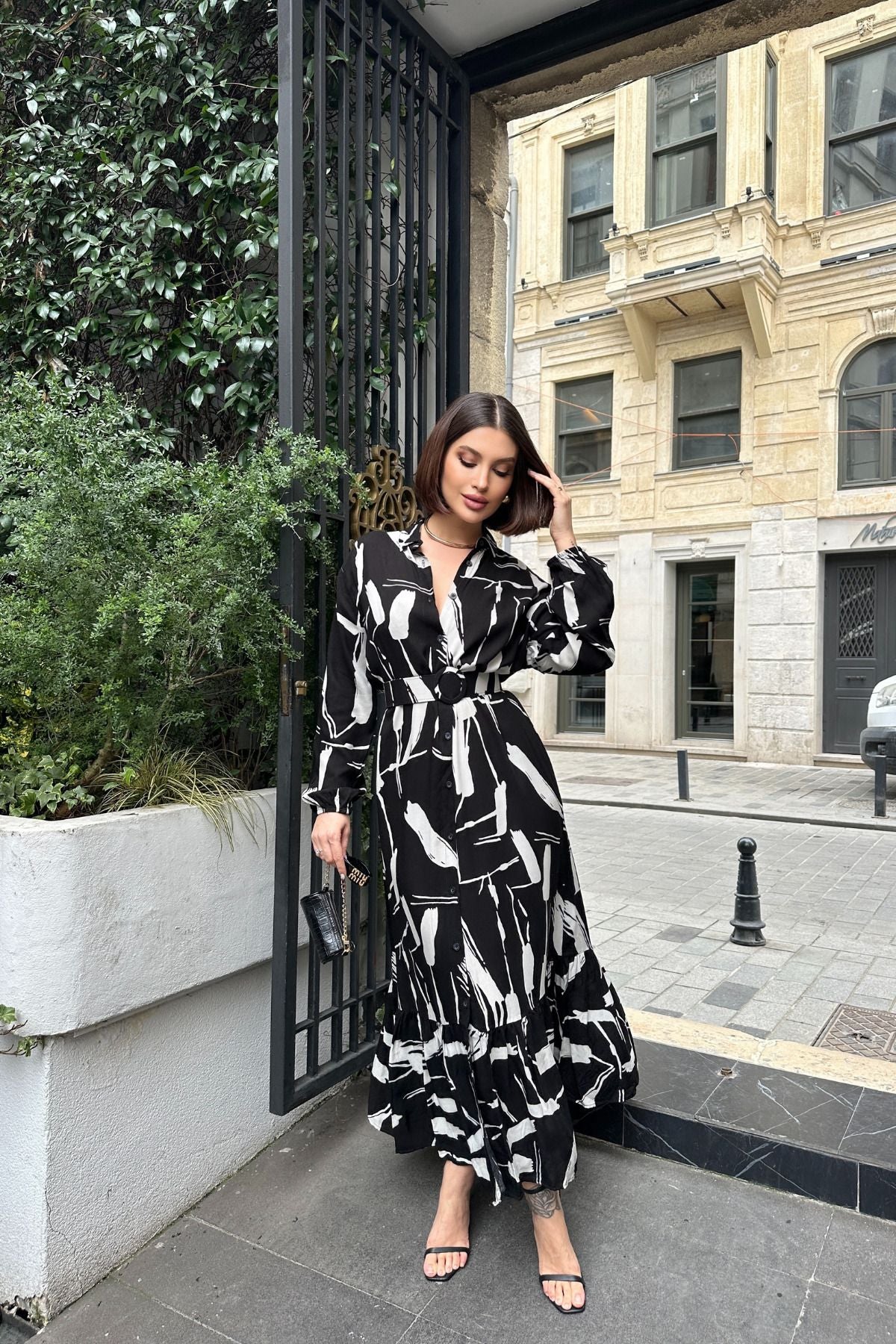 Kadın Siyah & Beyaz Uzun Kol, Kemerli, Yırtmaçlı, Uzun Viskon Gömlek Elbise