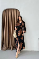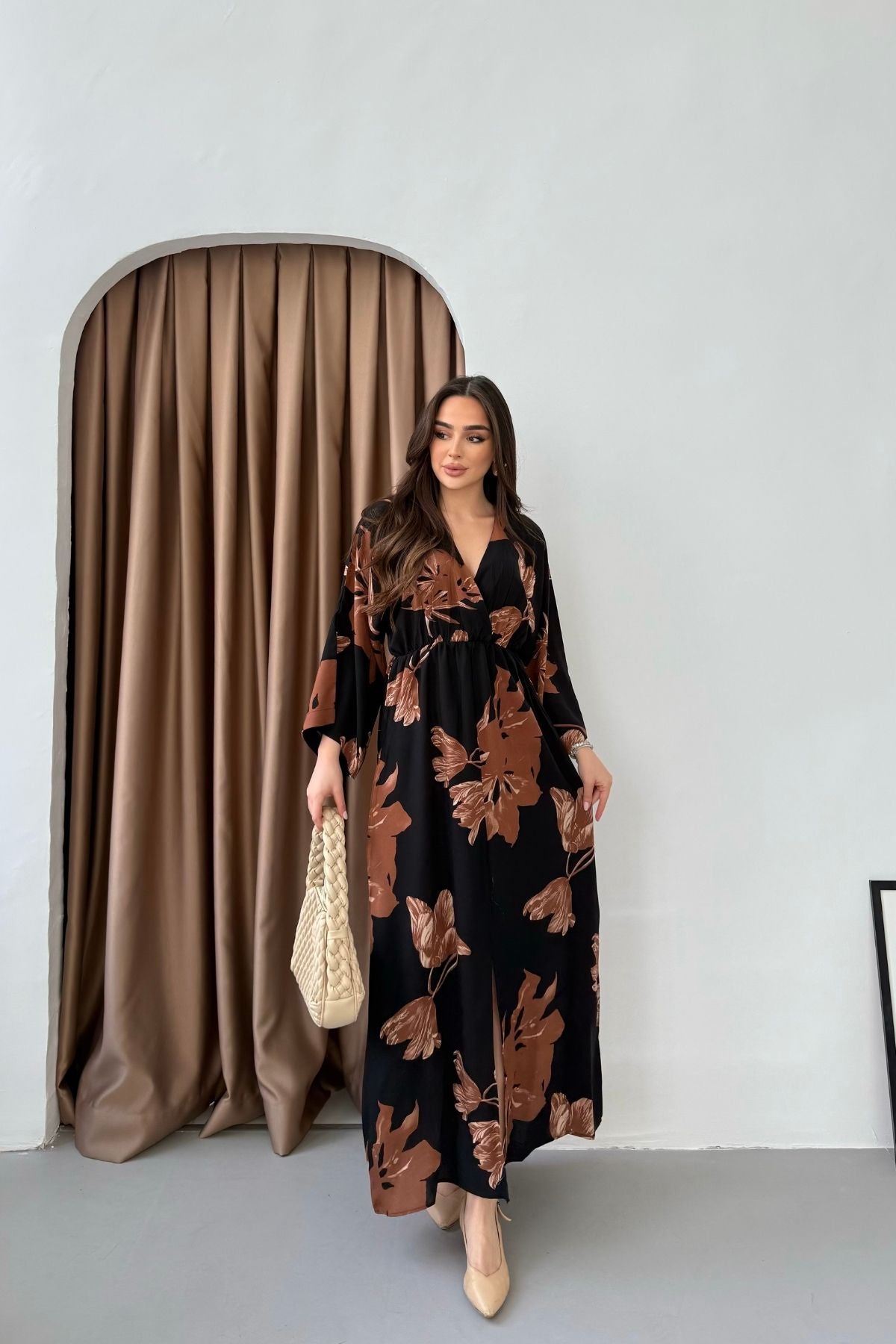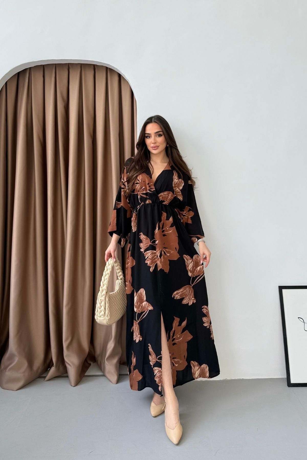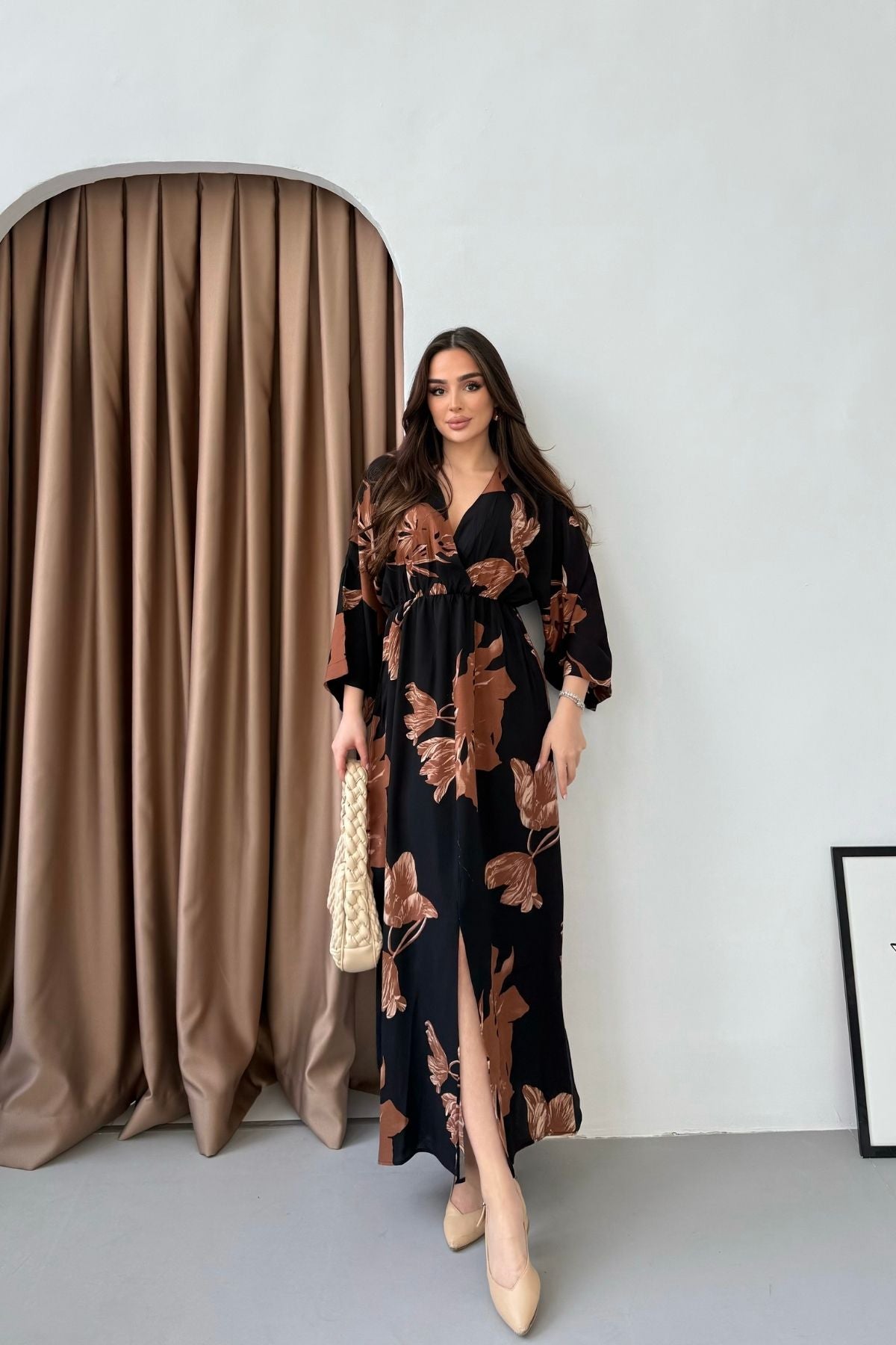 Kadın Siyah Çiçek Desenli Beli Lastikli Uzun Yırtmaçlı Kruvaze Elbise