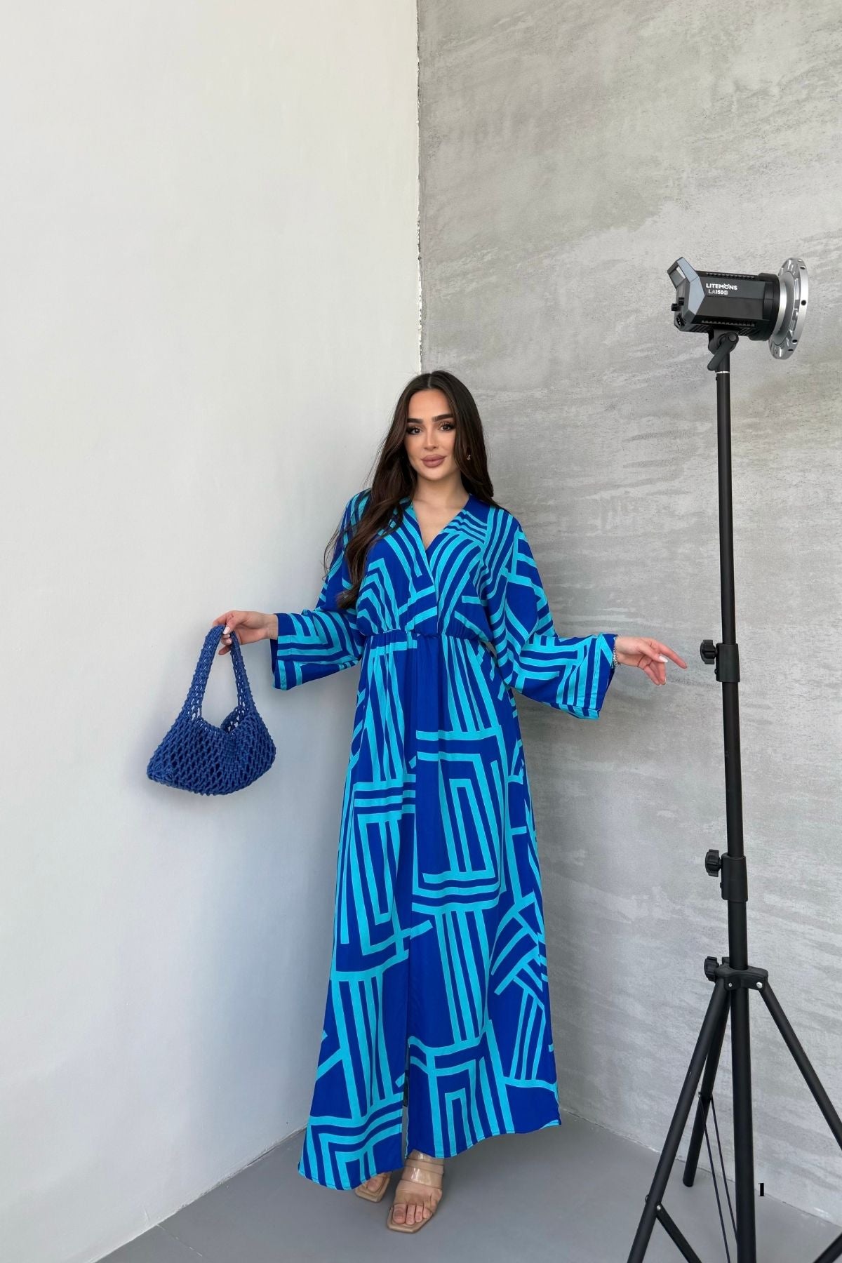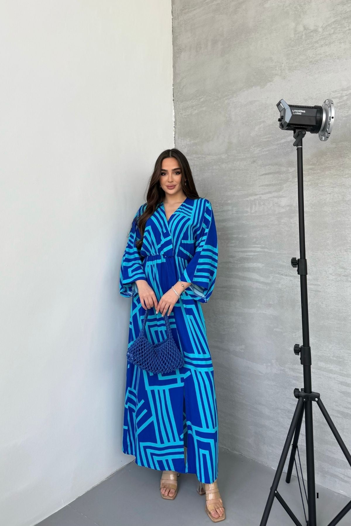 Kadın Turkuaz Geometri Desenli Beli Lastikli Uzun Yırtmaçlı Kruvaze Elbise