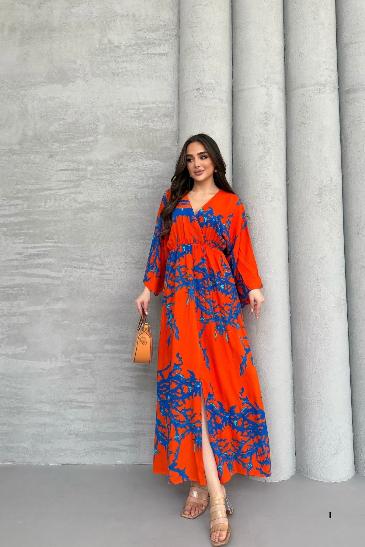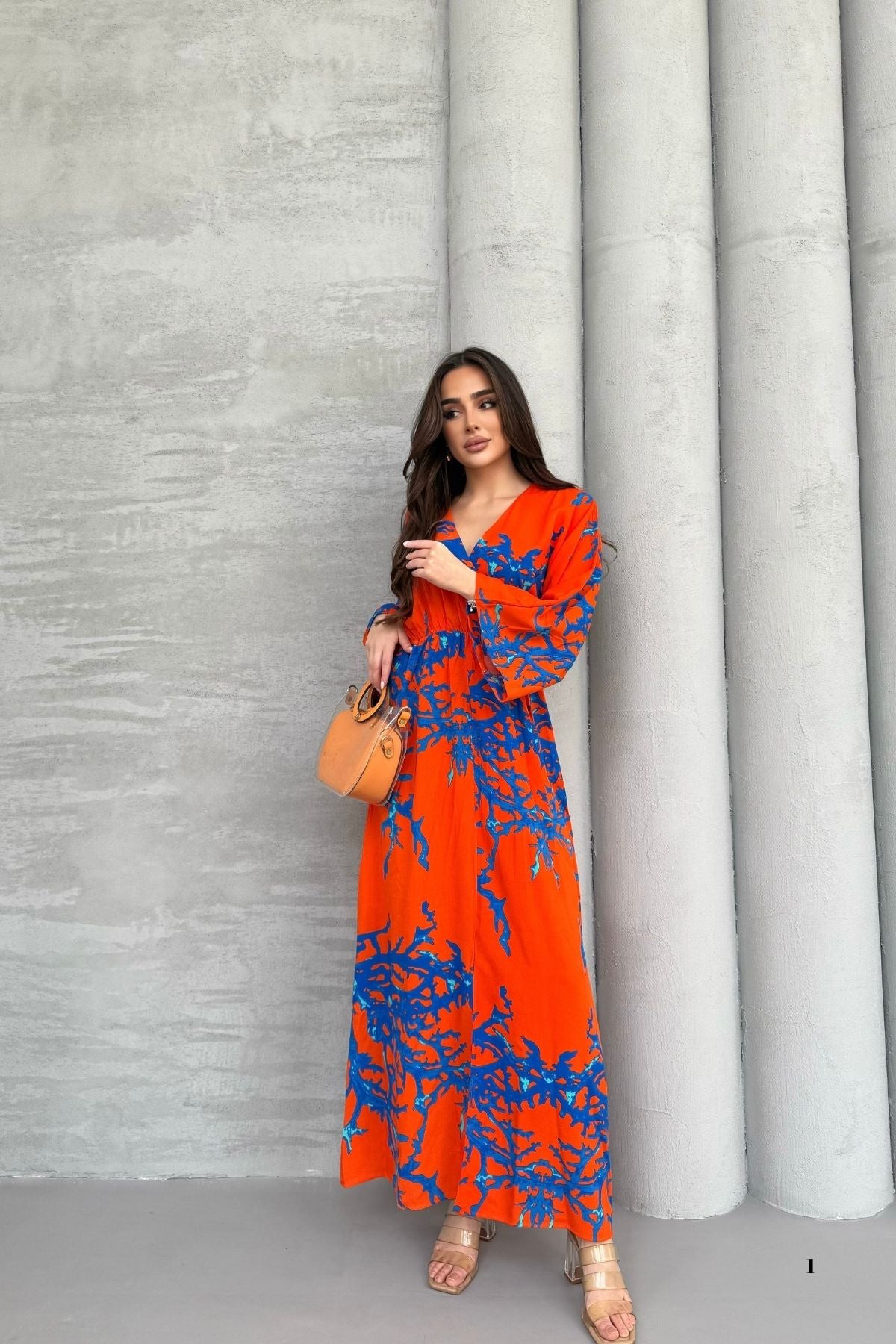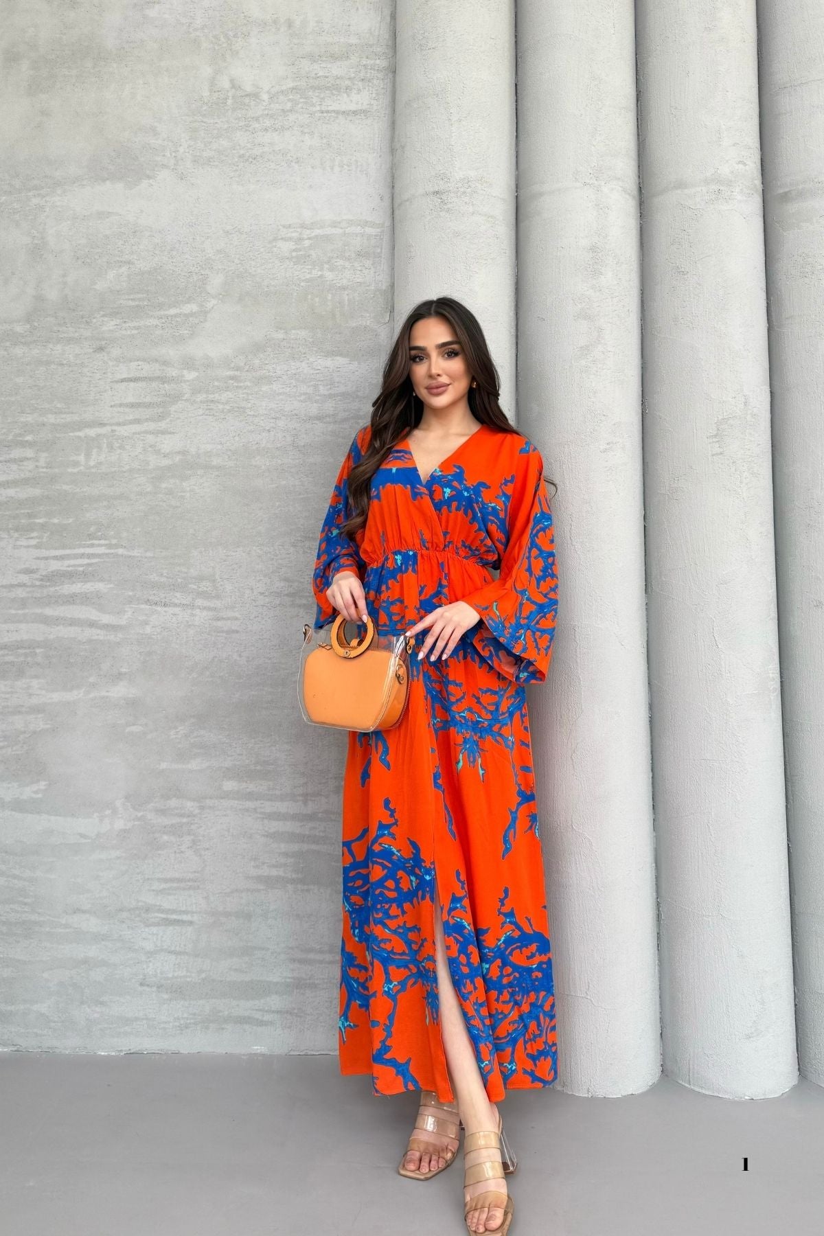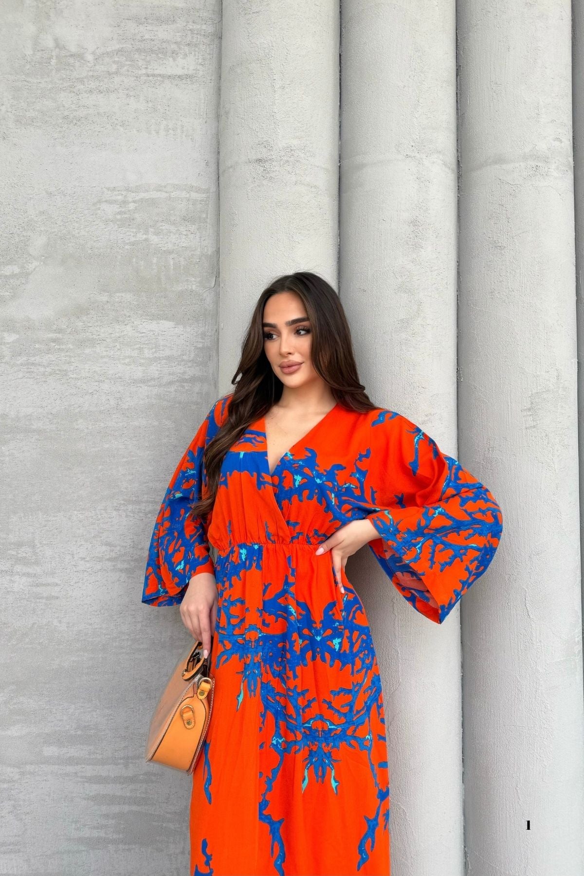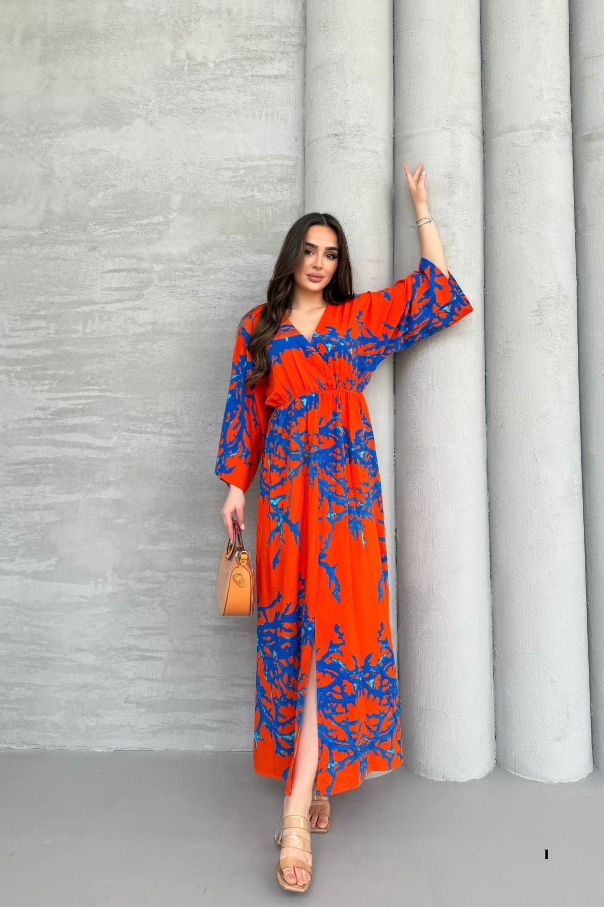 Kadın Turuncu Dal Desenli Beli Lastikli Uzun Yırtmaçlı Kruvaze Elbise