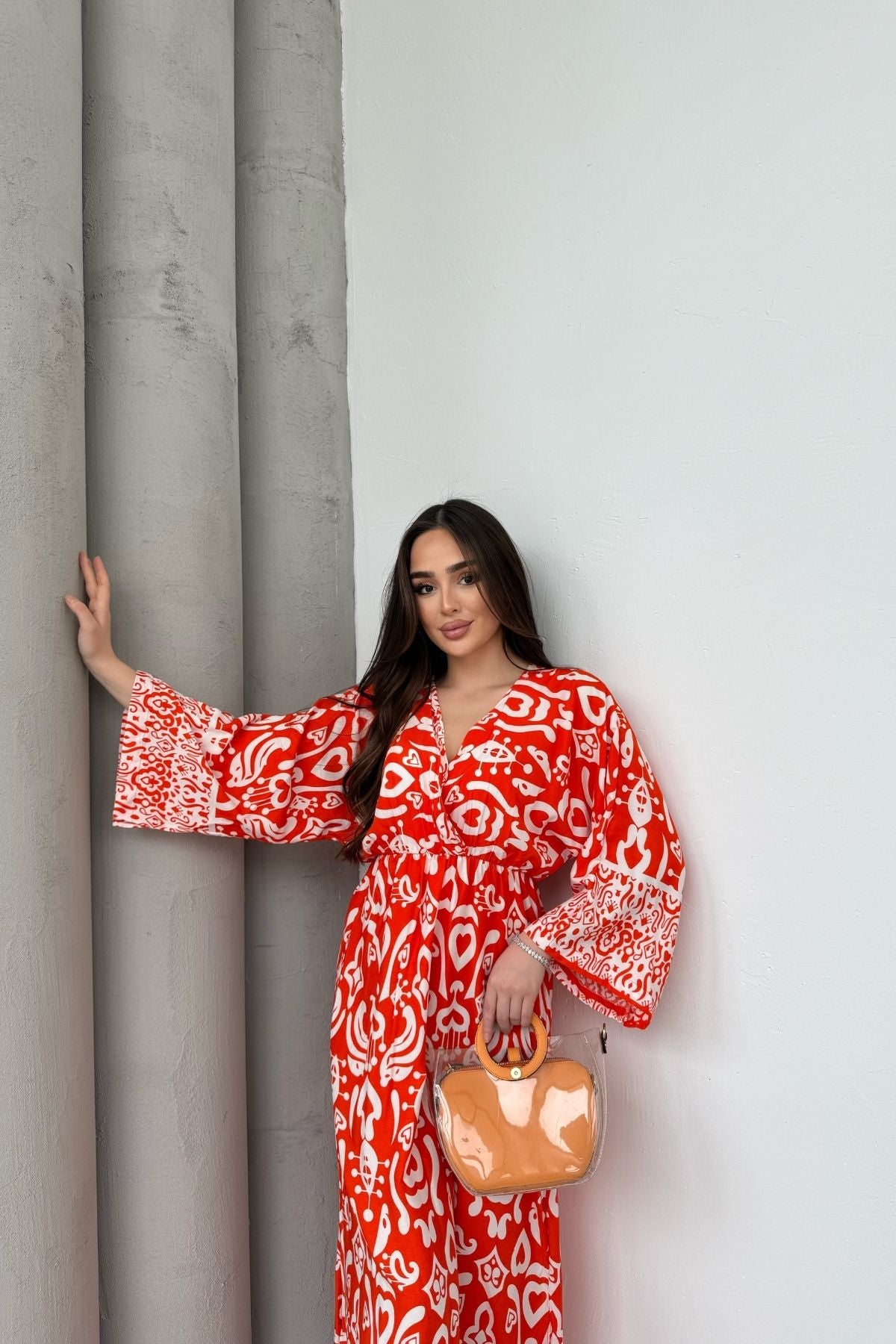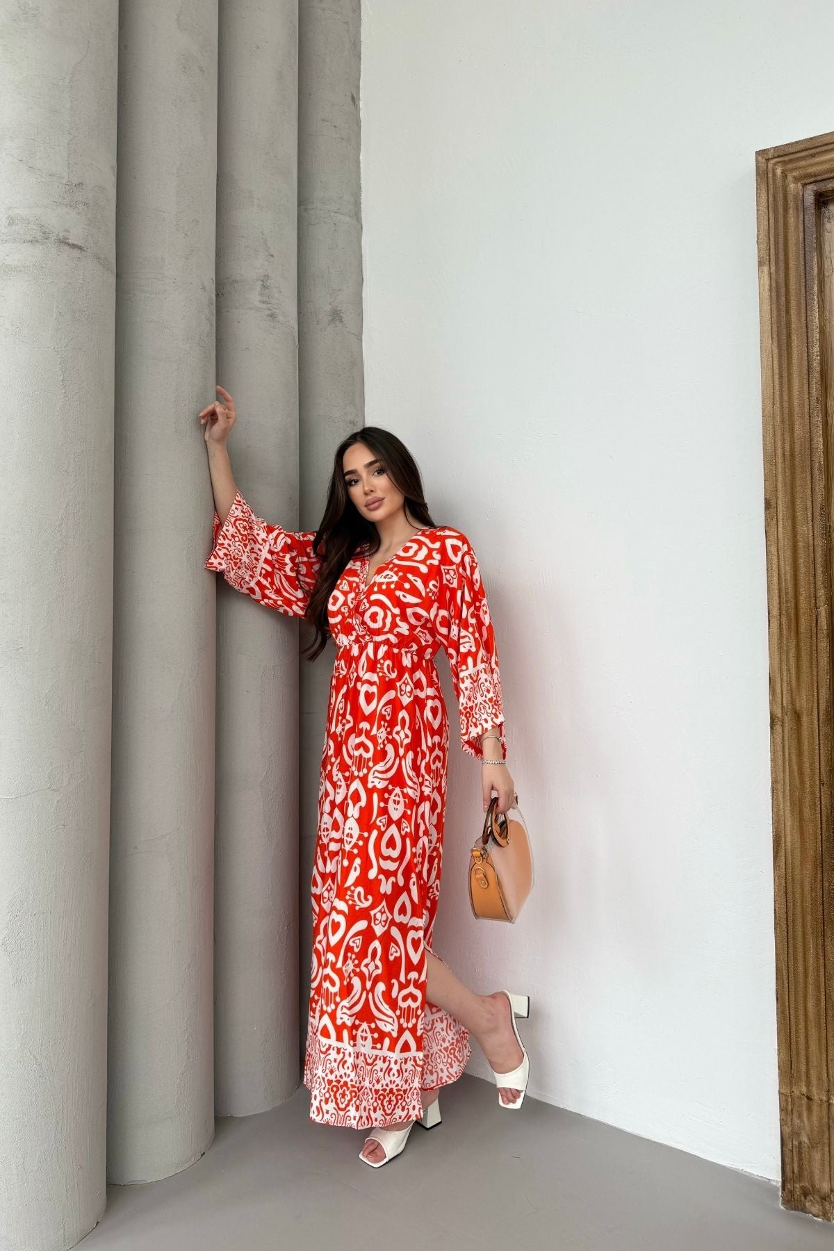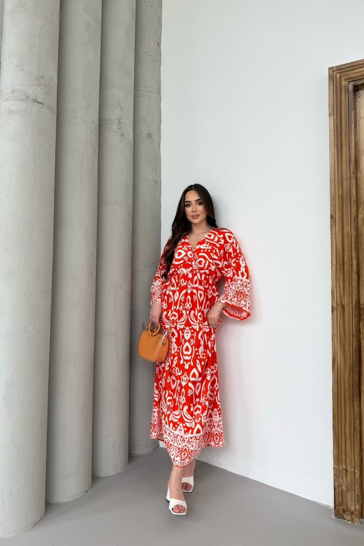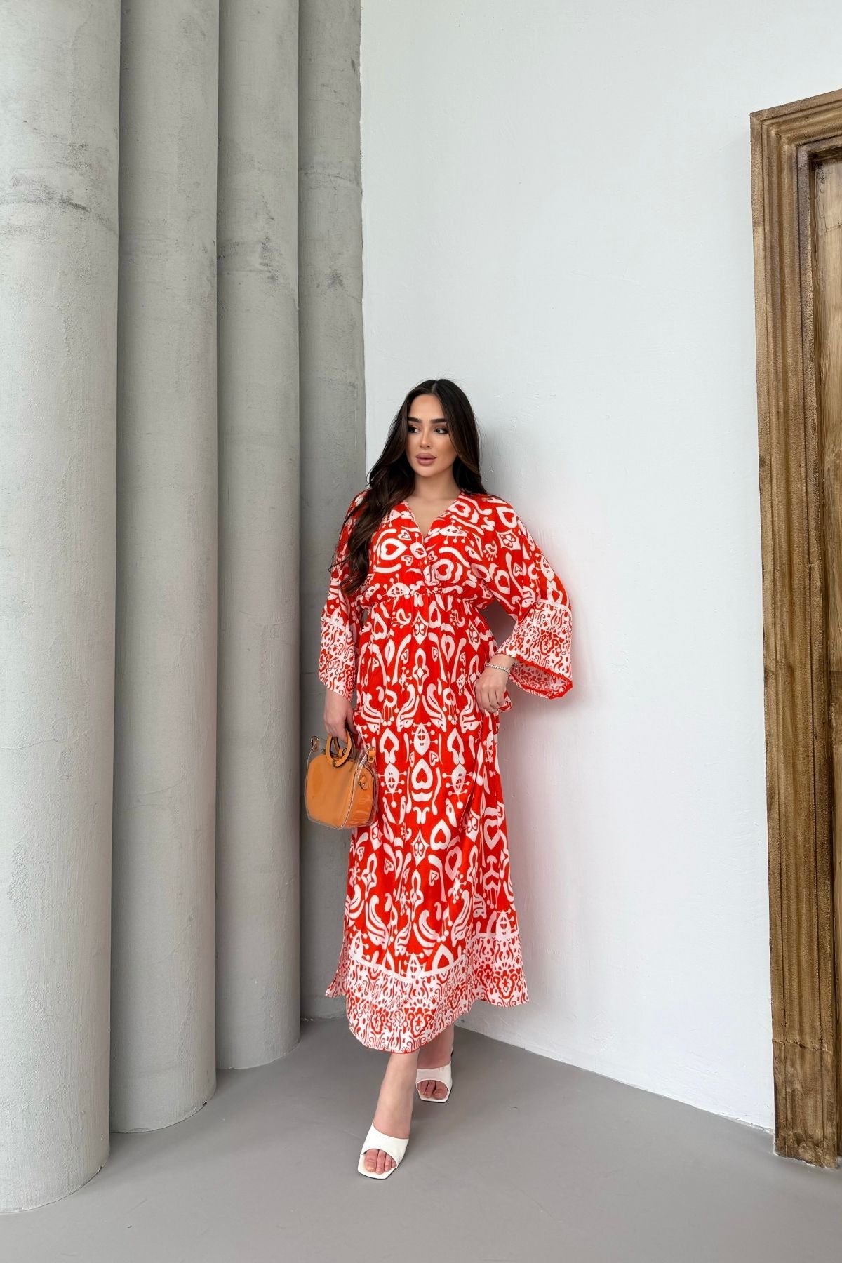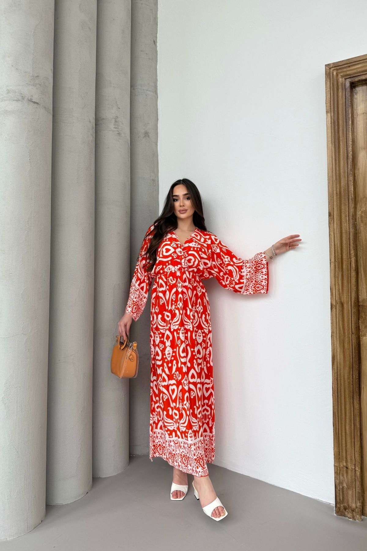 Kadın Turuncu V Yaka Beli Lastikli Geniş Kollu Uzun Pamuk Viskon Elbise
