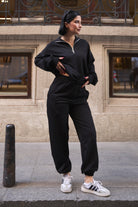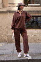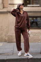 Tam kalıptır. (Kendi bedeninizi tercih edebilirsiniz.) Yarım fermuarlı yaka detayıyla spor ve şıklığı bir arada sunan kadın ikili eşofman takımı, iki iplik compact penye likralı kumaştan üretilmiştir. Yumuşak dokusu, esnek yapısı ve nefes alabilen kumaşı sayesinde gün boyu rahatlık sağlar.