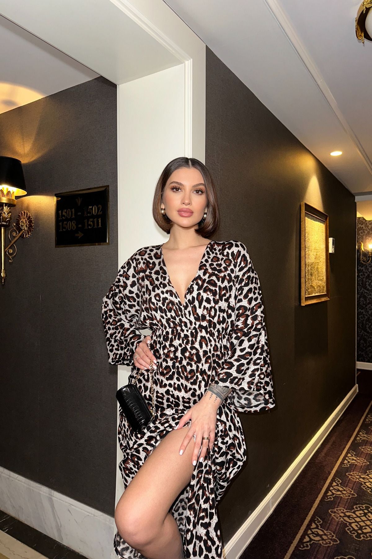 Leopar Desenli Kruvaze Yaka Uzun Kadın Elbise