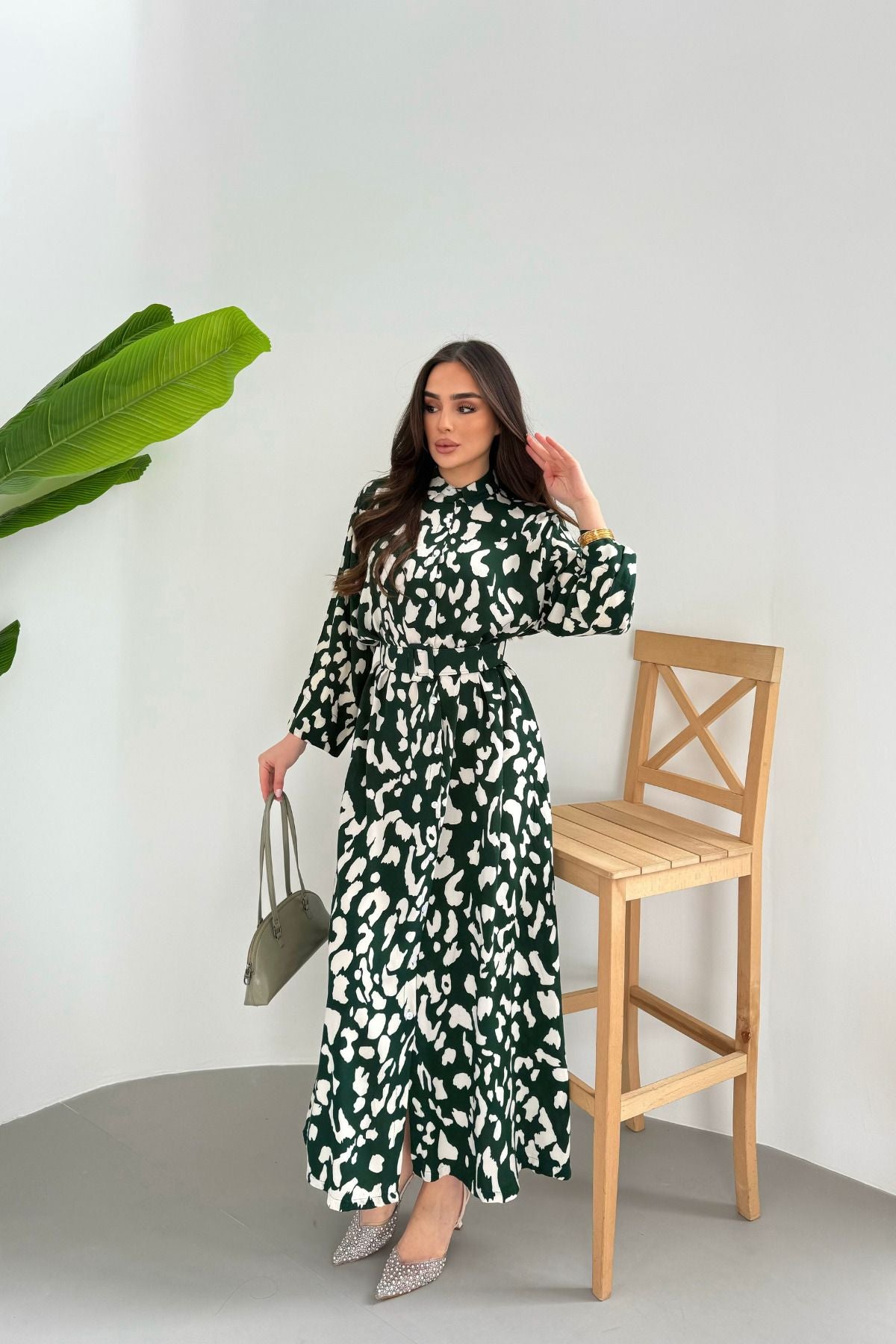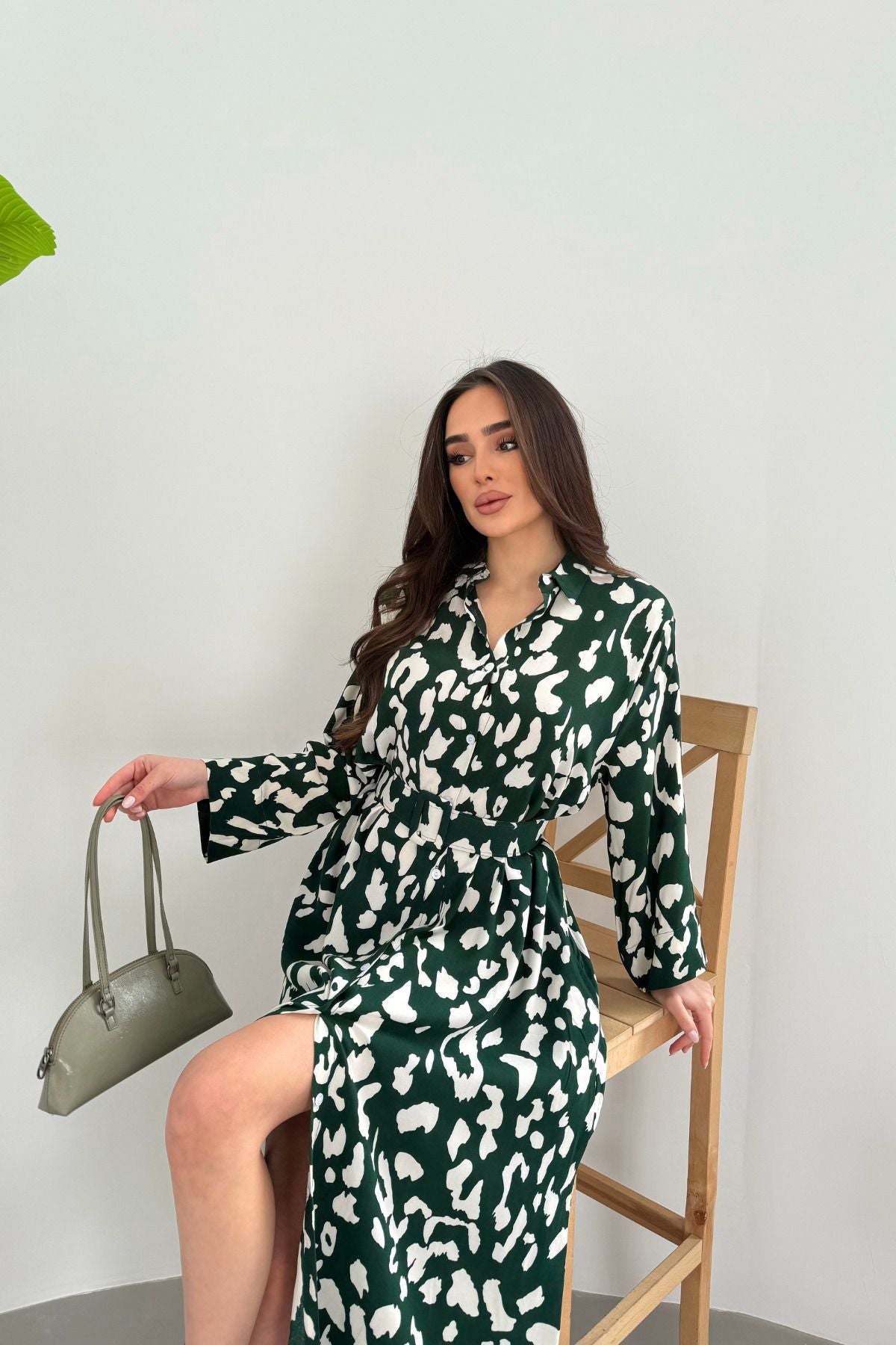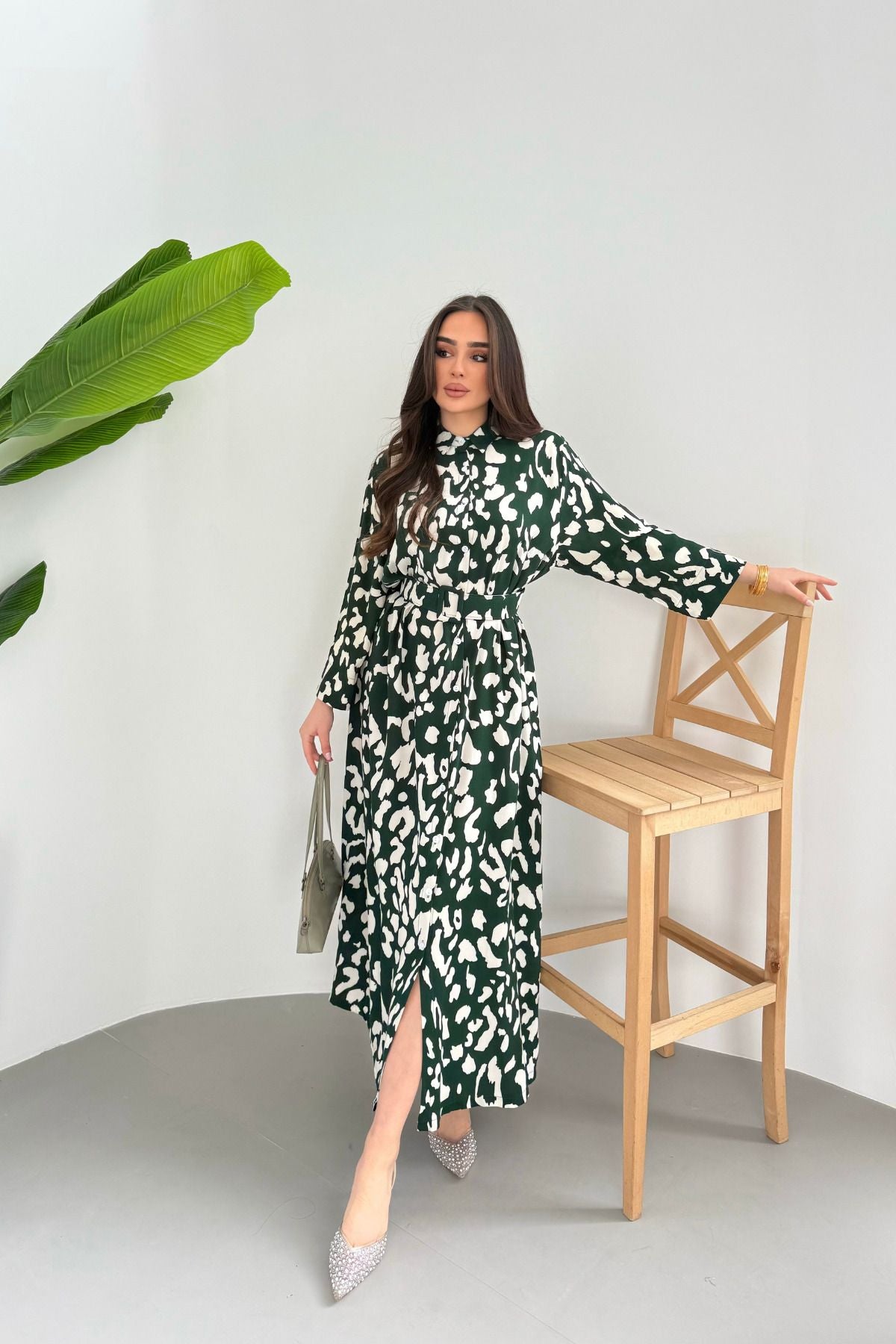- Yeşil Beyaz desenleriyle göz alıcı bir görünüm sunan bu elbise, yaz aylarının enerjisini stilinize taşıyor.; - Uzun kollu tasarımı ile mevsimin sıcak günlerinde serinlik ve şıklığı bir arada sunuyor.; - Beli kemerli yapısı sayesinde vücut hatlarınıza mükemmel uyum sağlayarak feminen bir siluet oluşturmanızı sağlıyor.; - Önden yırtmaç detayı ile hareket özgürlüğü kazandırırken, modern bir dokunuş katıyor.; - Gömlek yakası, hem rahatlık hem de zarif bir hava sunarak günlük kombinlerinizde fark yaratmanızı sağlıyor.; - Astarsız yapısıyla hafif ve nefes alabilen bir yapıya sahip olan bu elbise, tüm gün konforlu hissetmenize yardımcı oluyor.; - Kemer tokası kapama şekli pratik kullanım imkanı tanırken, leopar deseniyle dikkat çekici bir stil oluşturmanız için idealdir.; - Her yaş grubuna hitap eden tasarımıyla geniş bir kullanıcı kitlesine uygunluk gösteriyor; genç ruhunuzu yansıtan detaylarıyla ön plana çıkıyor.; - Gizli cep tasarımına sahip olması günlük eşyalarınız için ekstra saklama alanı sunarken, uzun kol boyu mevsim geçişlerinde de tercih edilebilirlik sağlıyor.; - Dokuma kumaşı dayanıklılığı arttırarak uzun süreli kullanım vaat ediyor; aynı zamanda orta kalınlığı sayesinde mevsim koşullarına uyum sağlayabiliyor.; - Casual/günlük ortamlarda rahatlıkla tercih edebileceğiniz bu elbise, modaya uygun kombinlerinizde vazgeçilmez parça haline gelecek.;