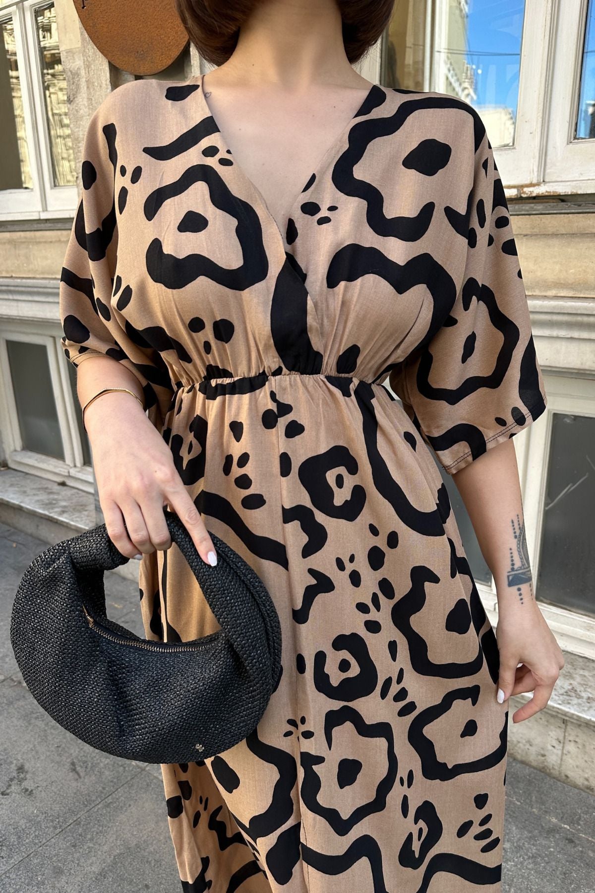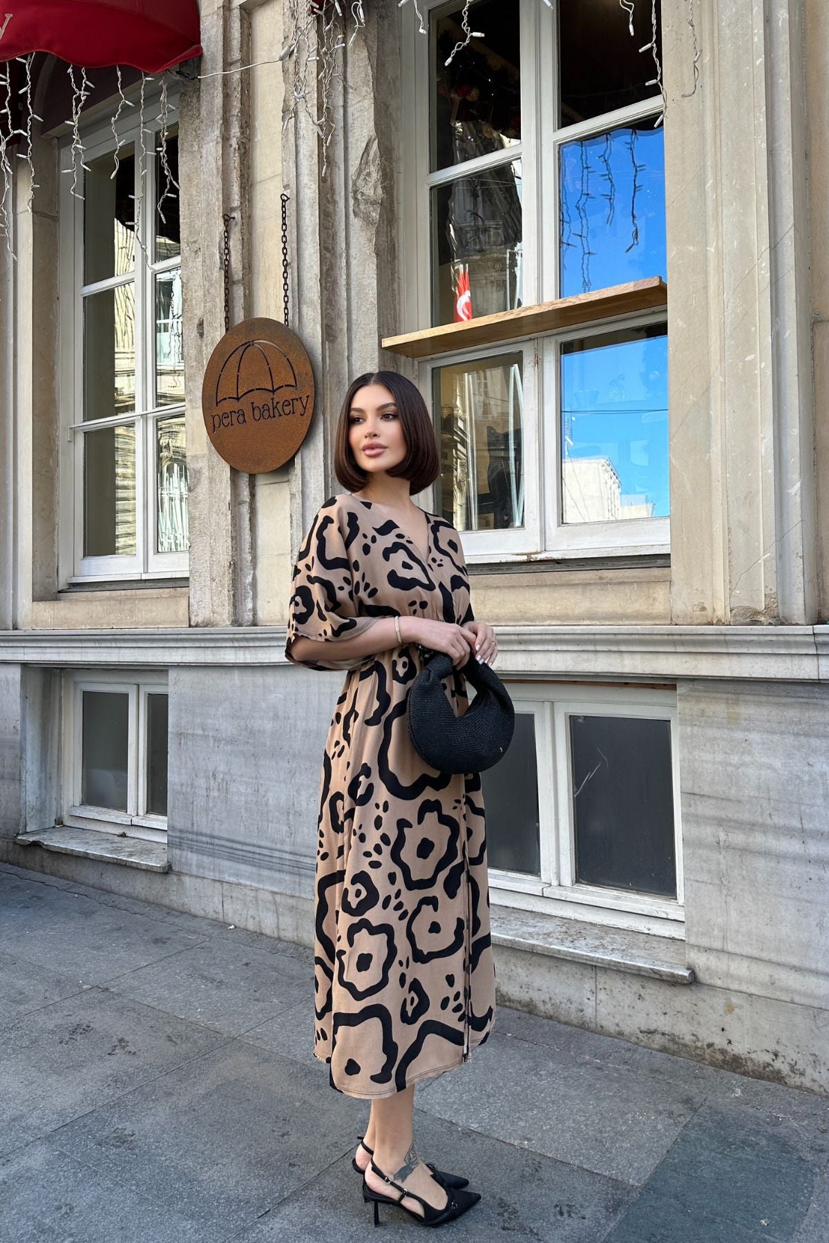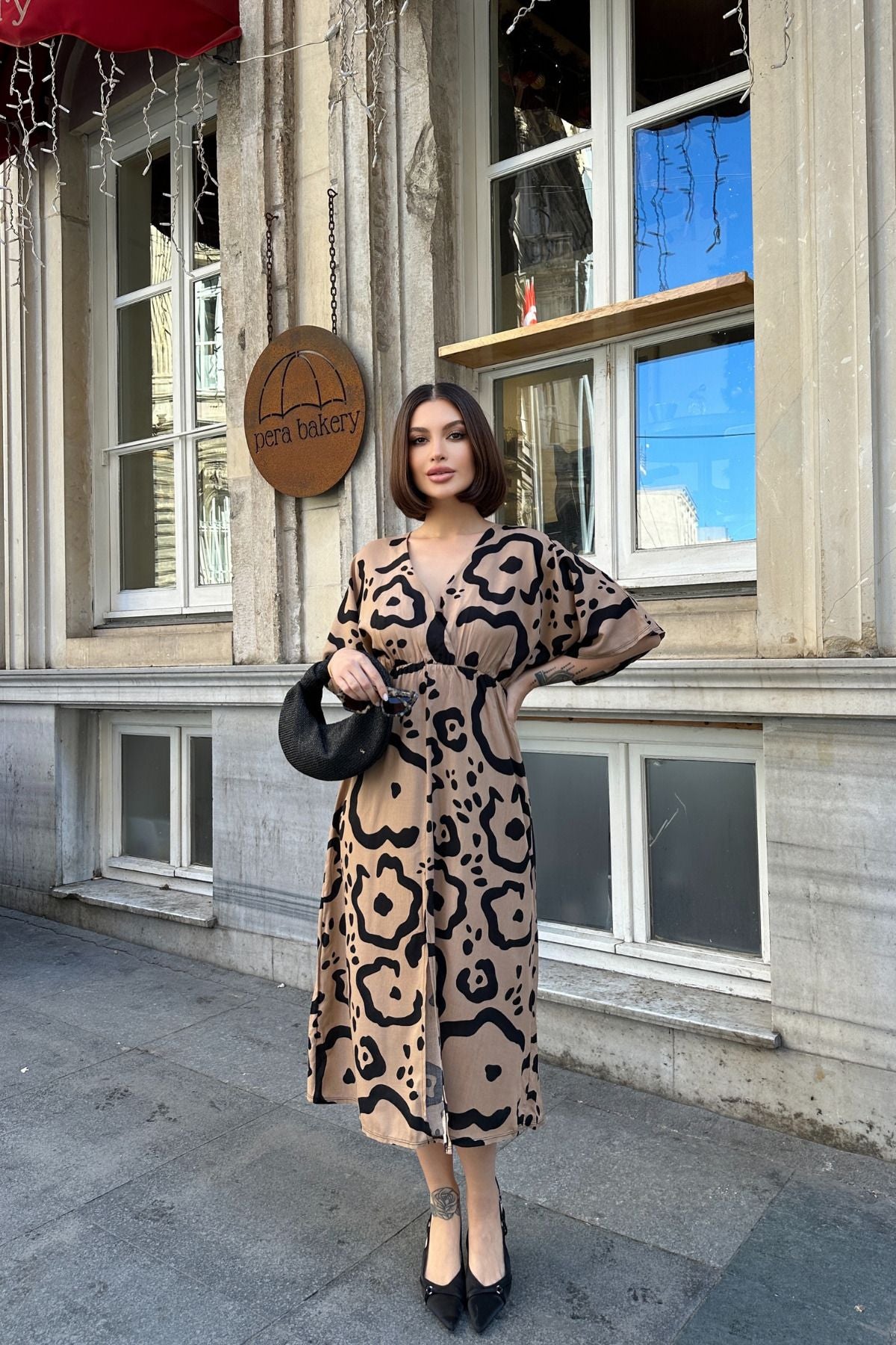 Yarasa Kol Beli Lastikli Önden Yırtmaçlı Midi Boy Kruvaze Yaka Desenli Yazlık Açık Kahve Elbise