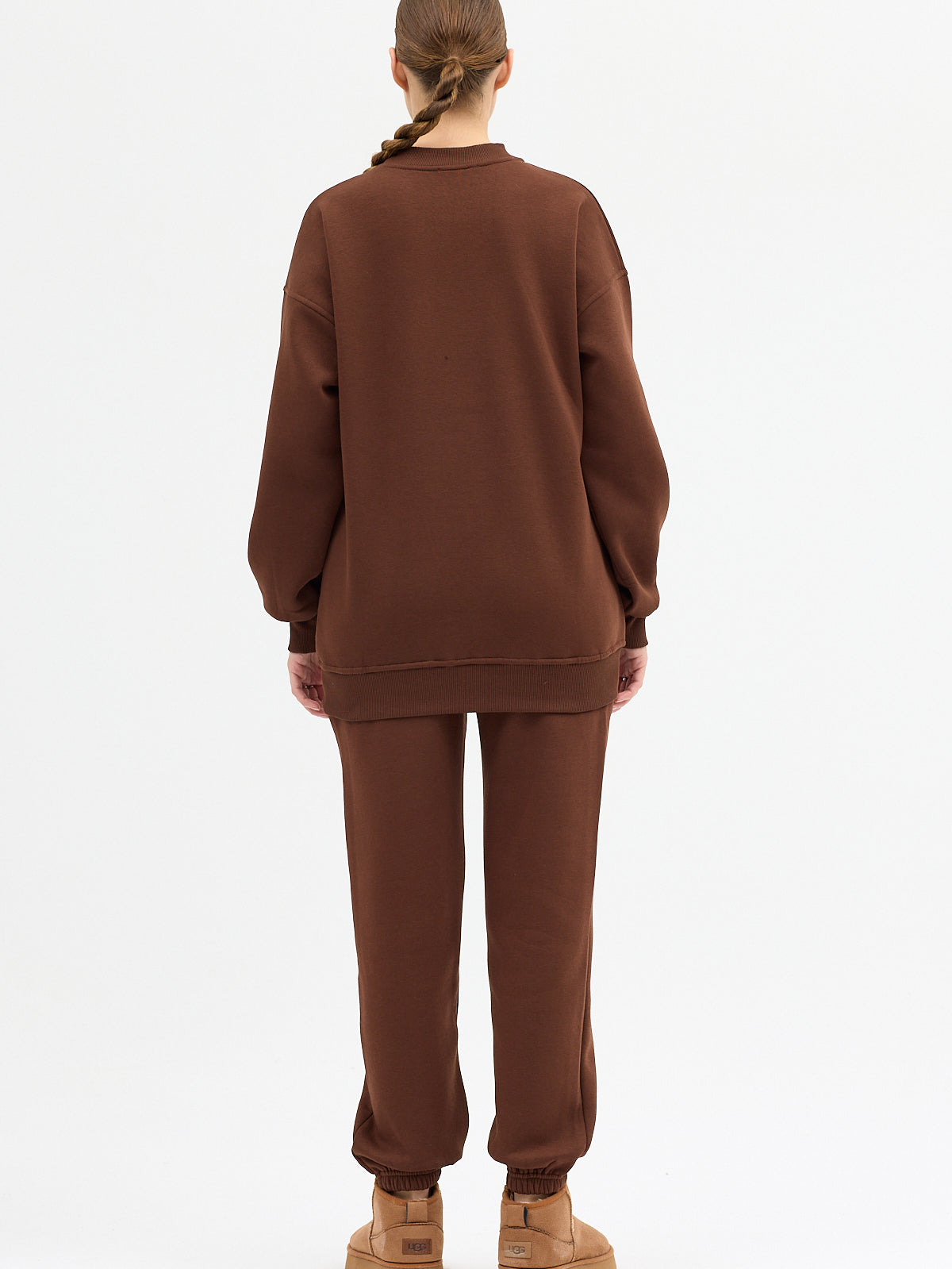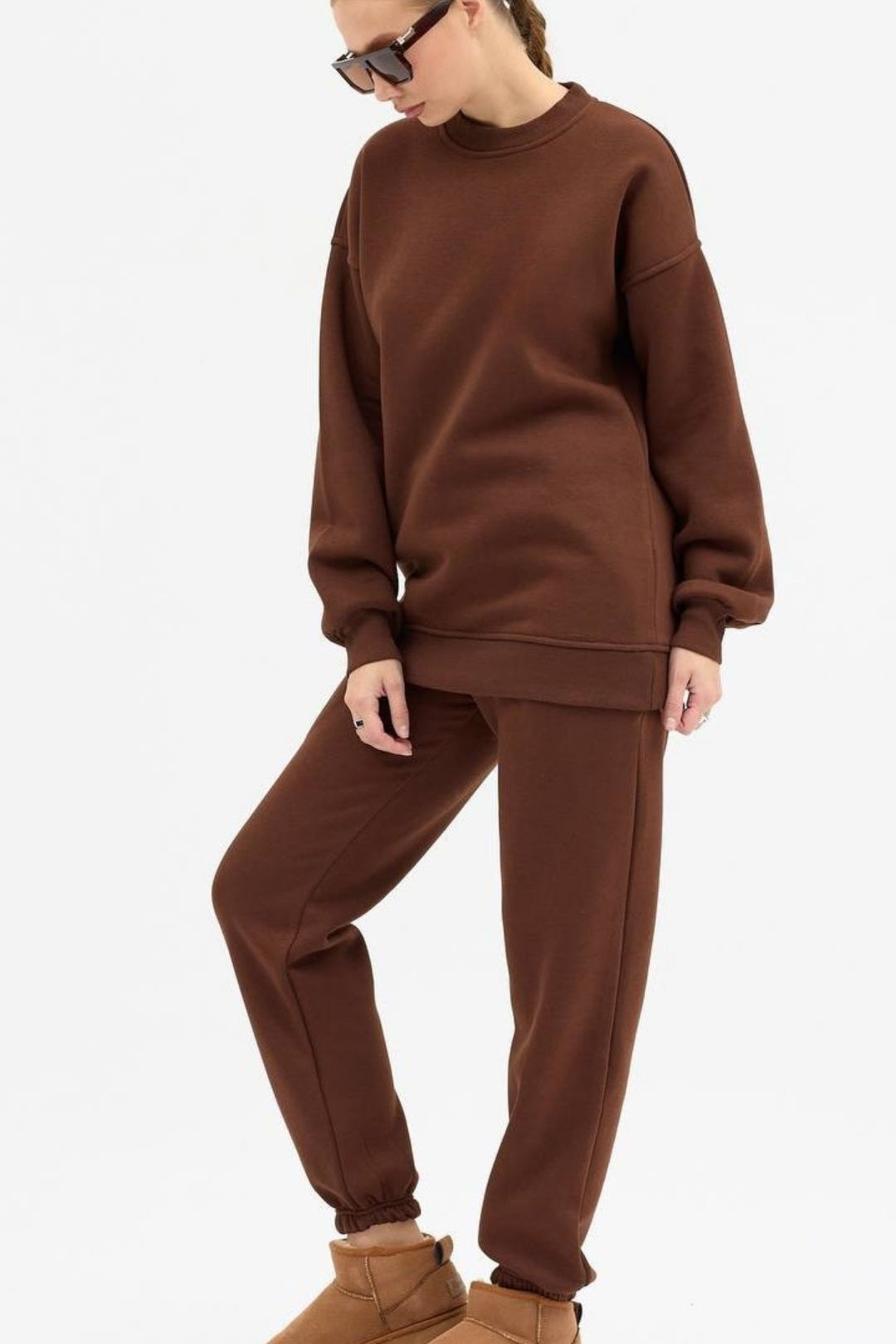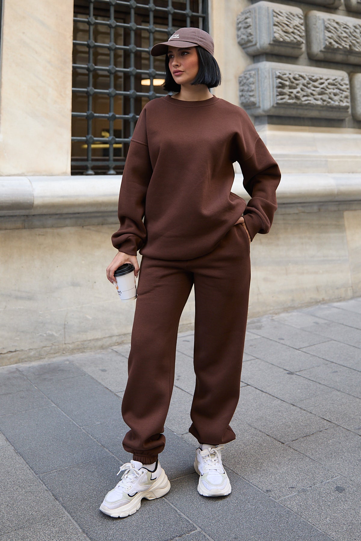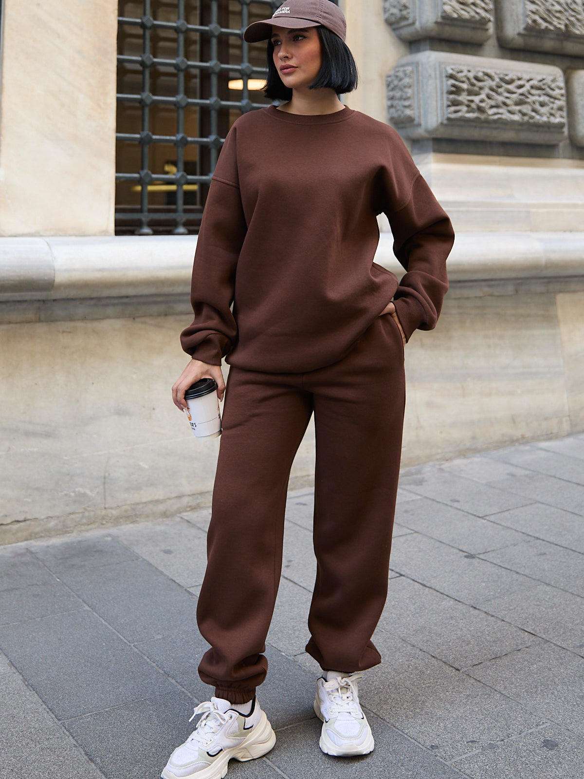 Regular Fit Normal Kalıp Basic Düz İçi Kalın Polarlı Kahverengi Eşofman Takımı