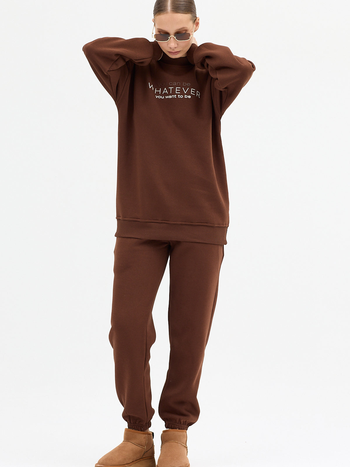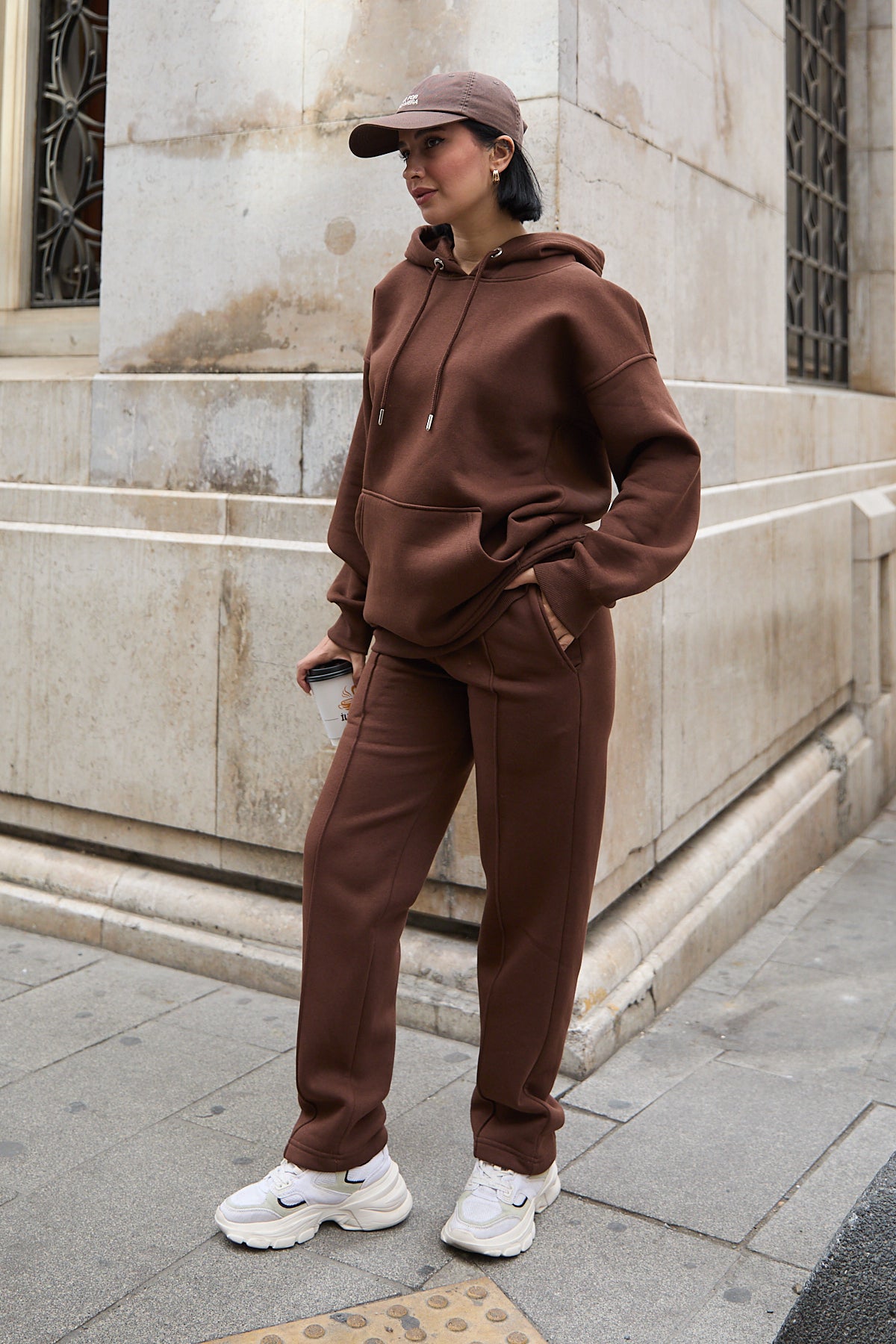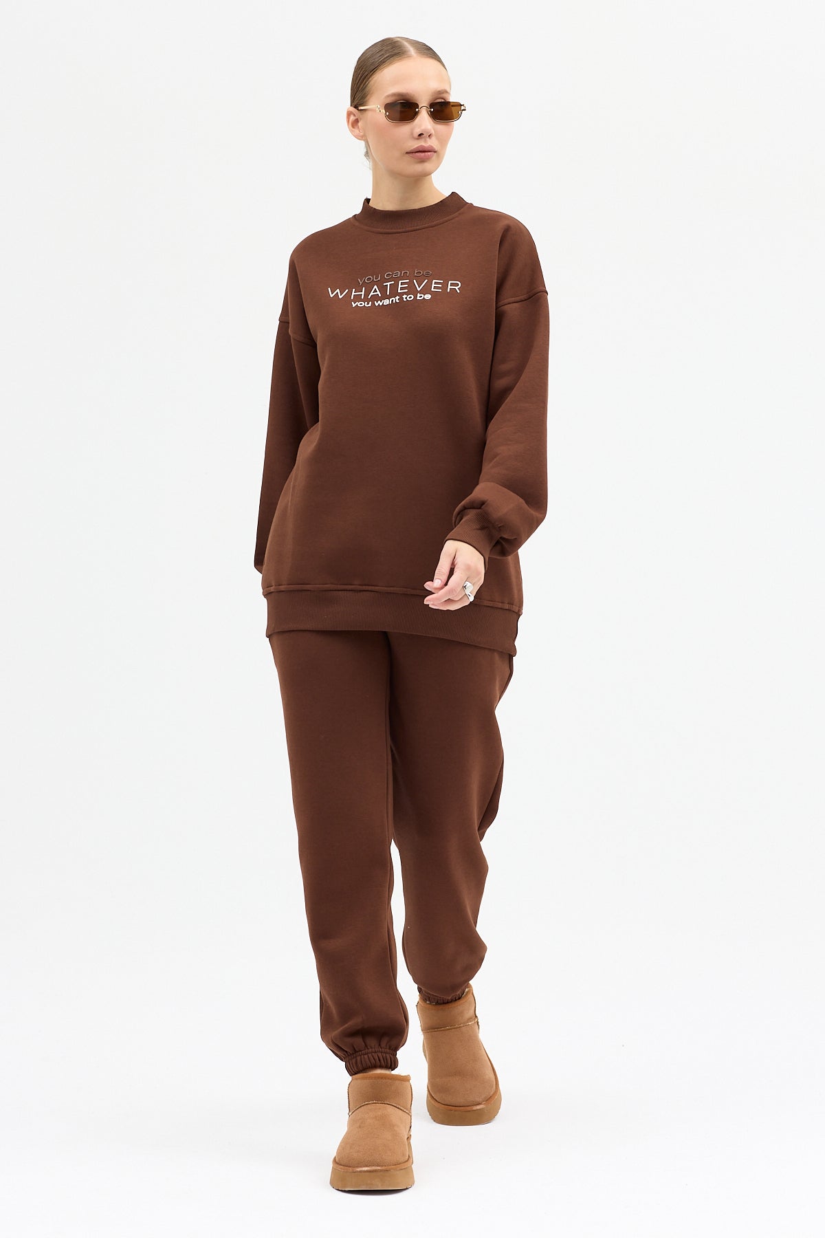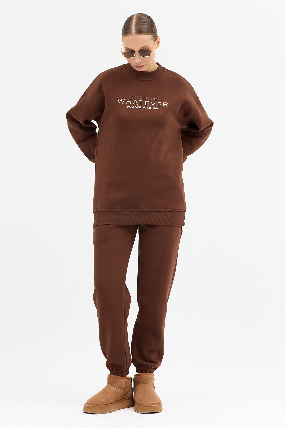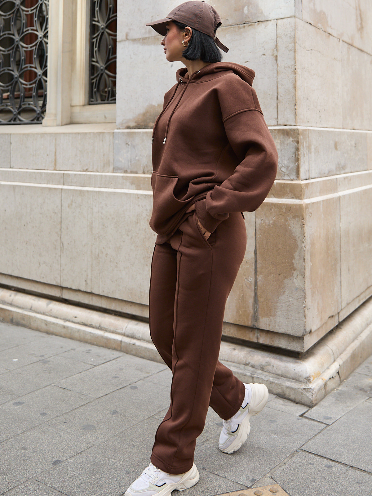 Kadın Oversize Kapüşonlu Kahverengi Eşofman Takımı Kışlık Içi Pamuklu
