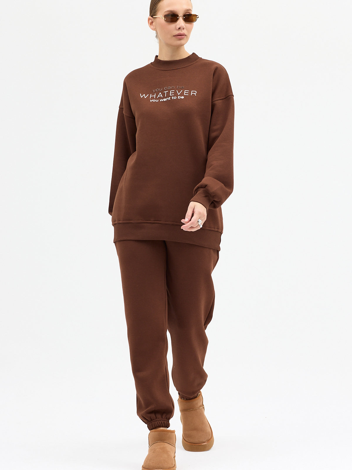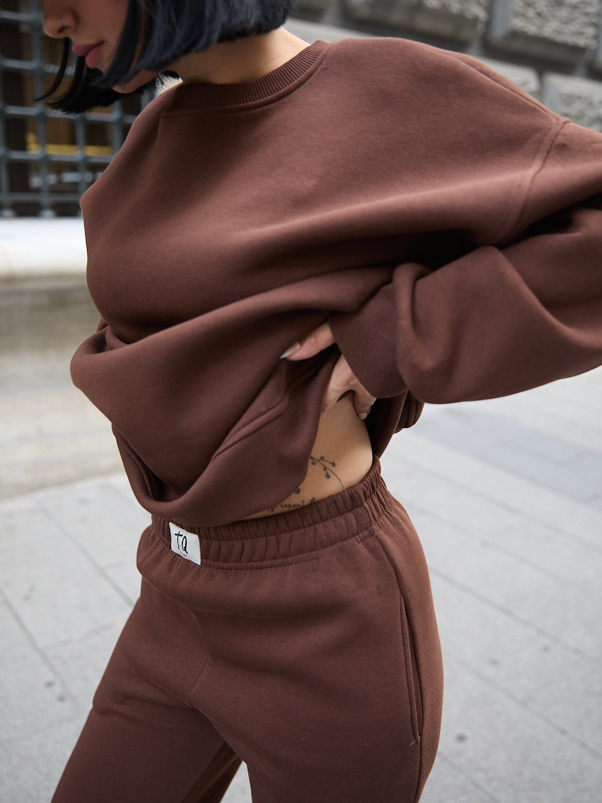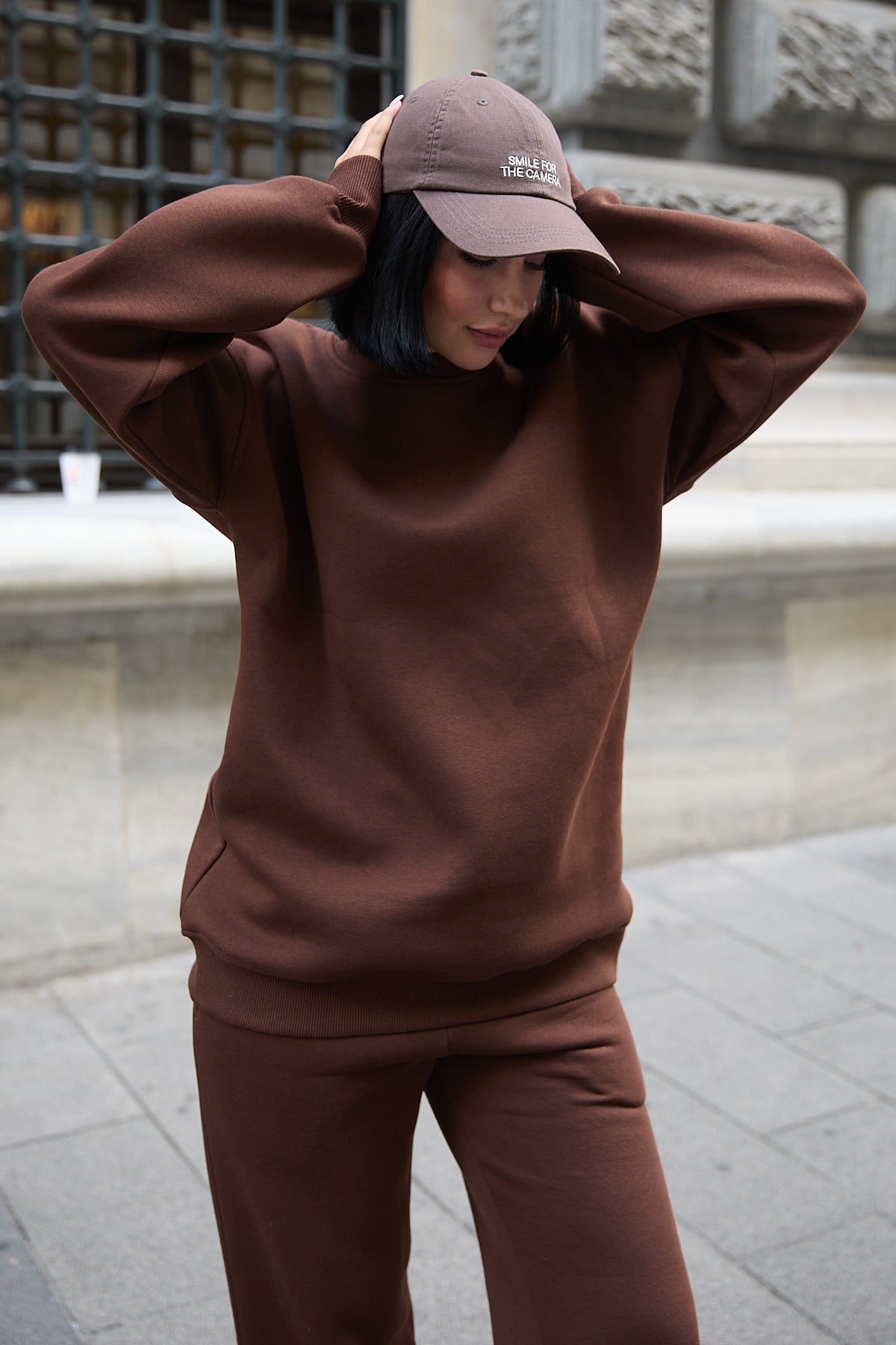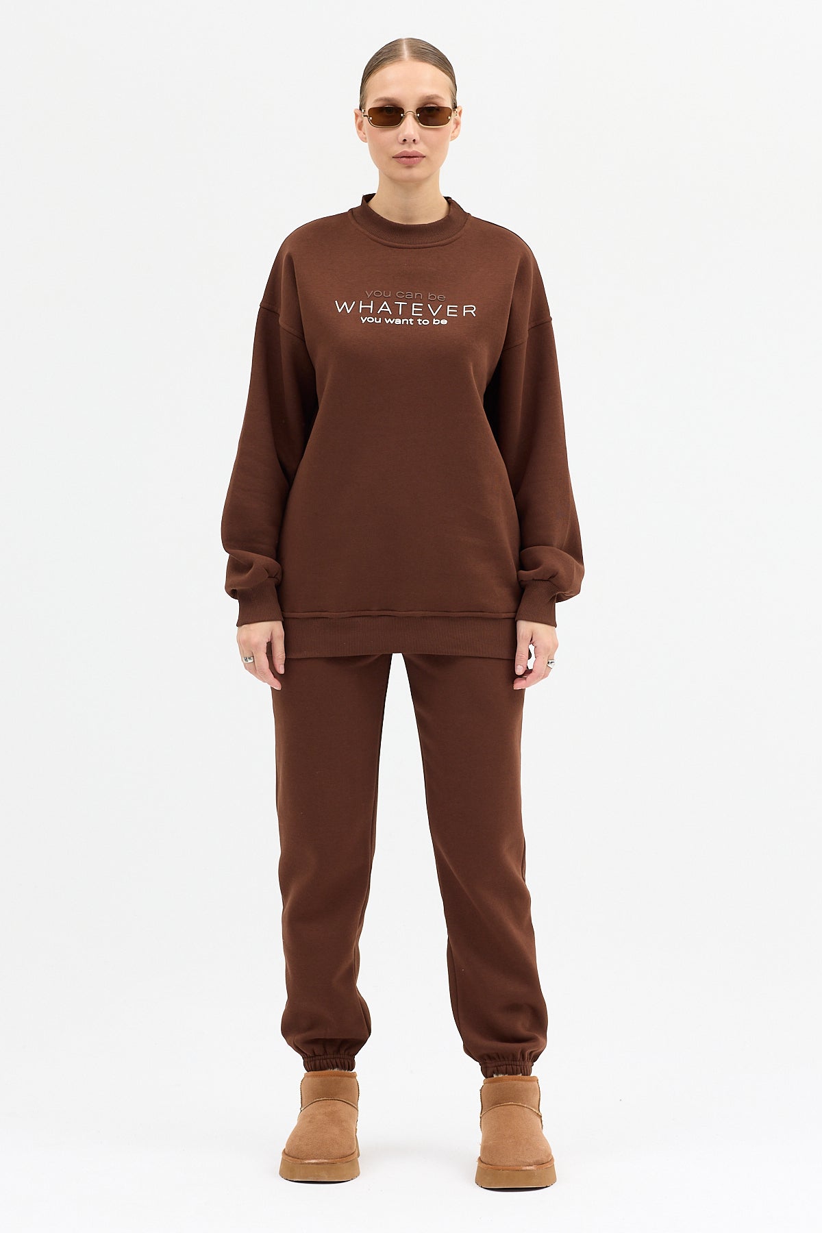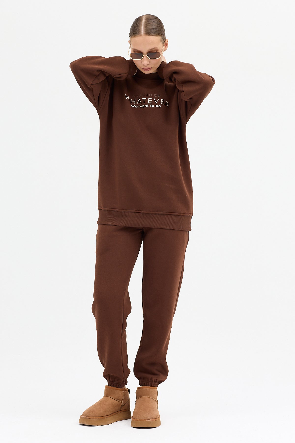 Kadın Oversize Kapüşonlu Kahverengi Eşofman Takımı Kışlık Içi Pamuklu