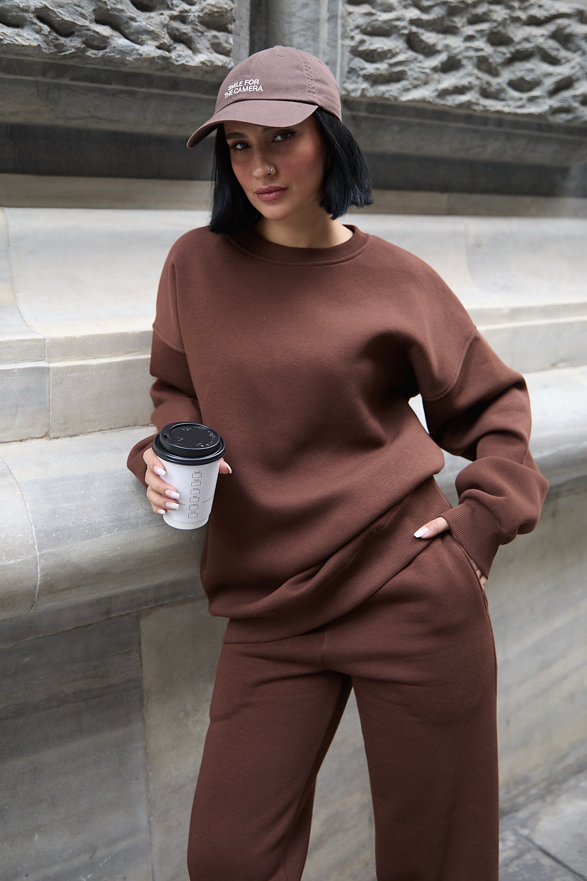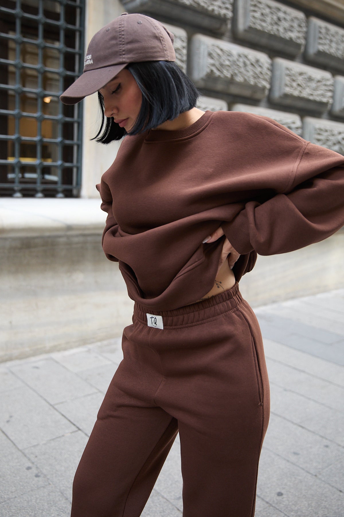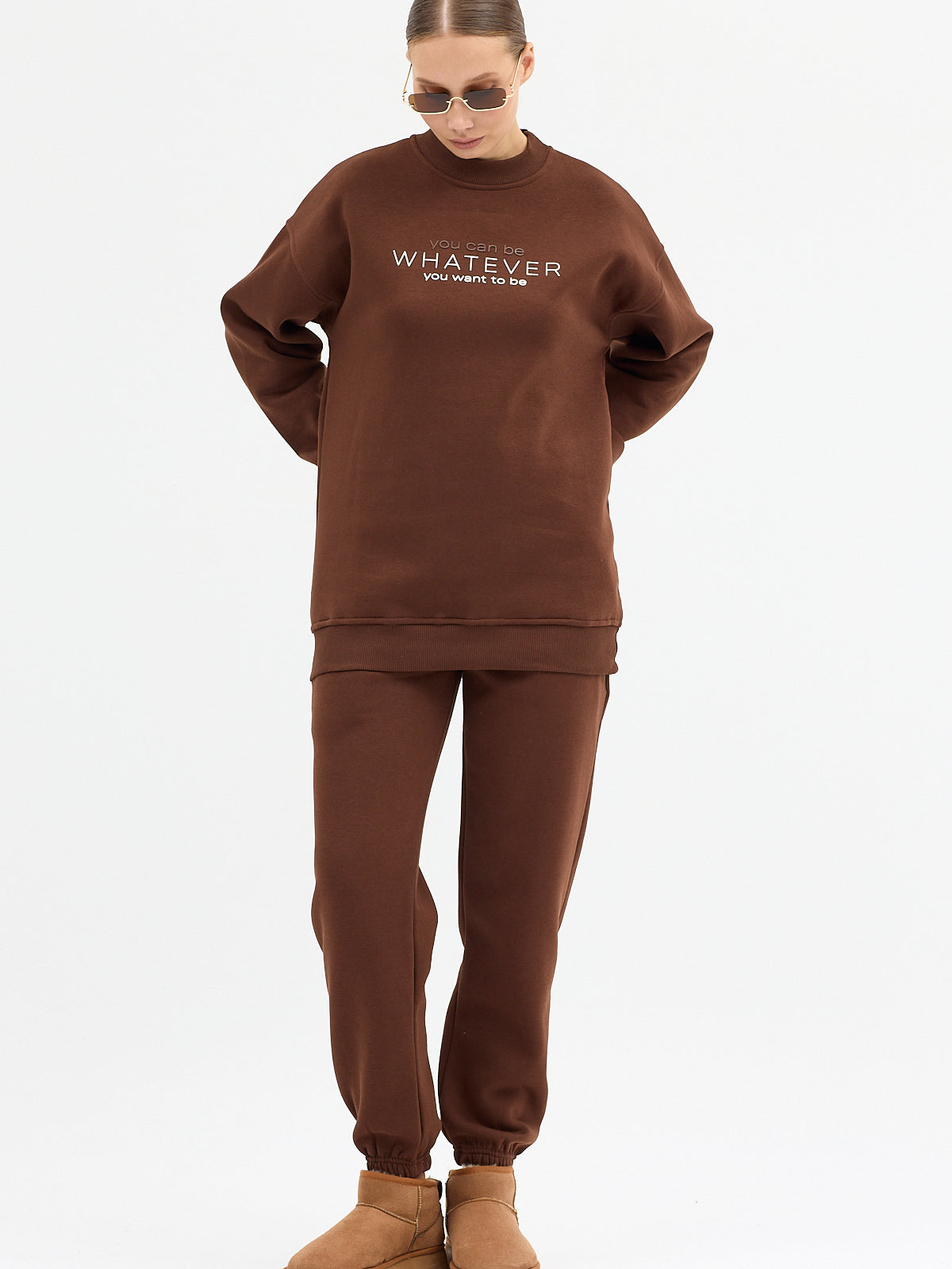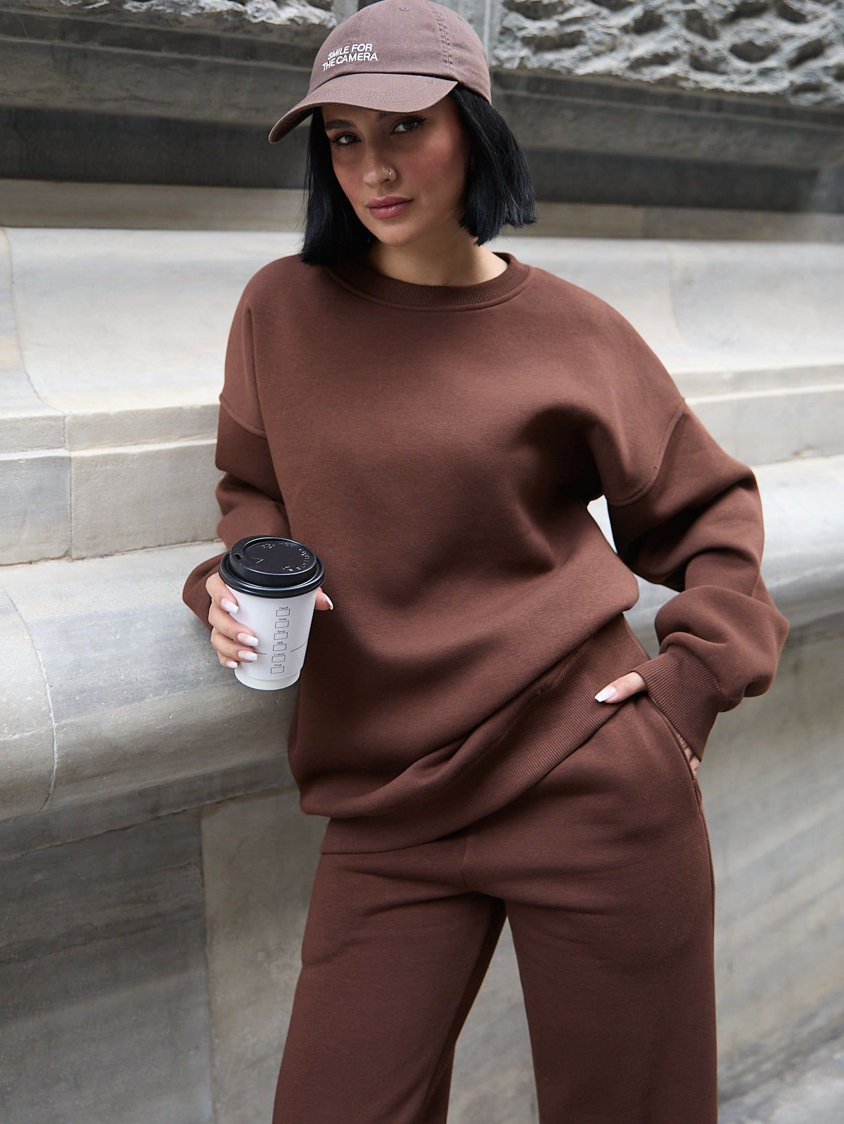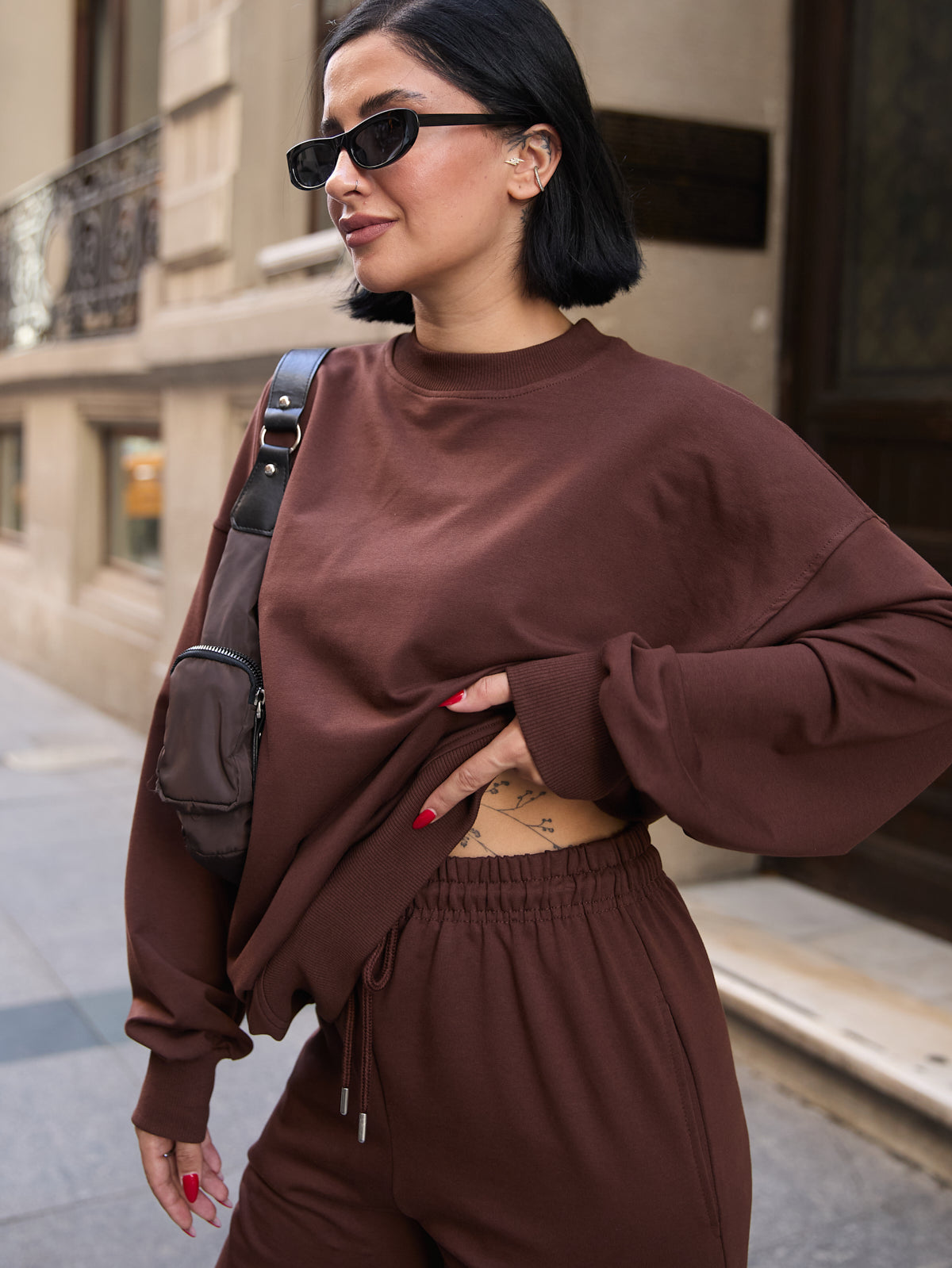 Kadın Oversize Kapüşonlu Kahverengi Eşofman Takımı Kışlık Içi Pamuklu