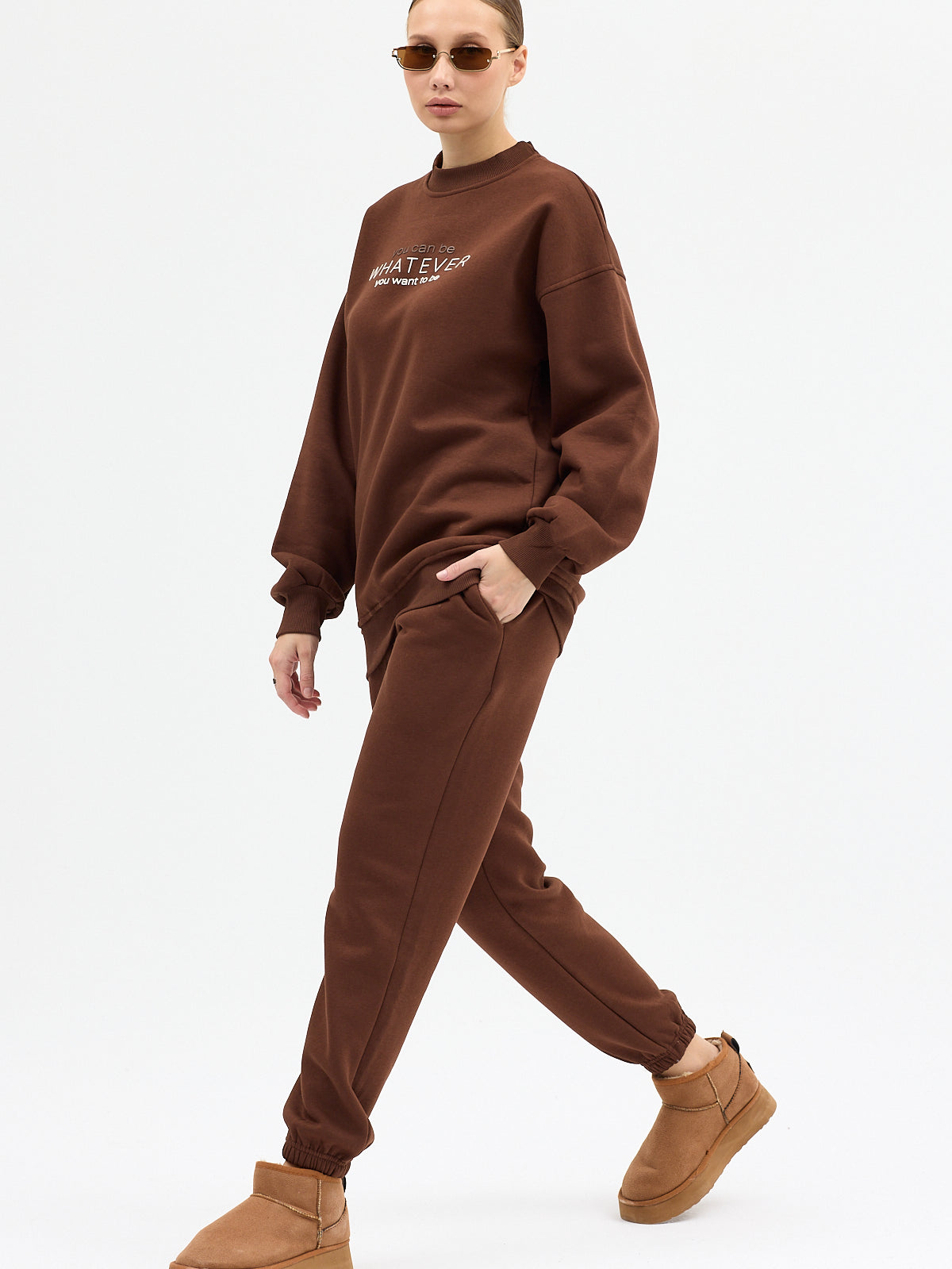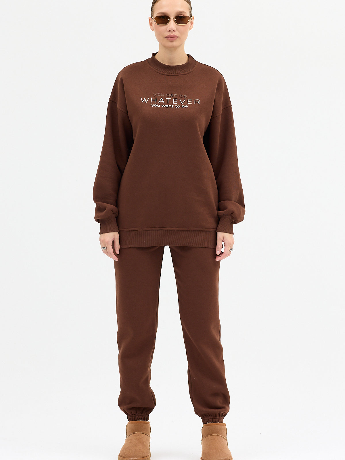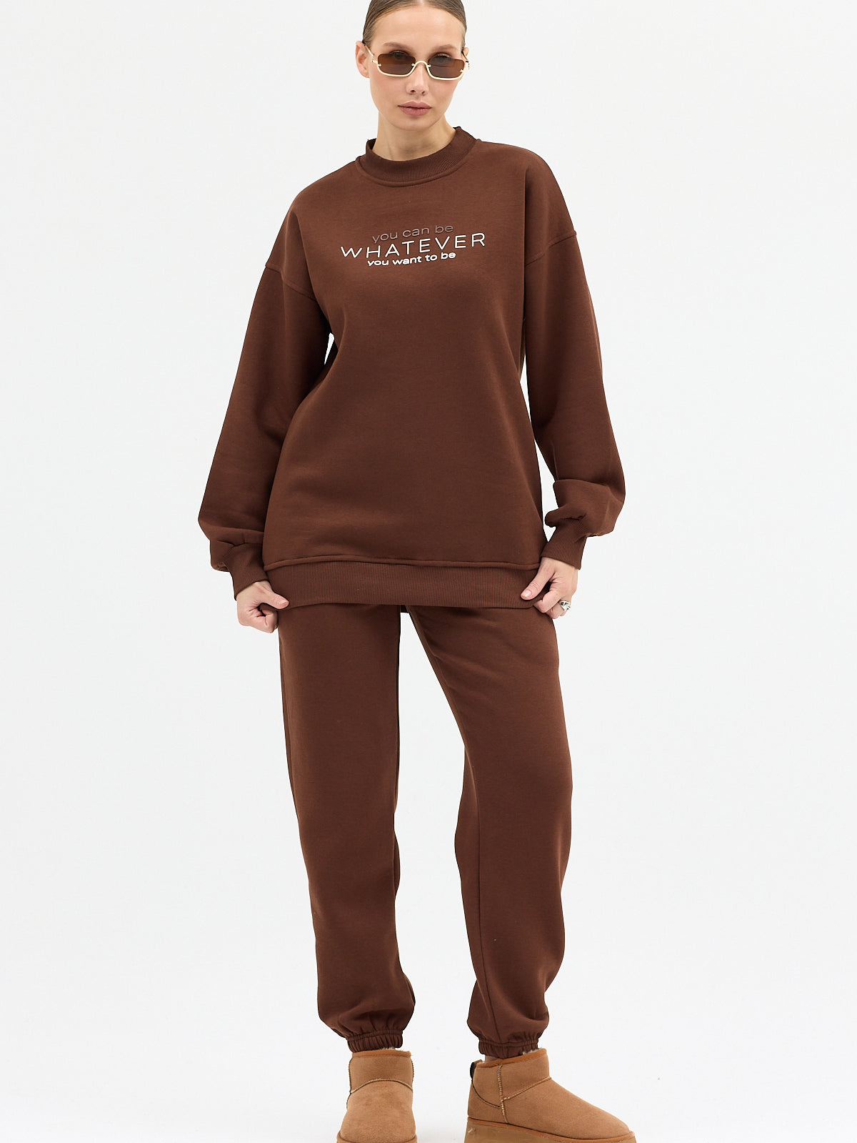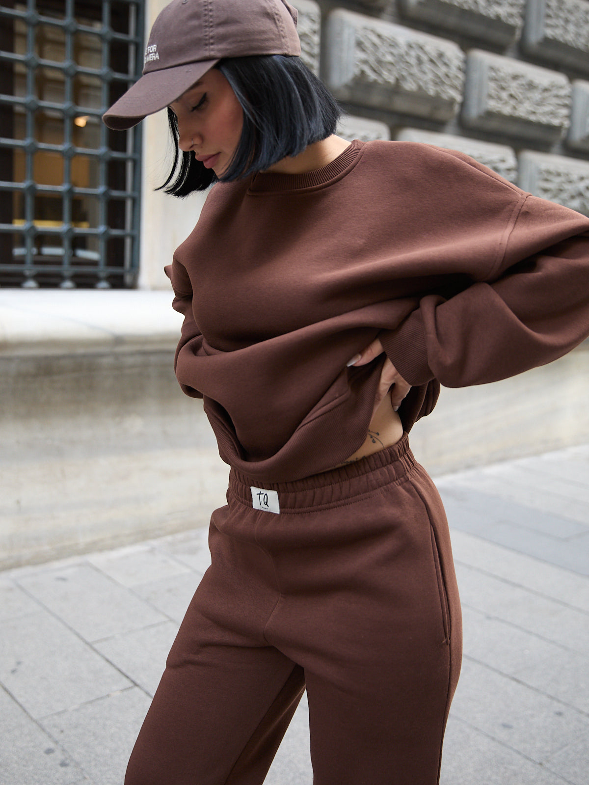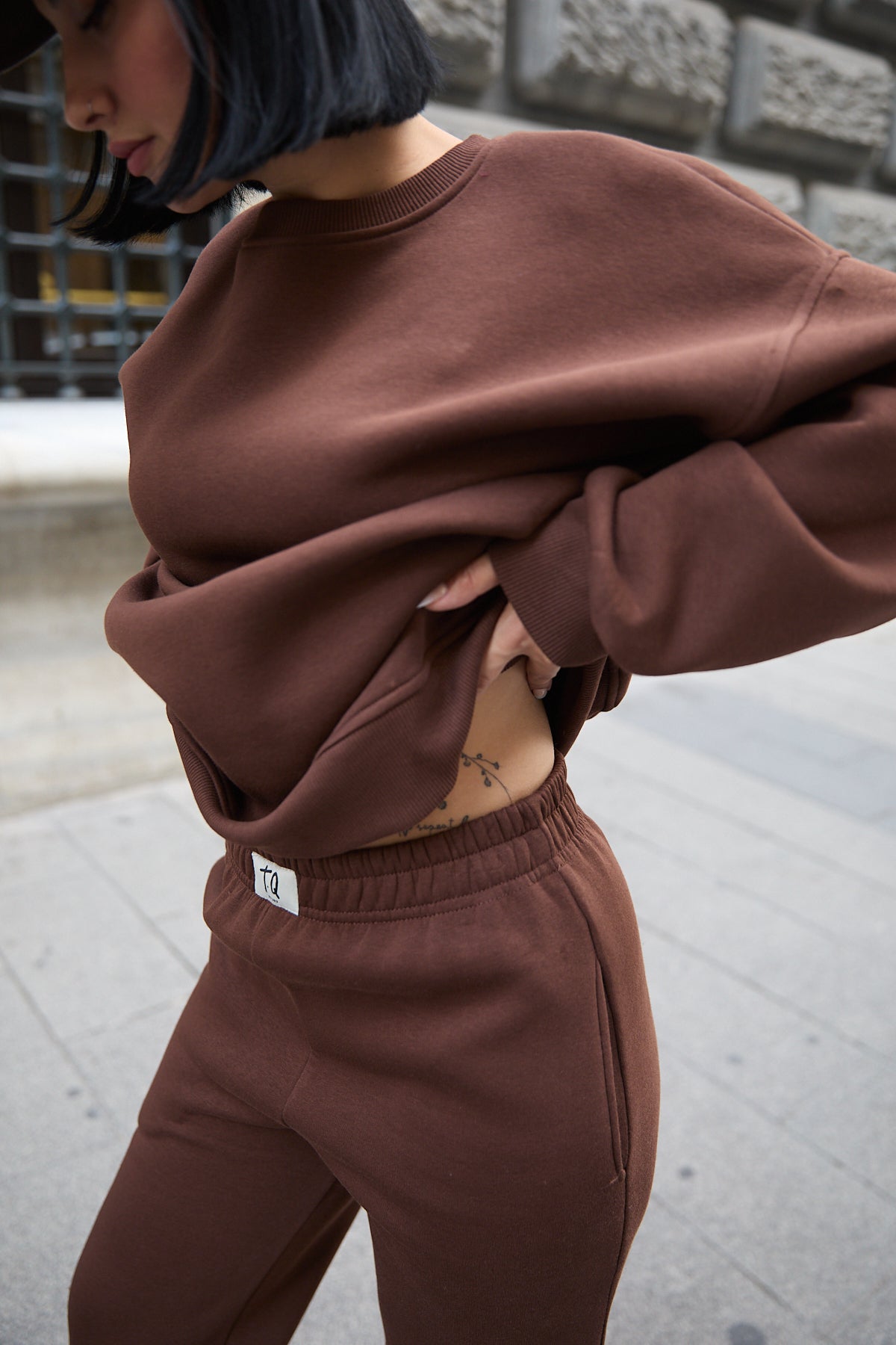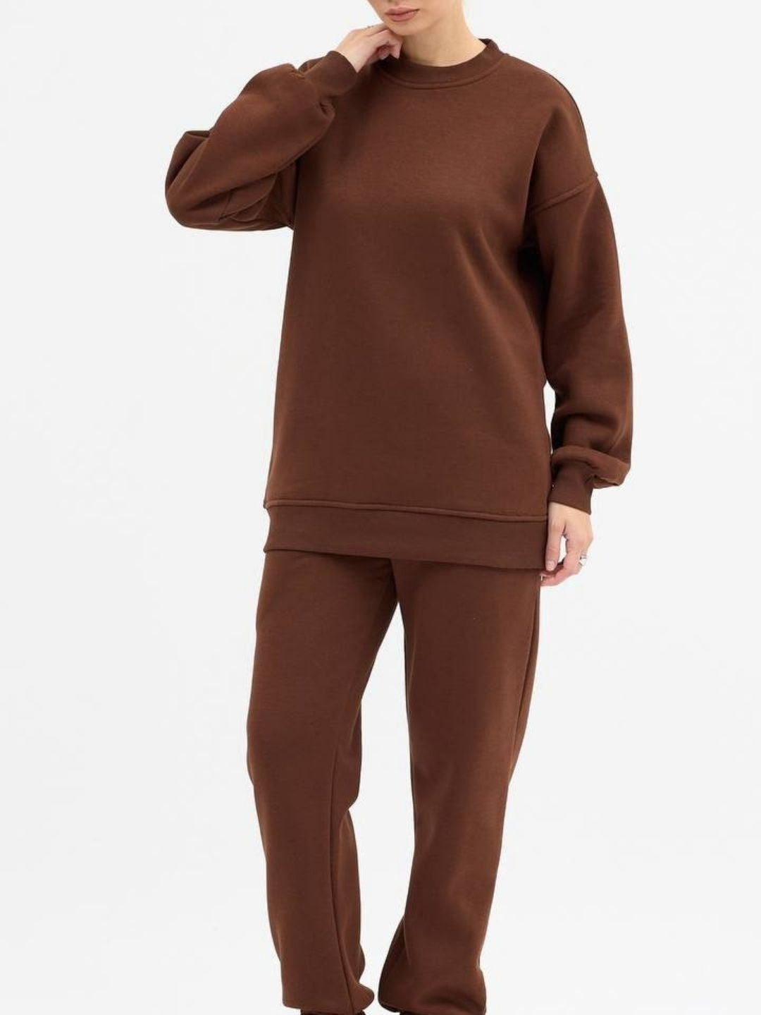 Kadın Oversize Kapüşonlu Kahverengi Eşofman Takımı Kışlık Içi Pamuklu