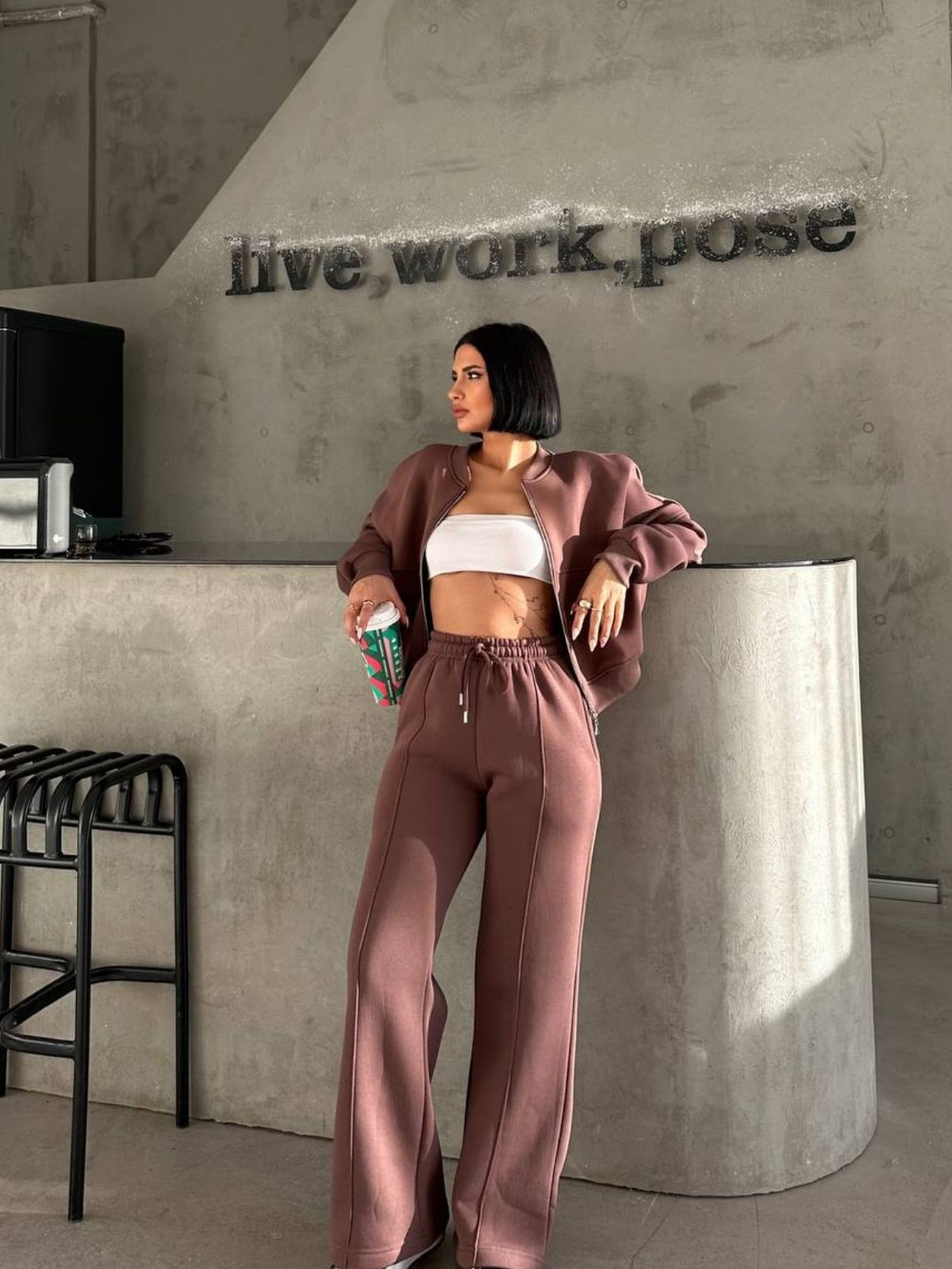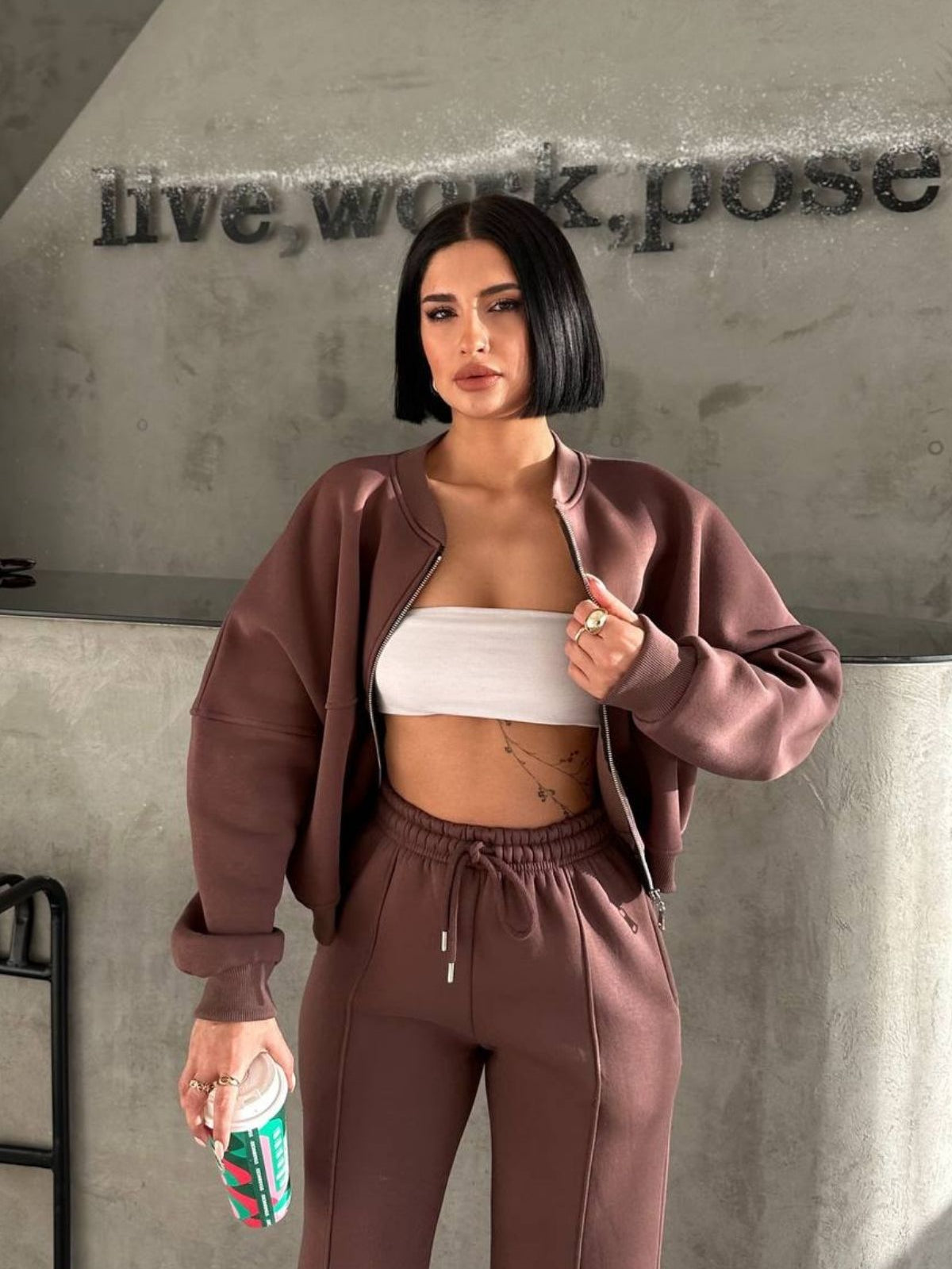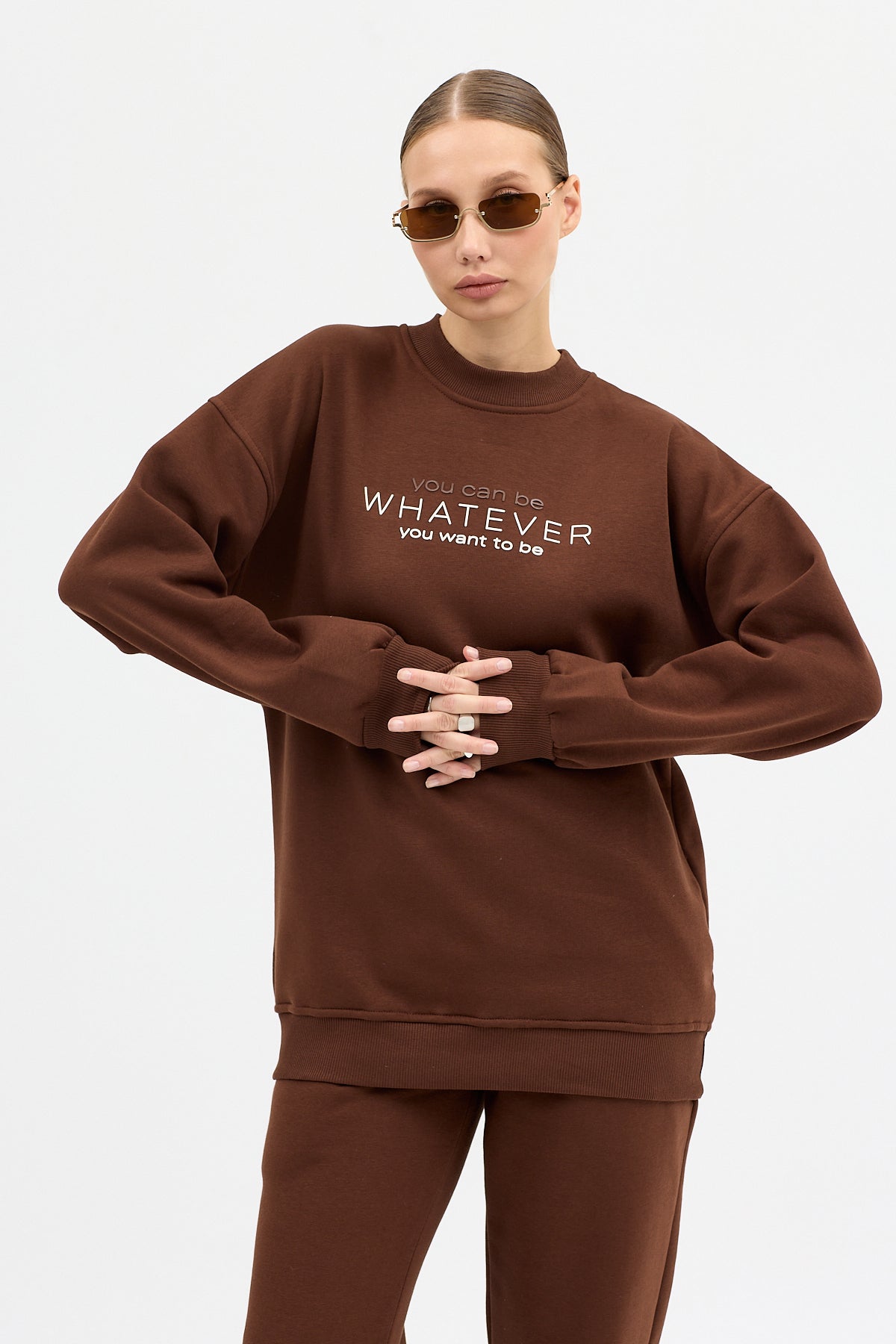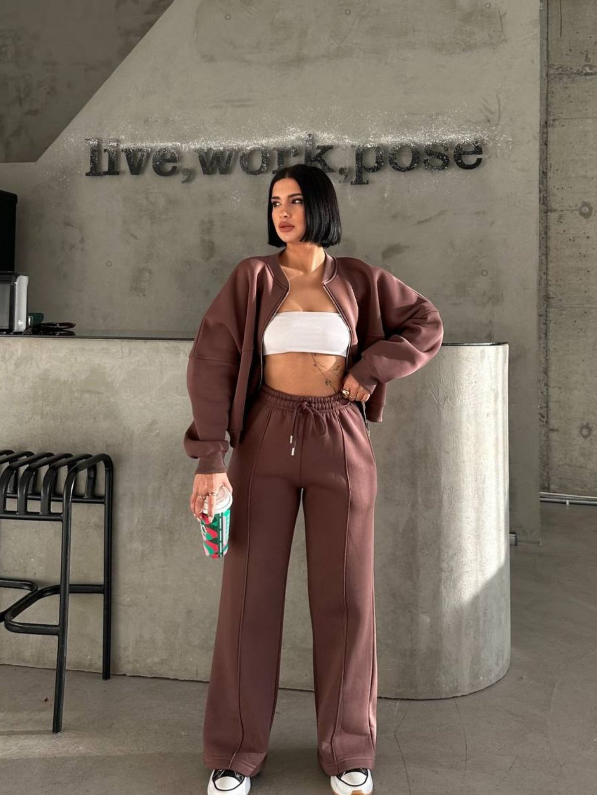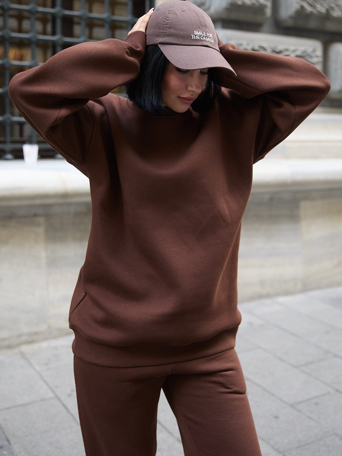 Kadın Oversize Kapüşonlu Kahverengi Eşofman Takımı Kışlık Içi Pamuklu