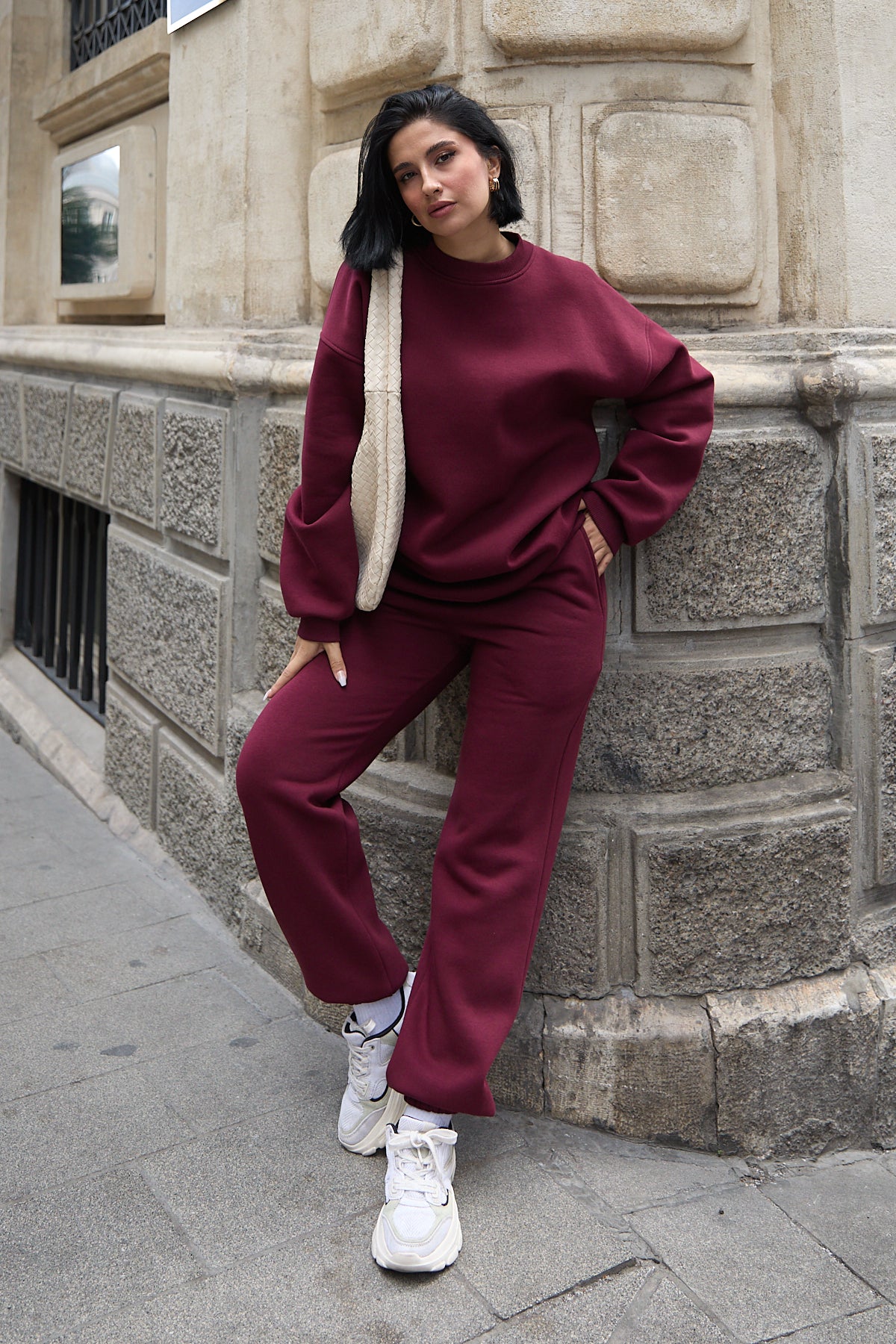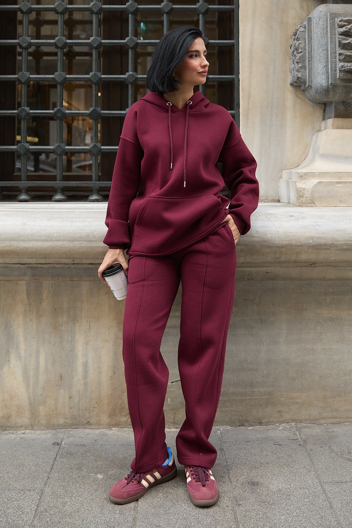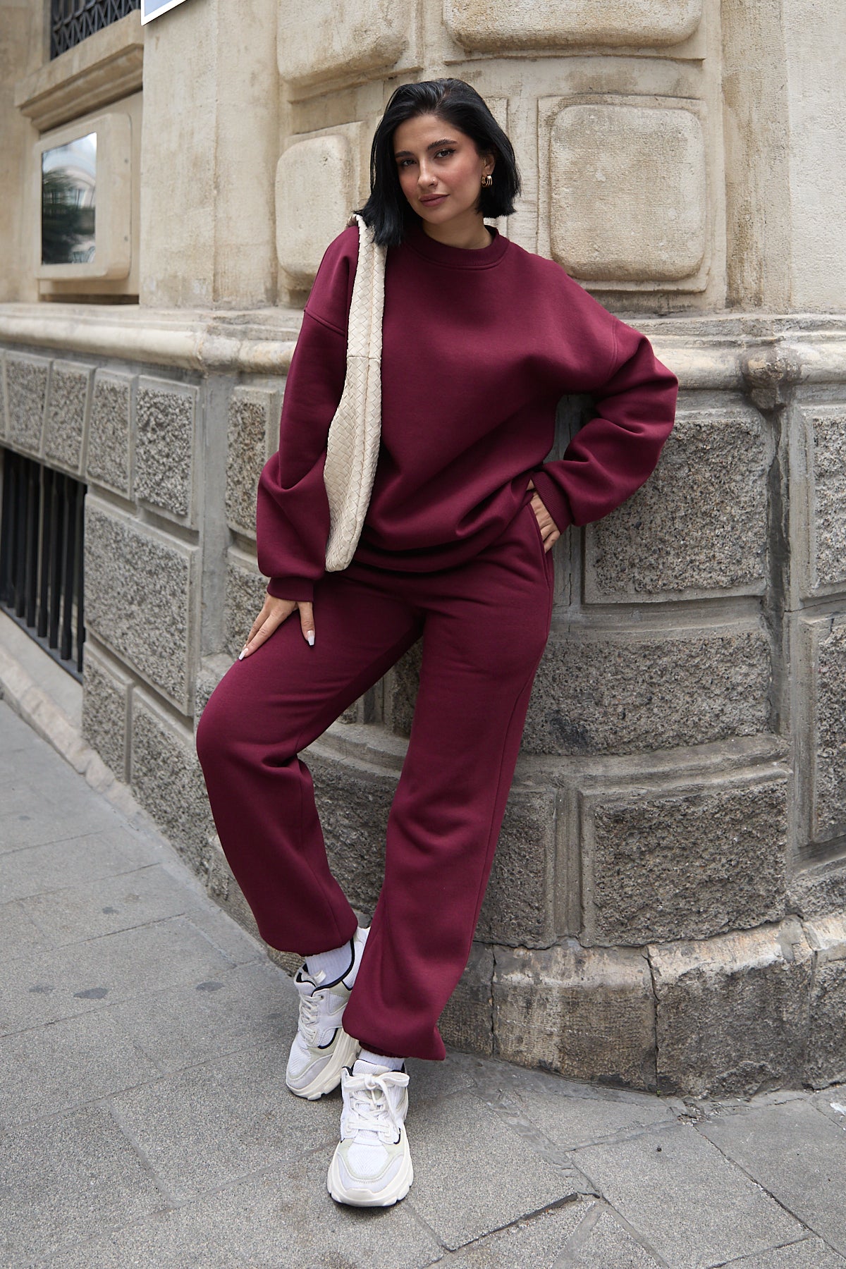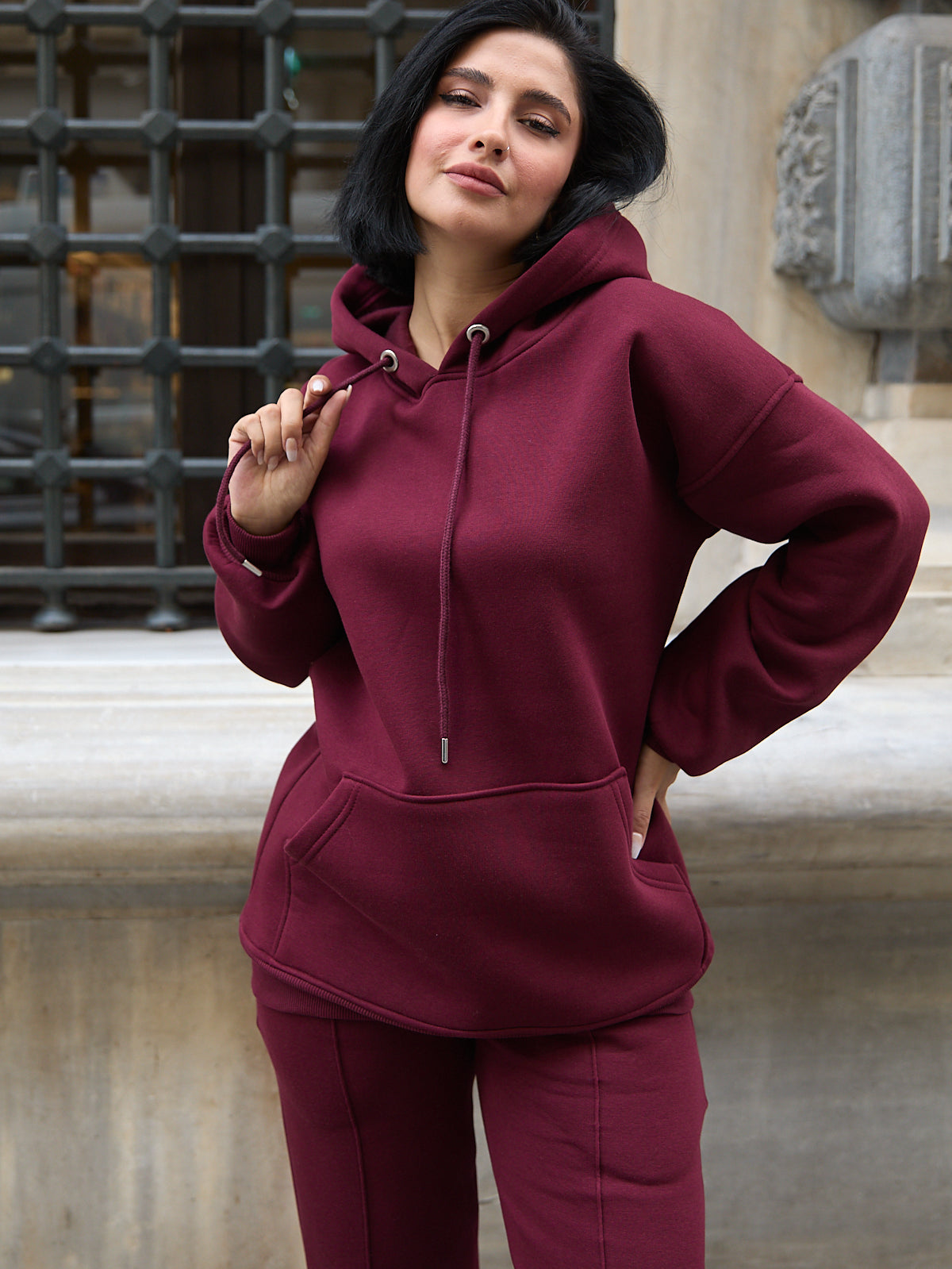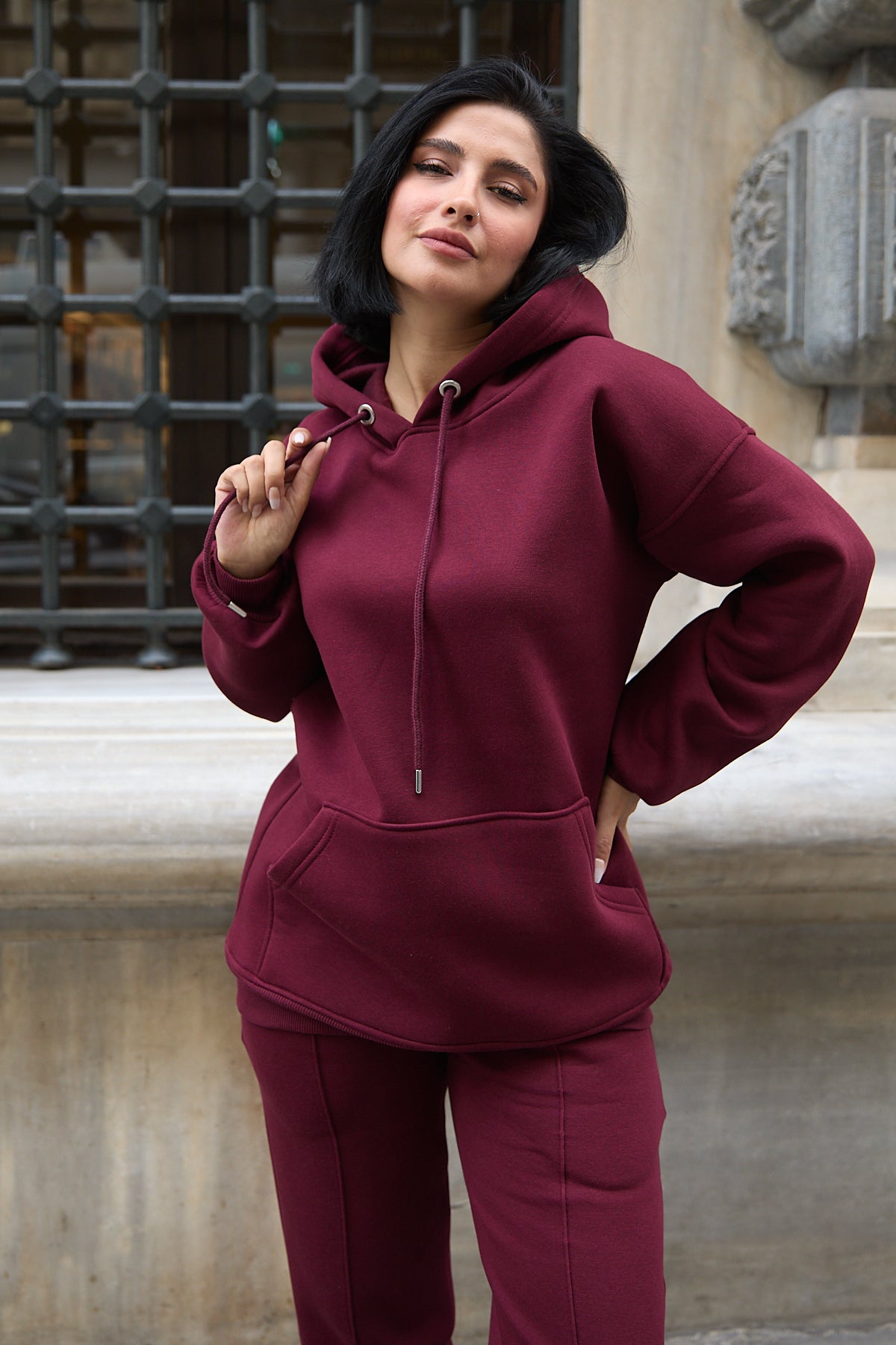 Kadın Oversize Kapüşonlu Bordo Eşofman Takımı Kışlık Içi Pamuklu