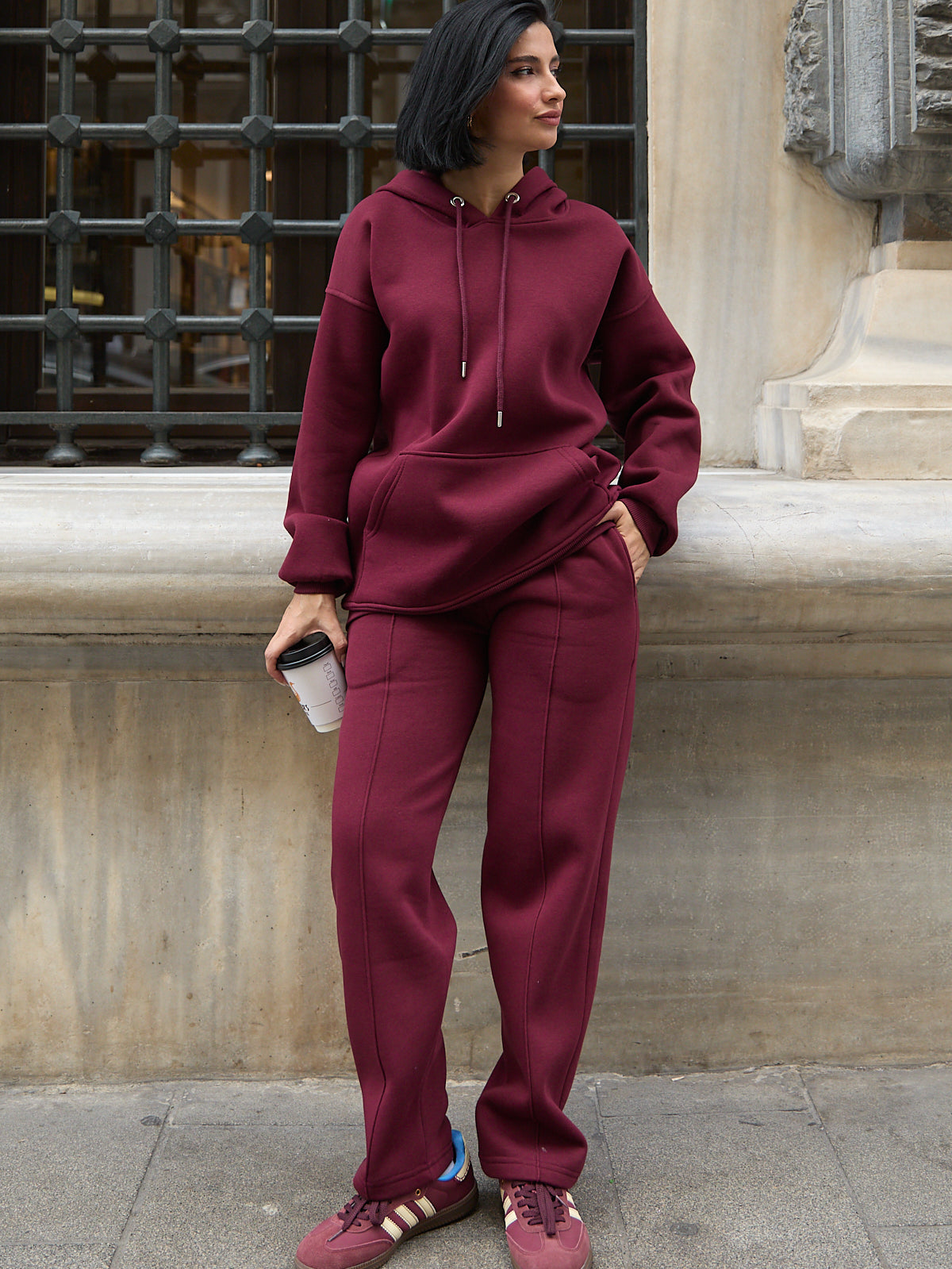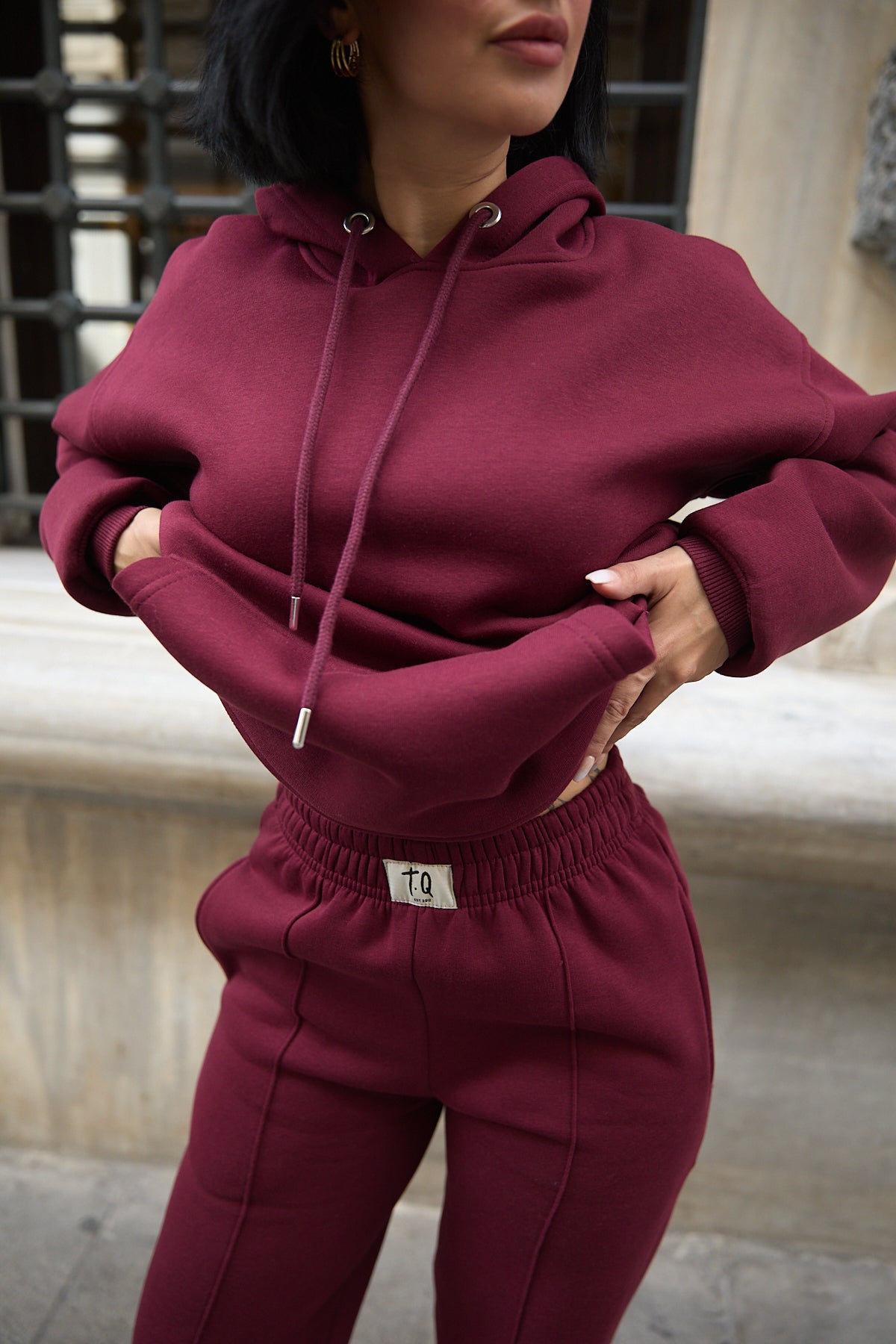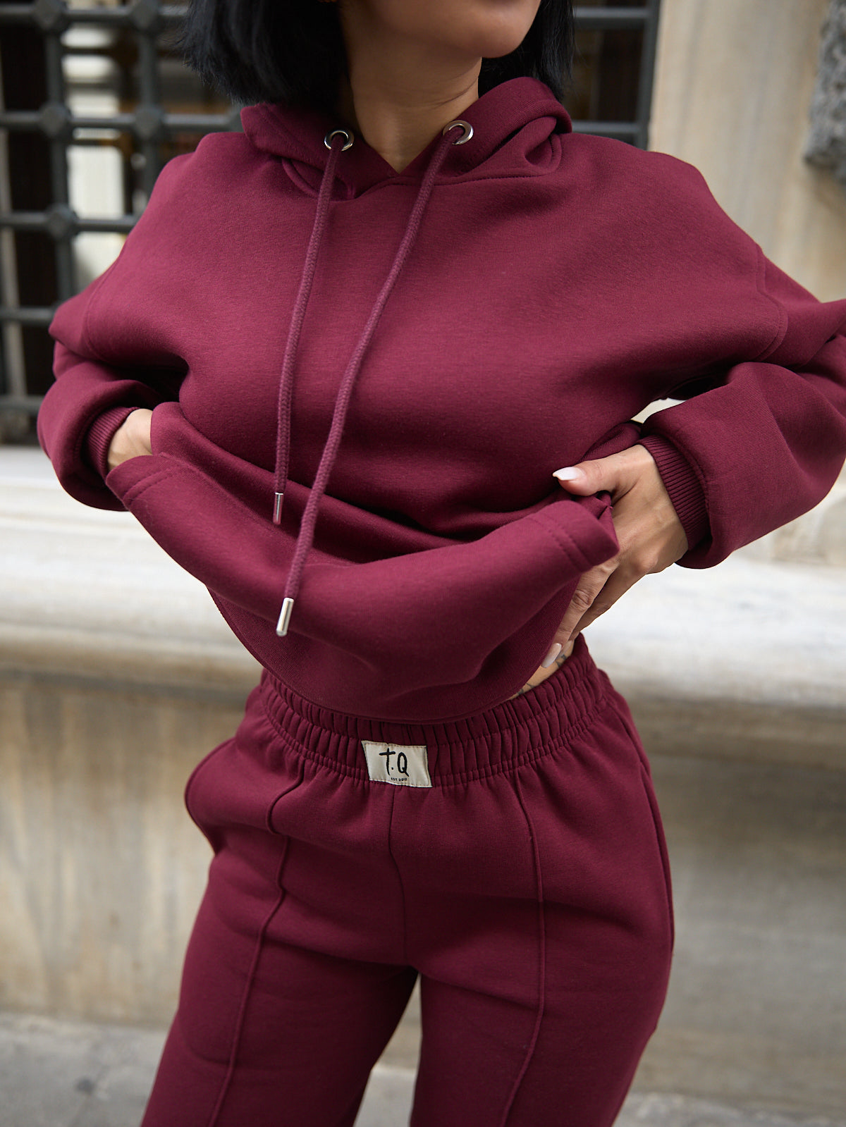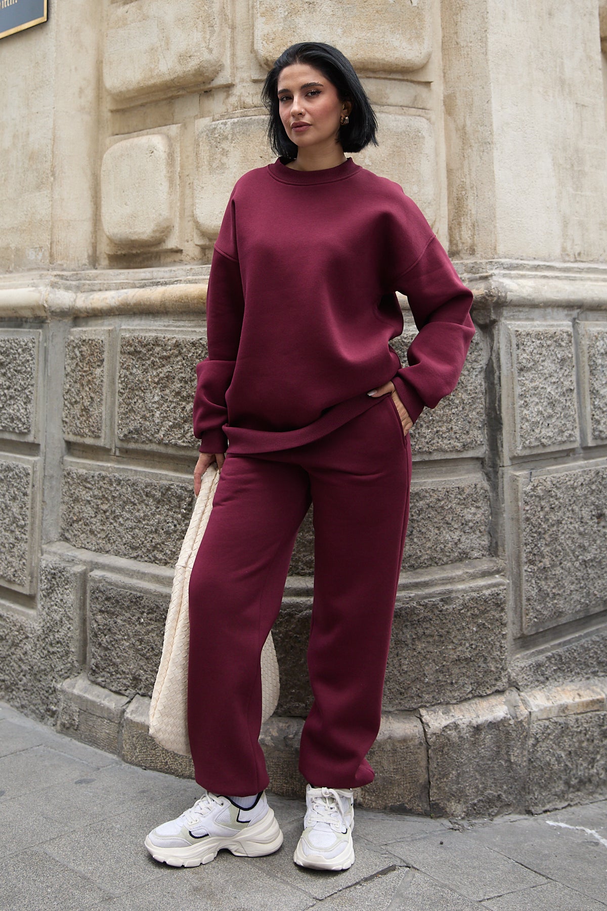 Kadın Oversize Kapüşonlu Bordo Eşofman Takımı Kışlık Içi Pamuklu