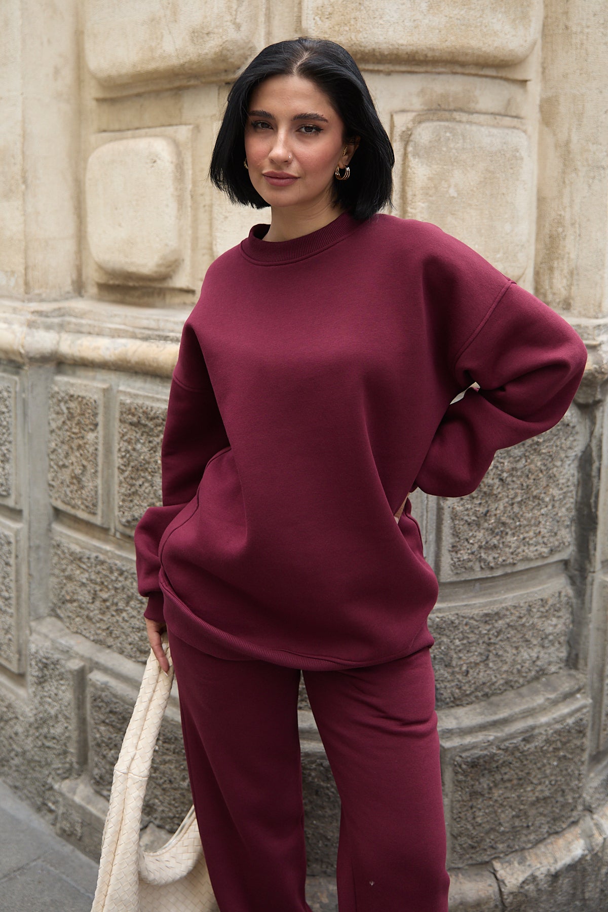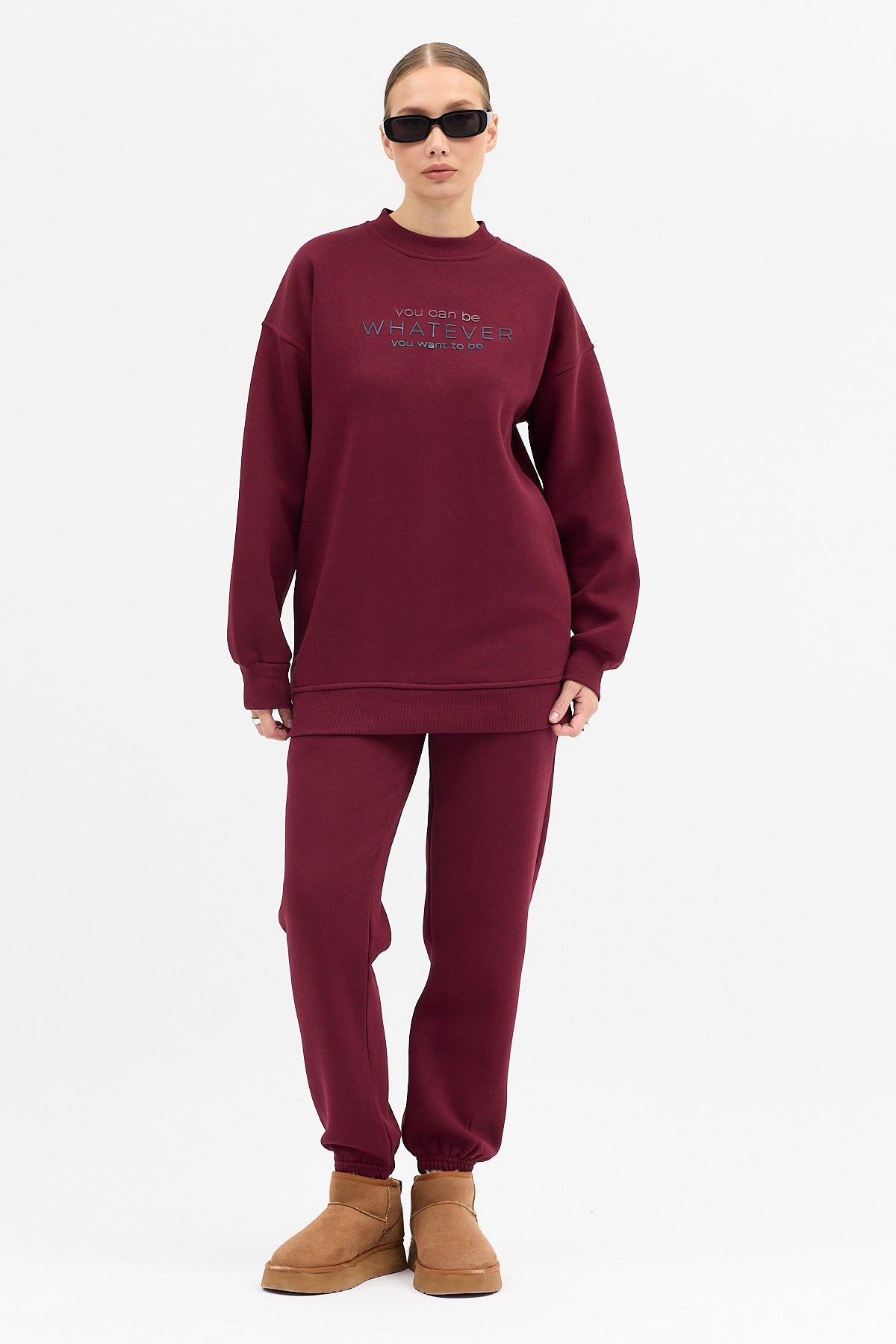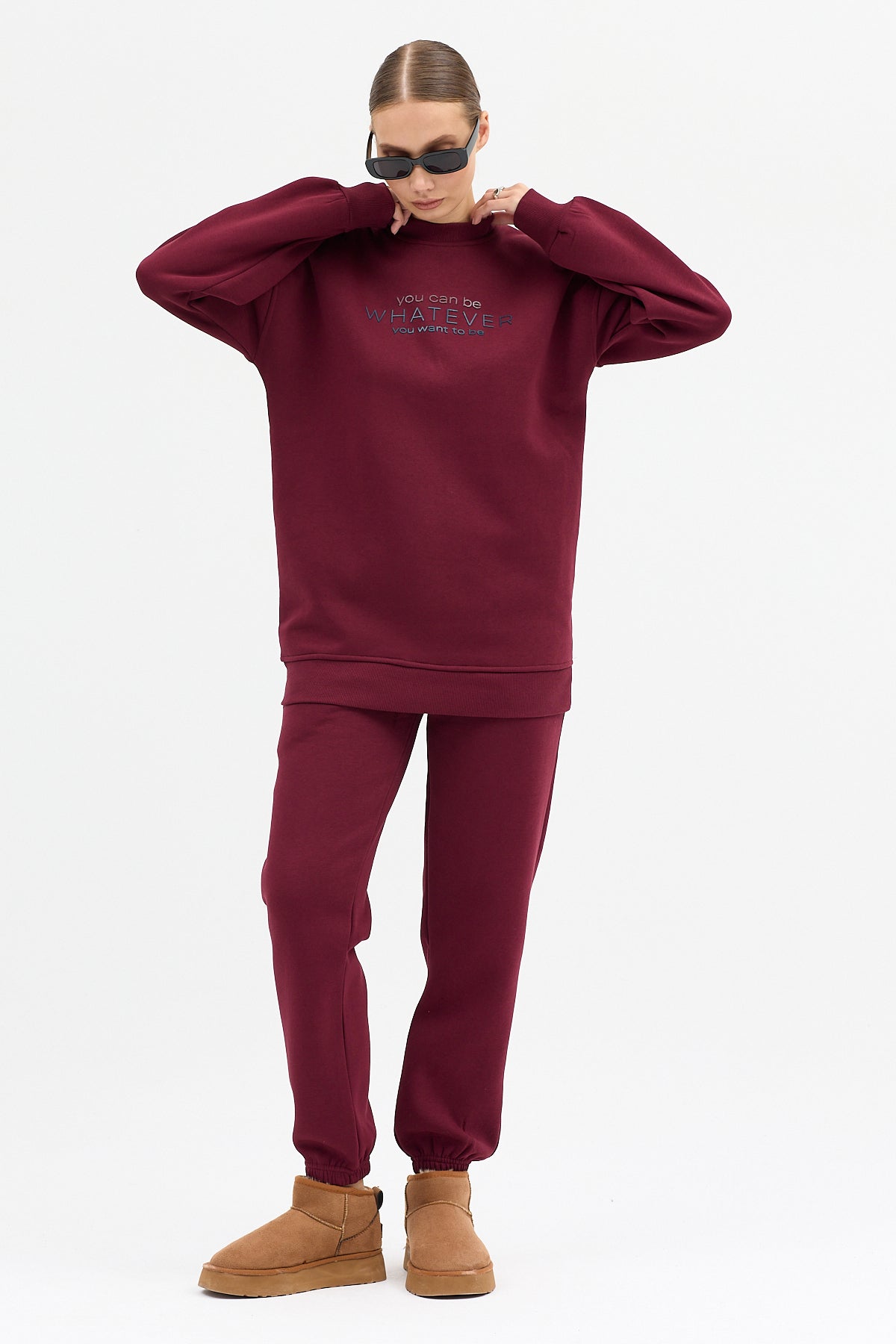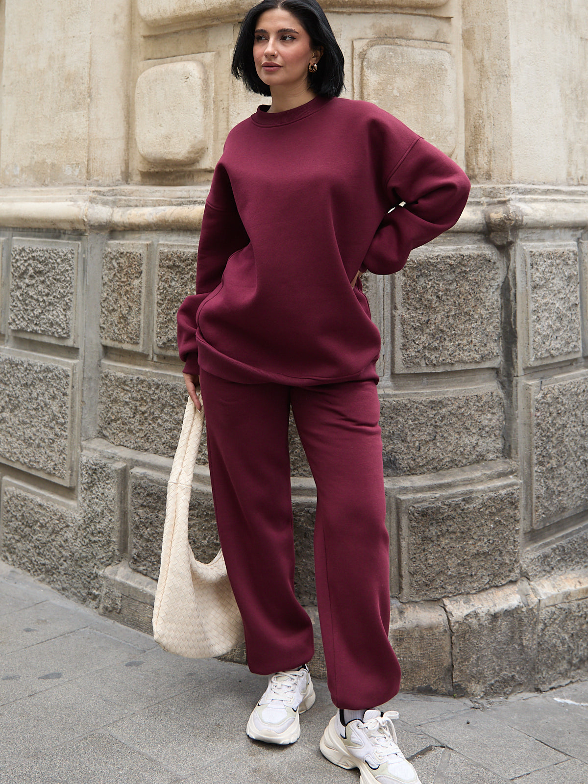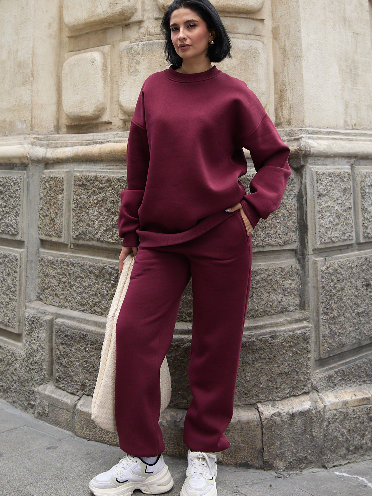Kadın Oversize Kapüşonlu Bordo Eşofman Takımı Kışlık Içi Pamuklu
