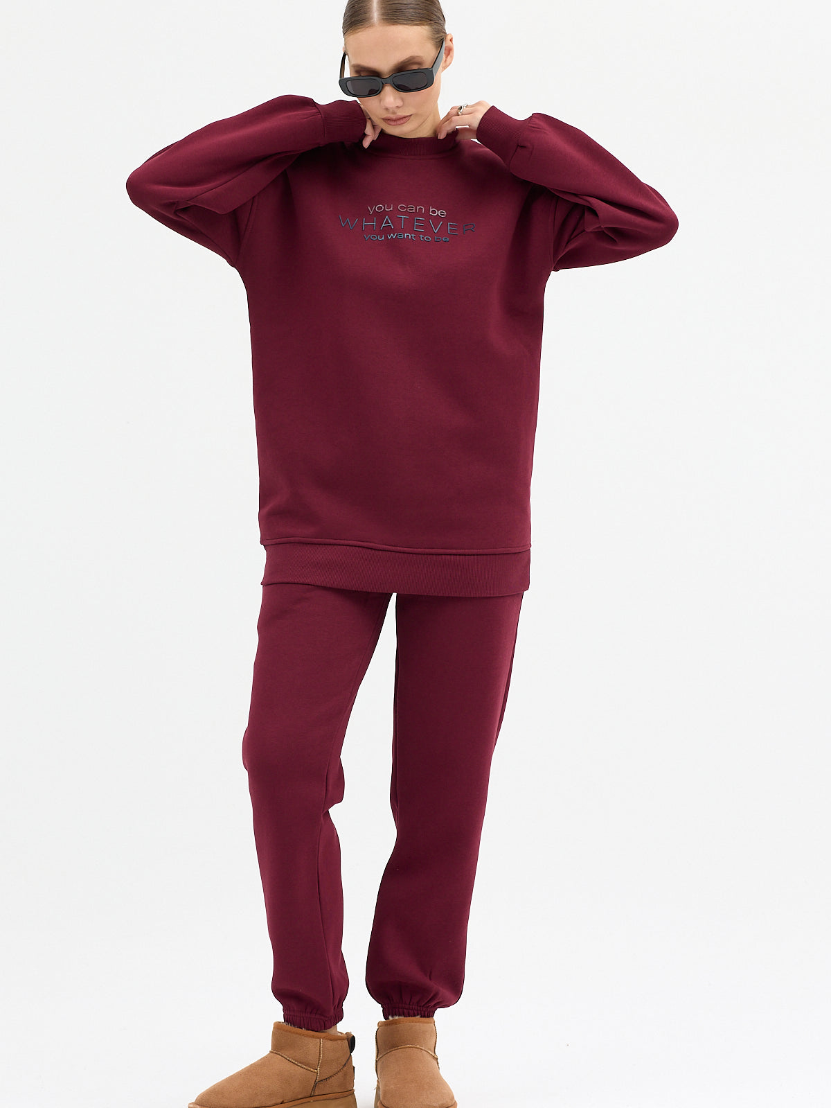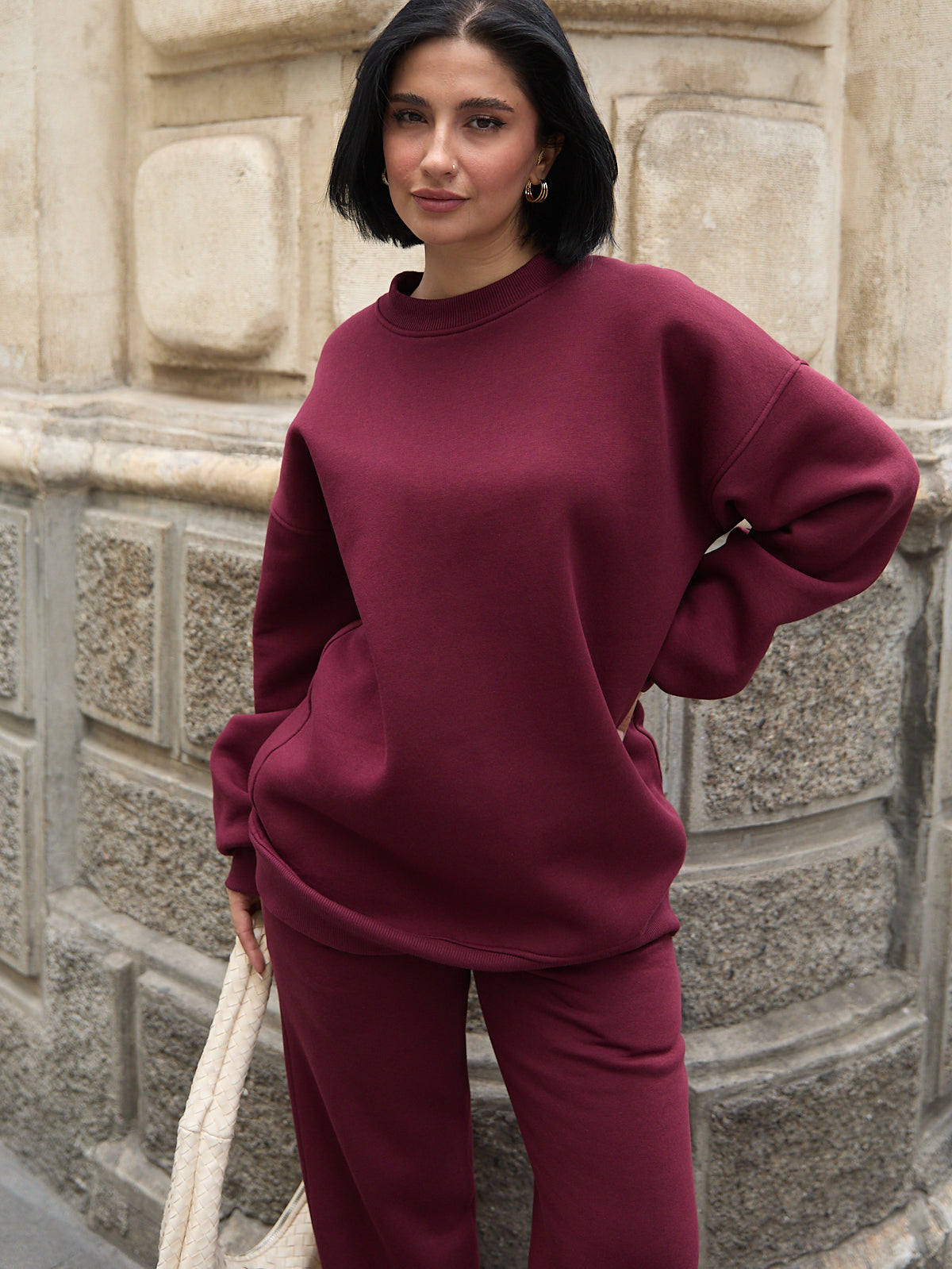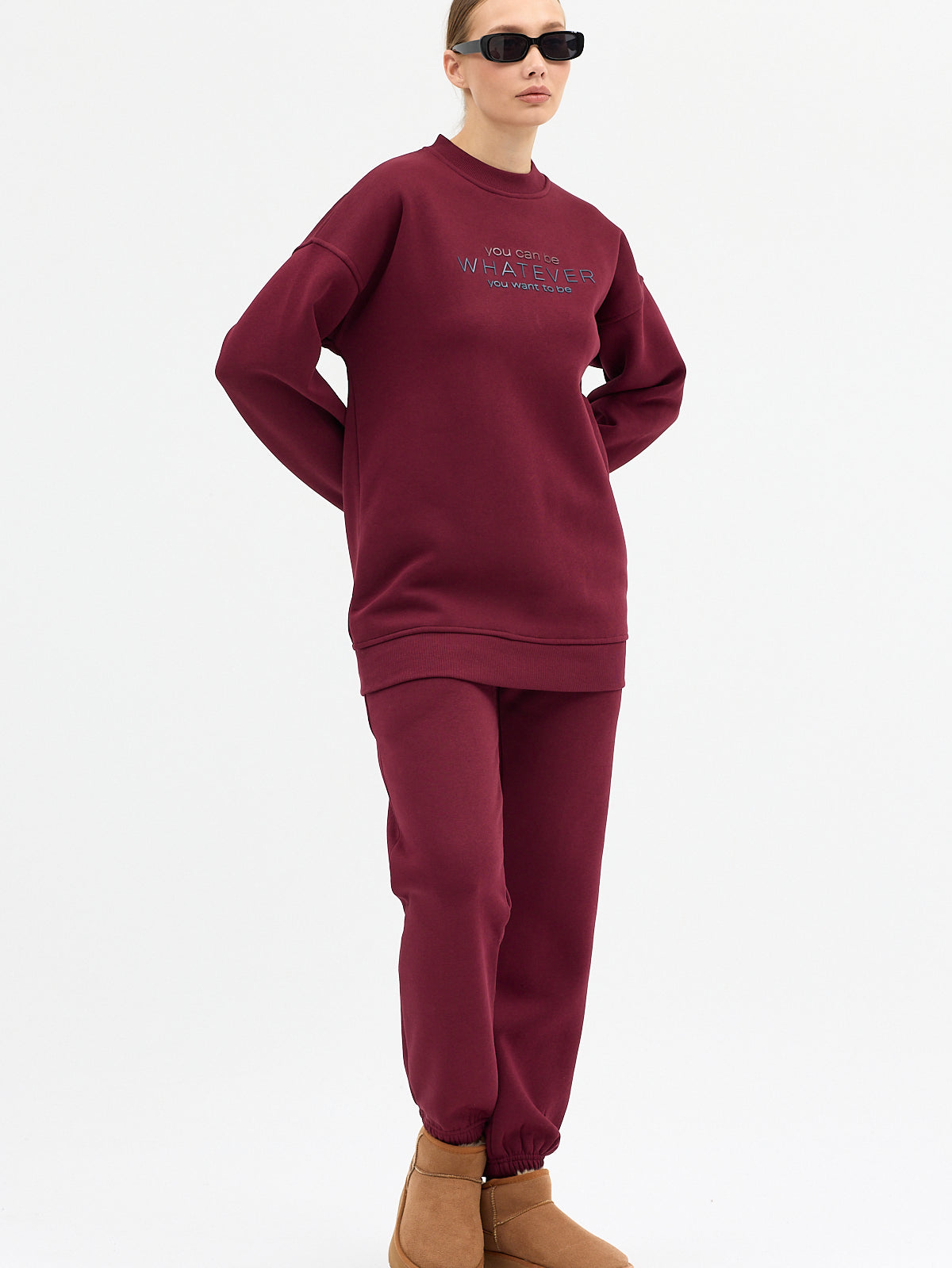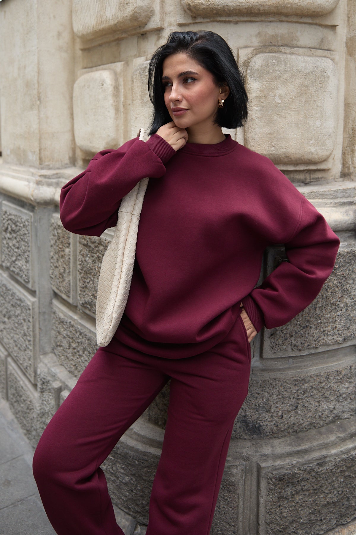 Kadın Oversize Kapüşonlu Bordo Eşofman Takımı Kışlık Içi Pamuklu