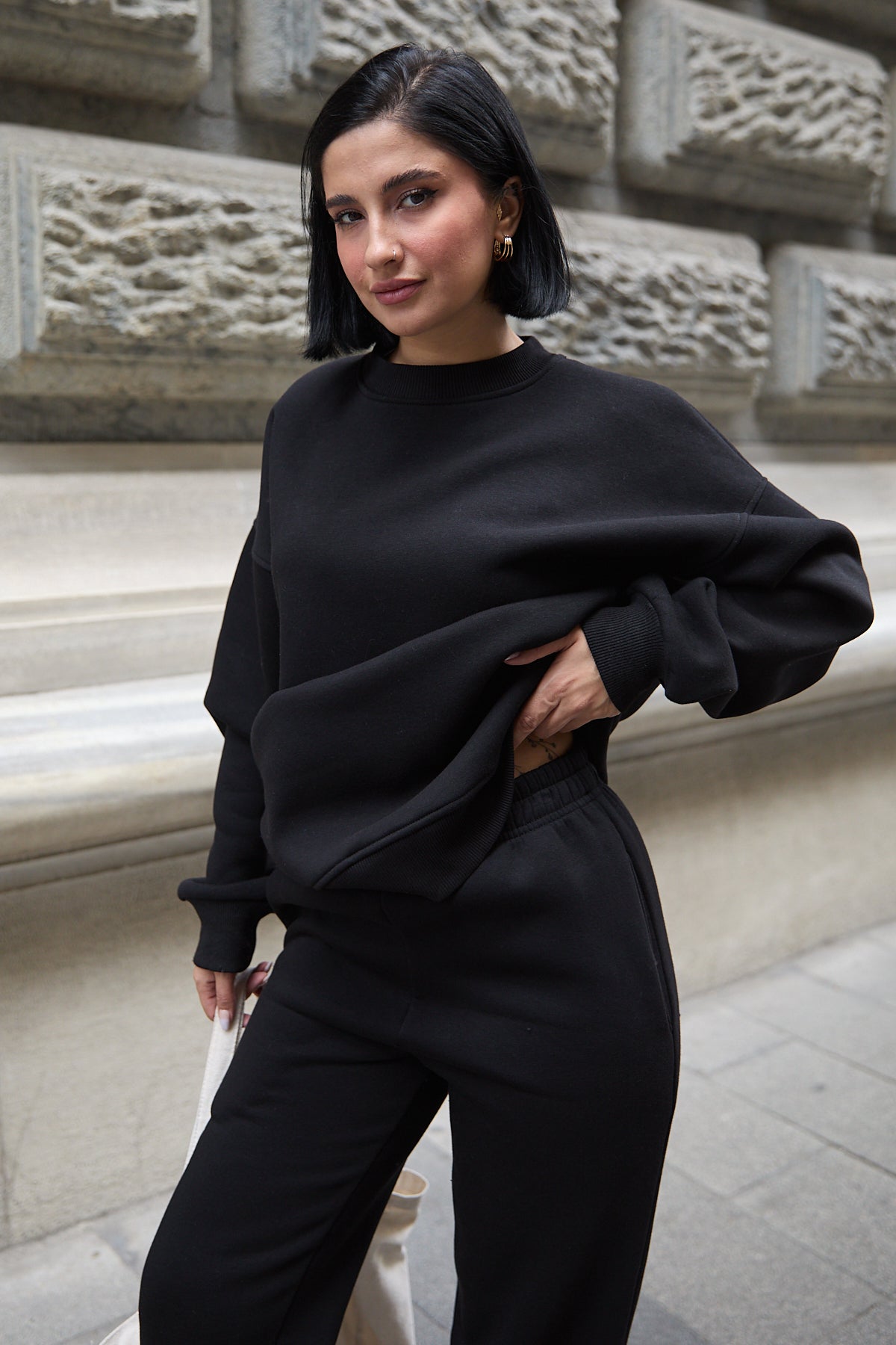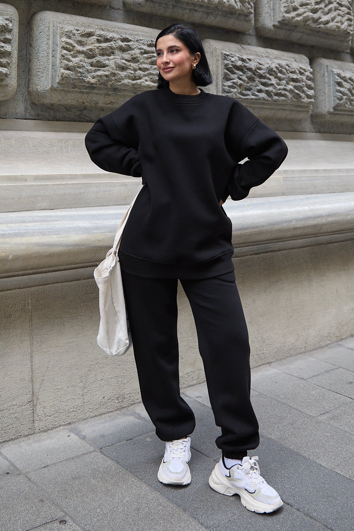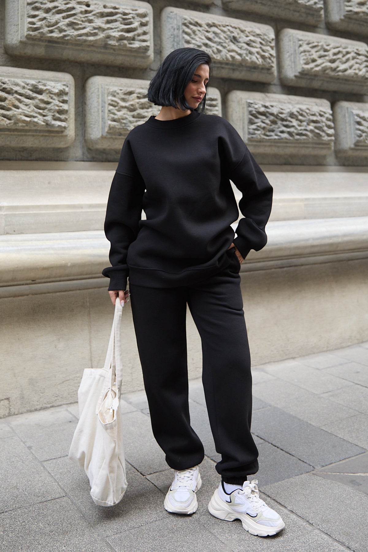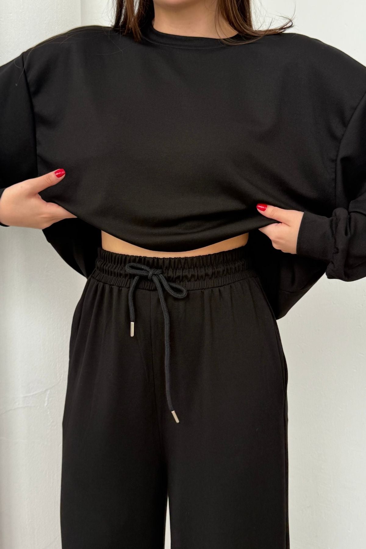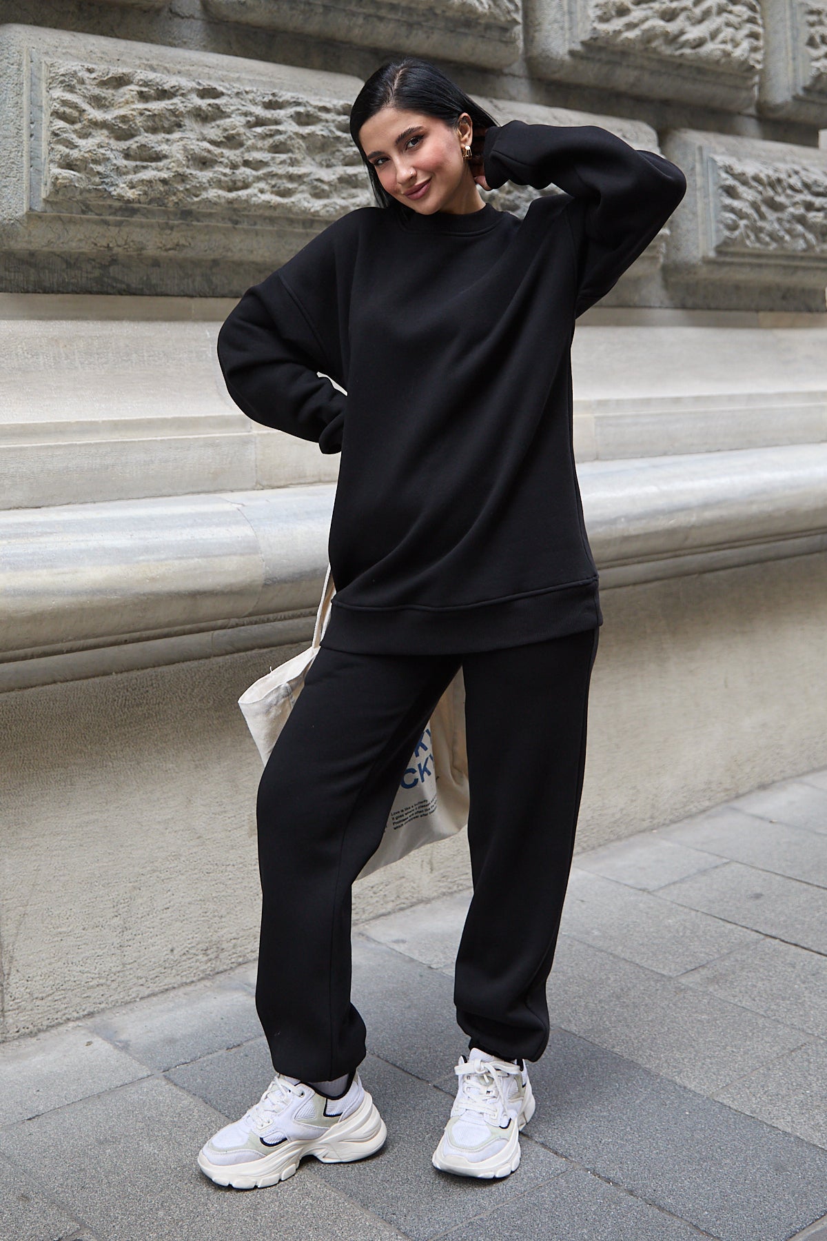 Regular Fit 2'li Takım Sweatshirt Beli Lastikli Jogger Siyah Eşofman Altı