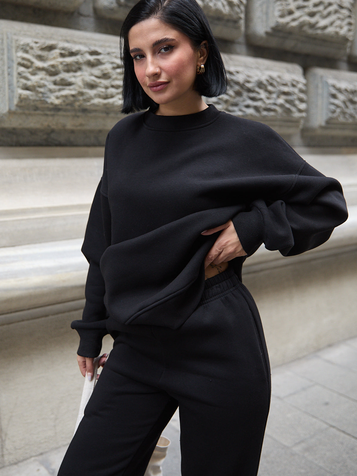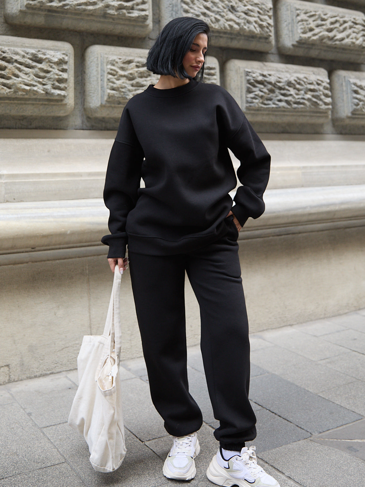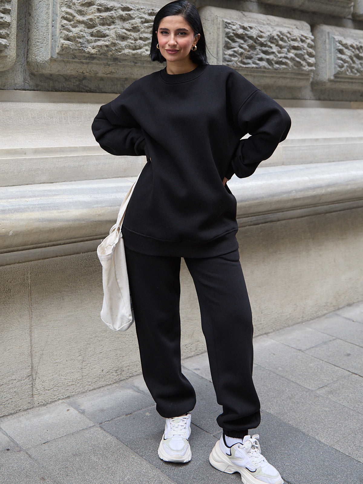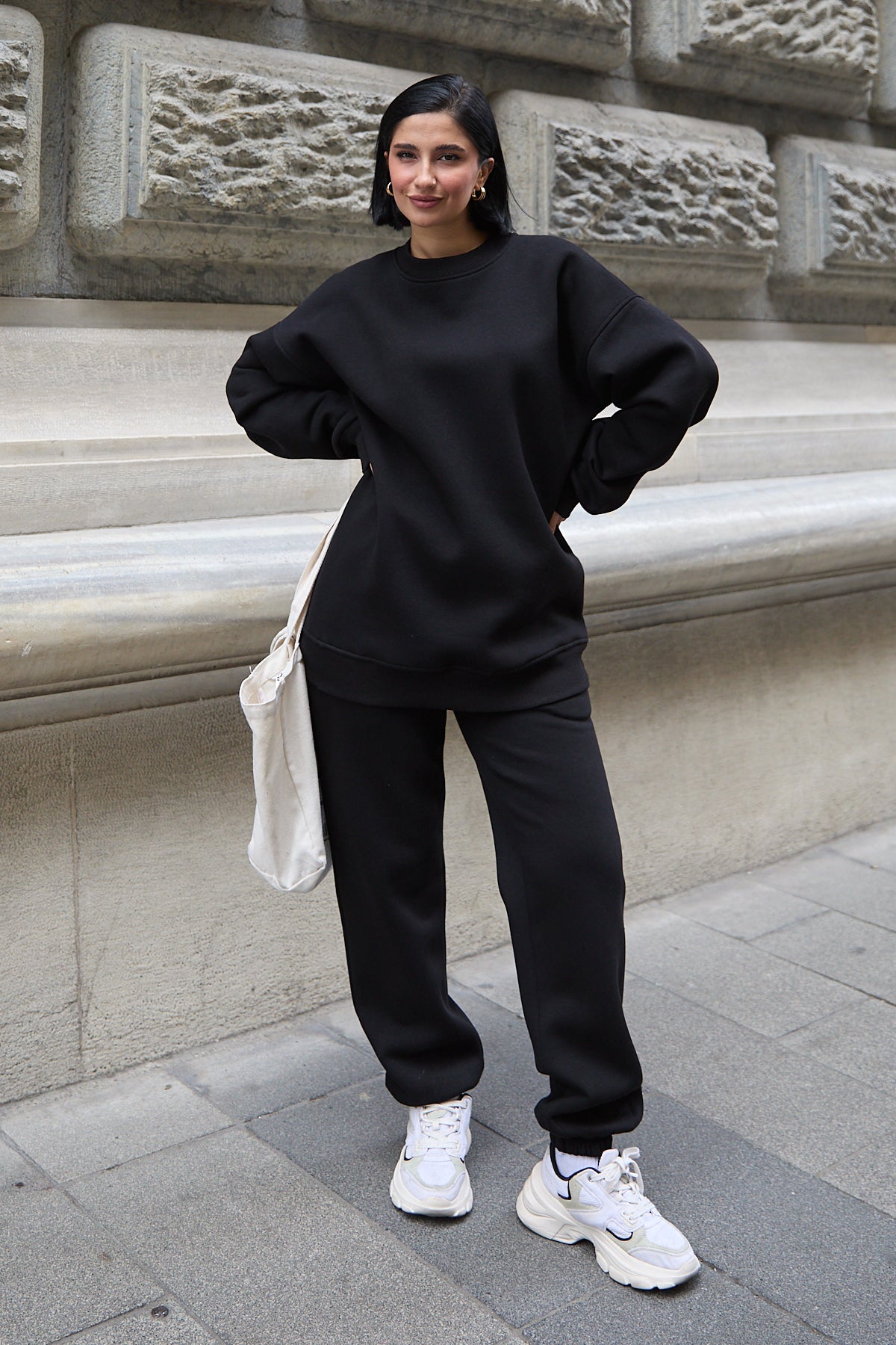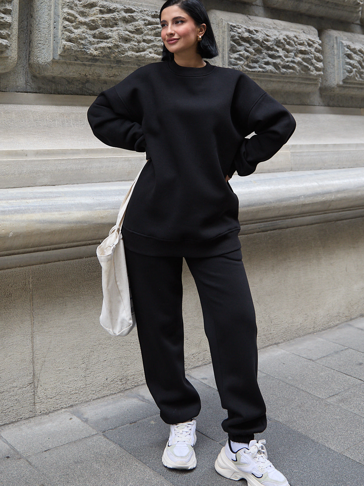 Regular Fit 2'li Takım Sweatshirt Beli Lastikli Jogger Siyah Eşofman Altı