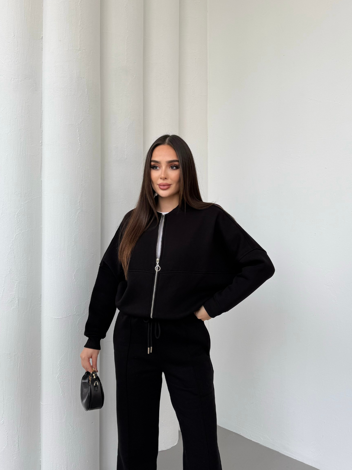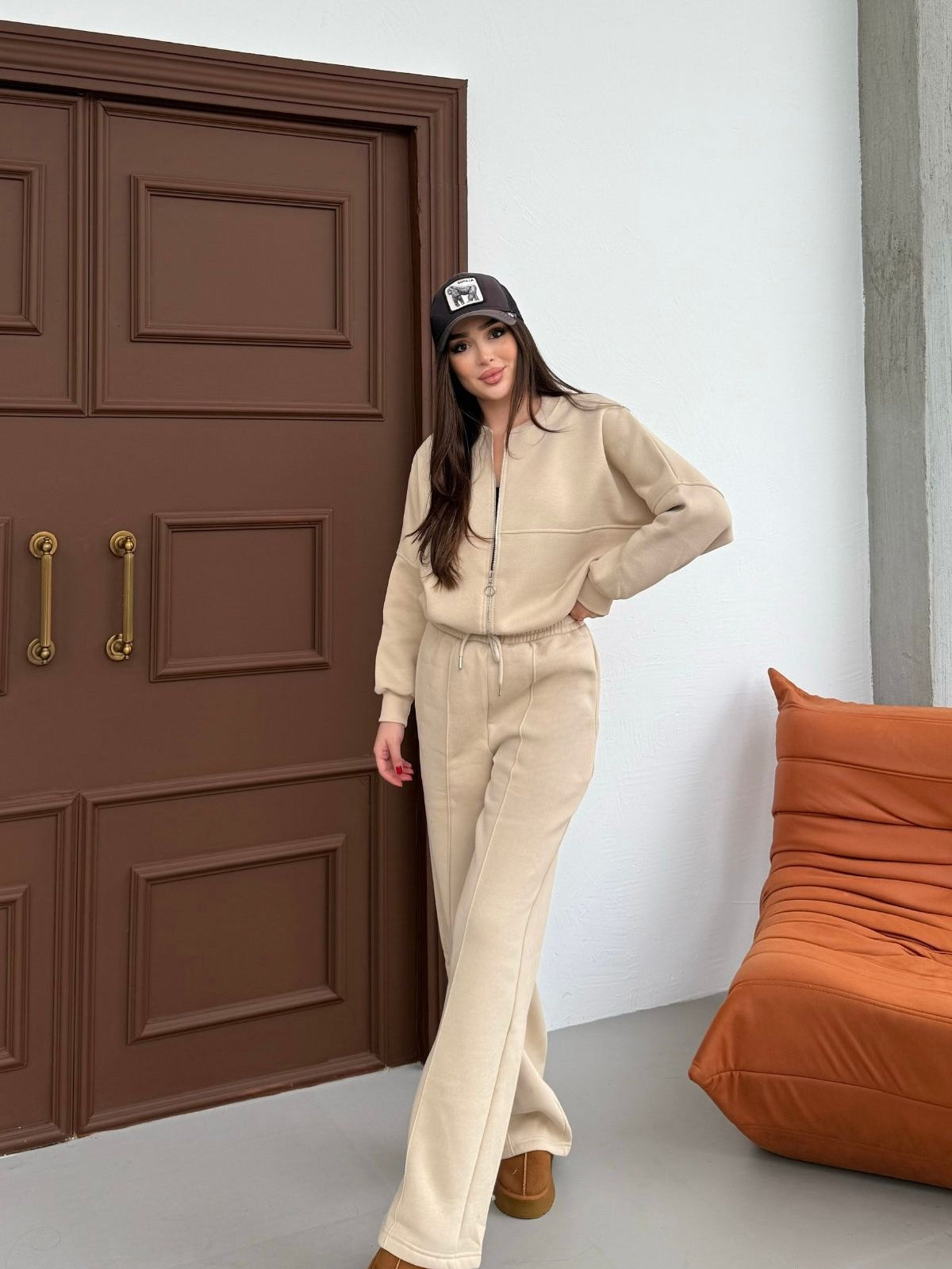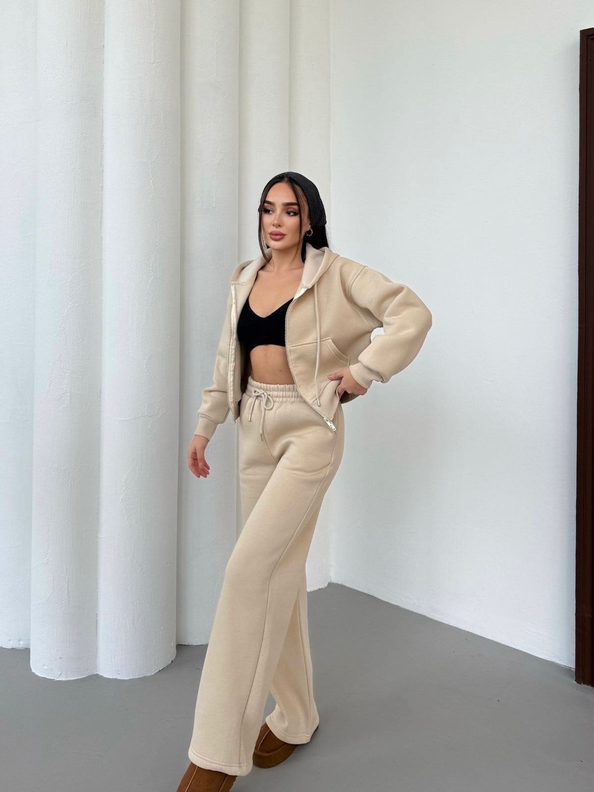 Kadın Çift Fermuar Detaylı Kapüşonlu Kışlık Şardonlu Oversize Eşofman Takımı