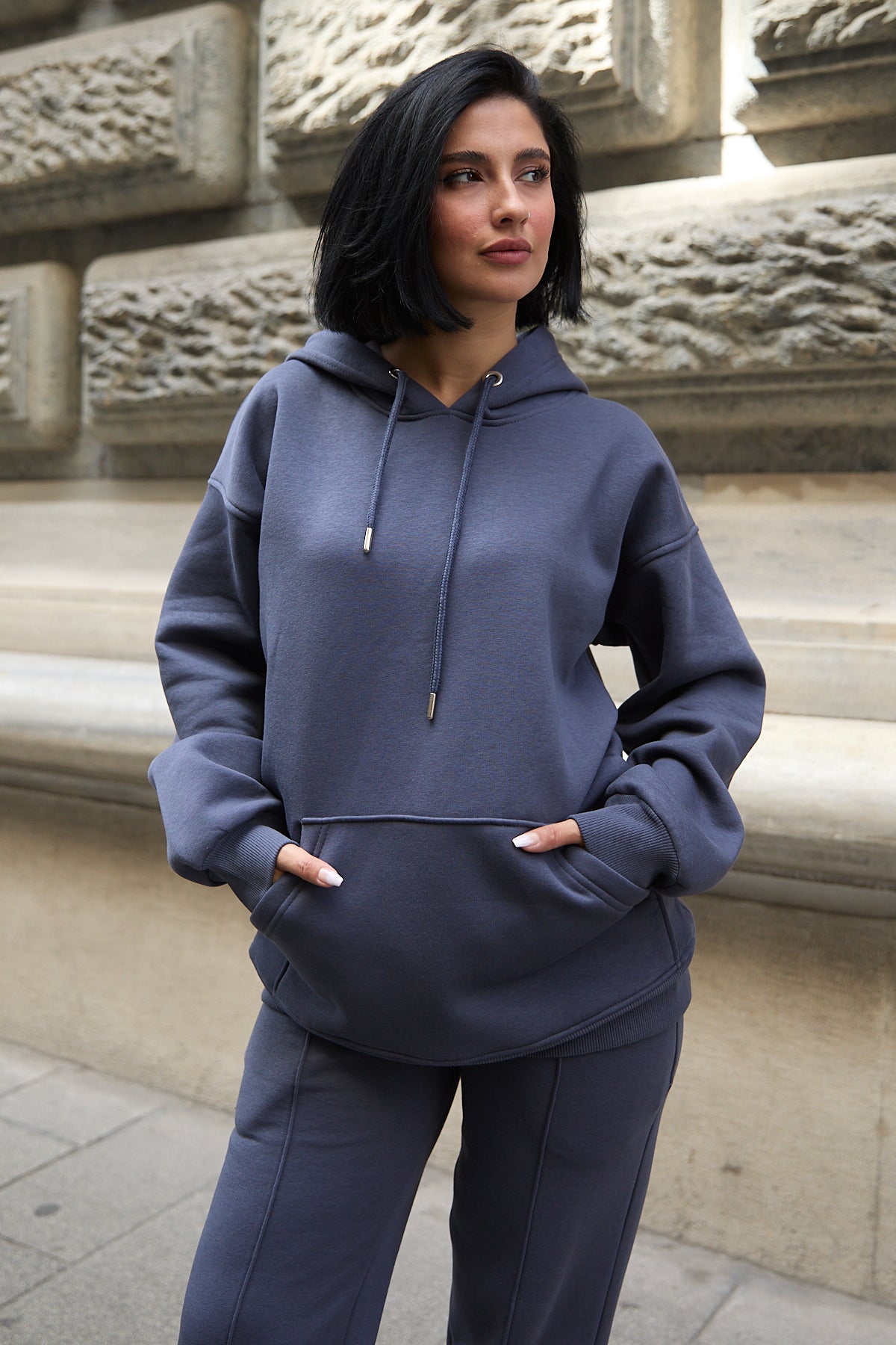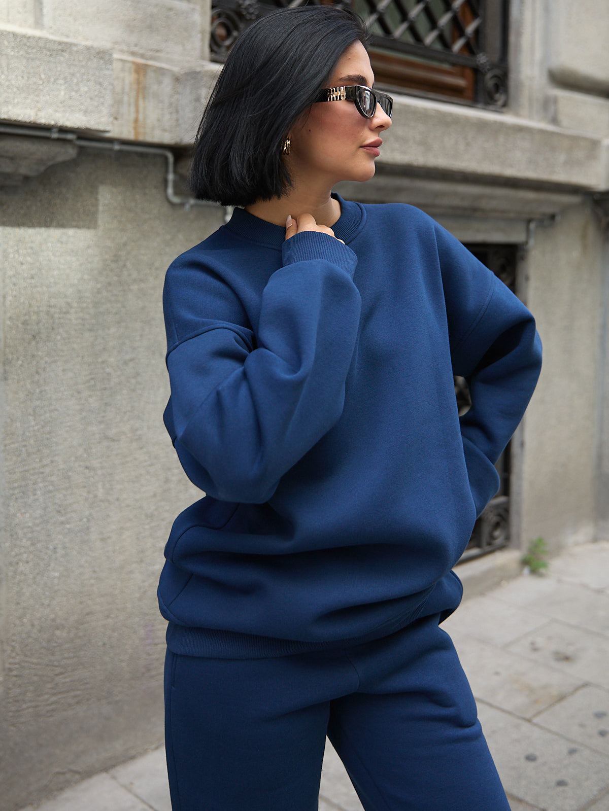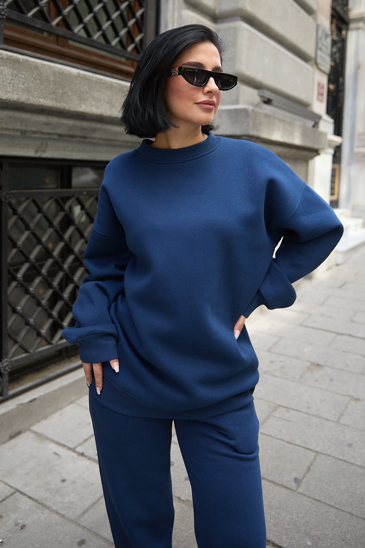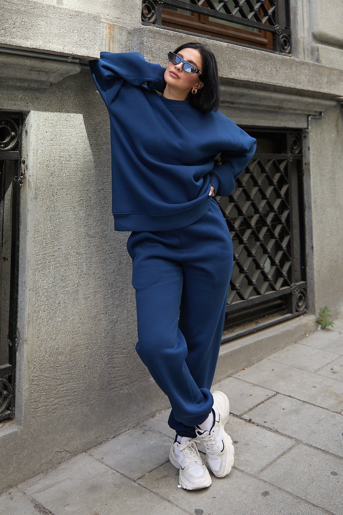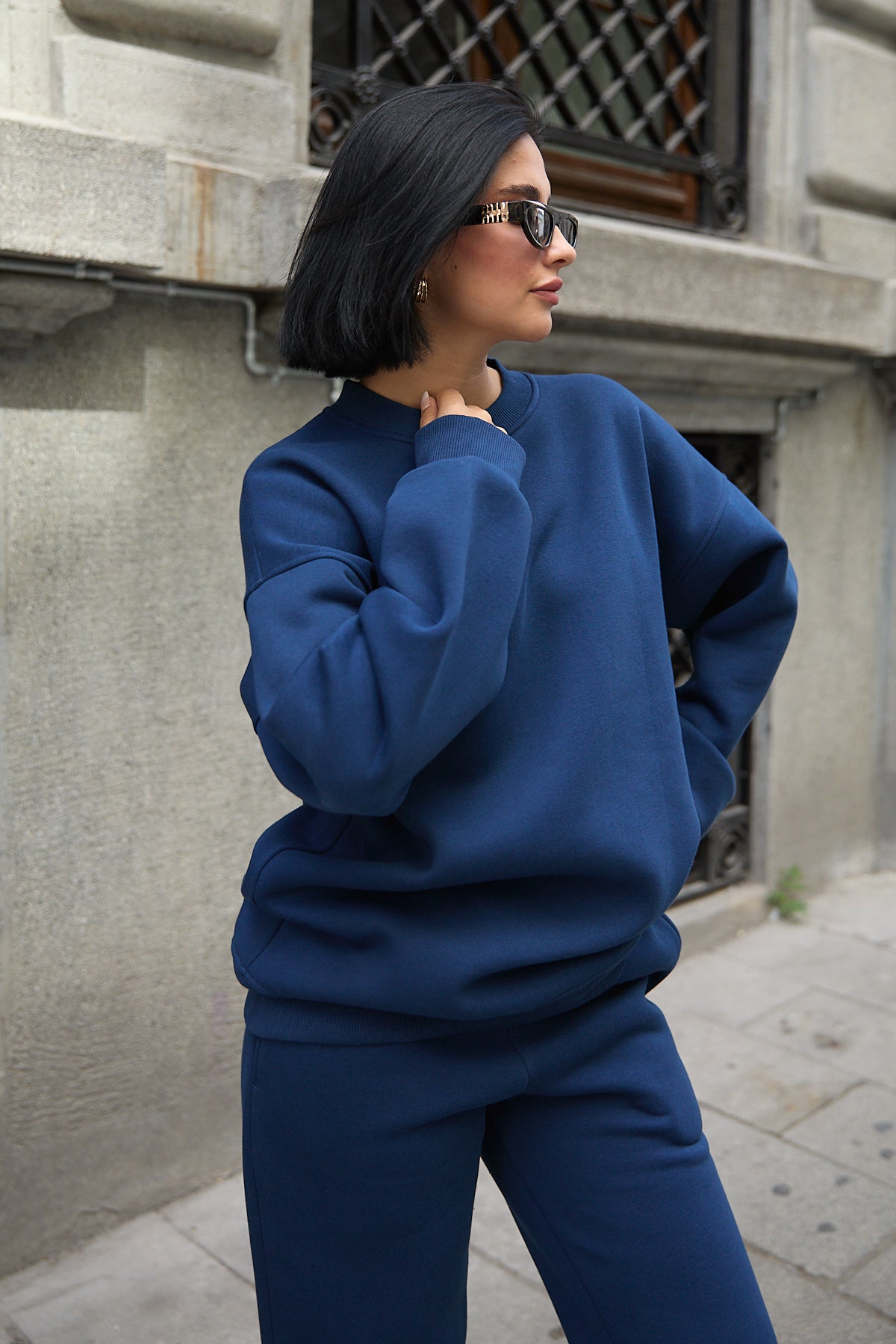 Kadın Oversize Kapüşonlu Lacivert Eşofman Takımı Kışlık Içi Pamuklu