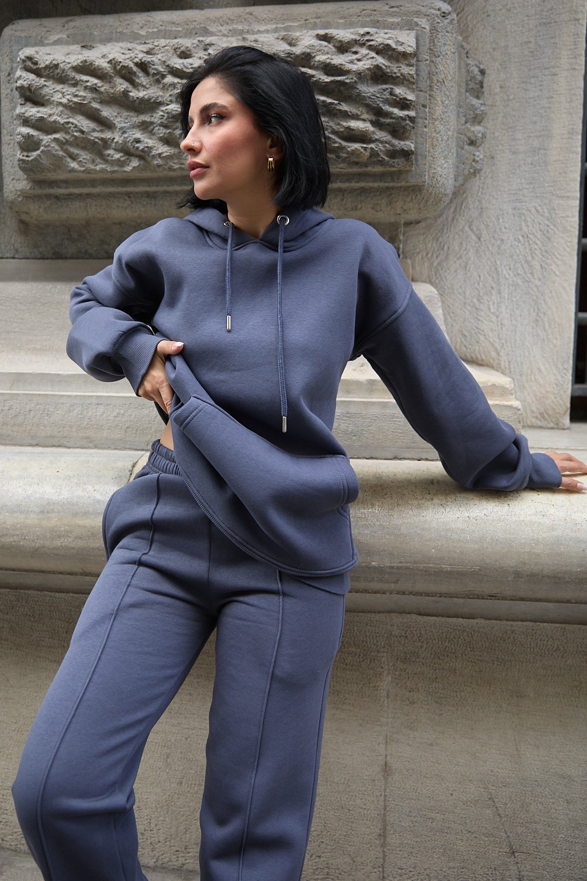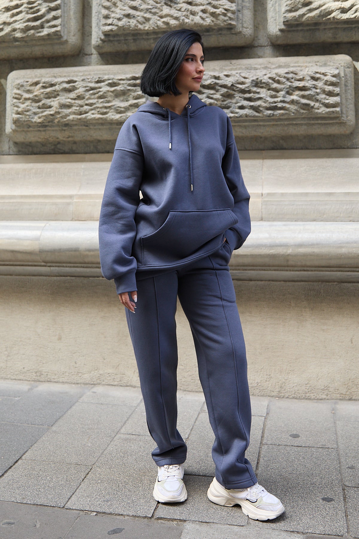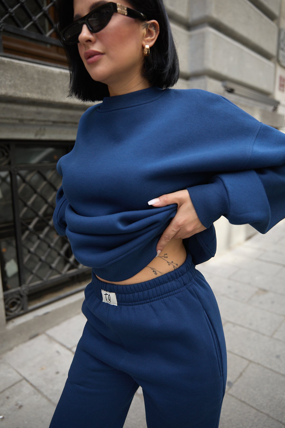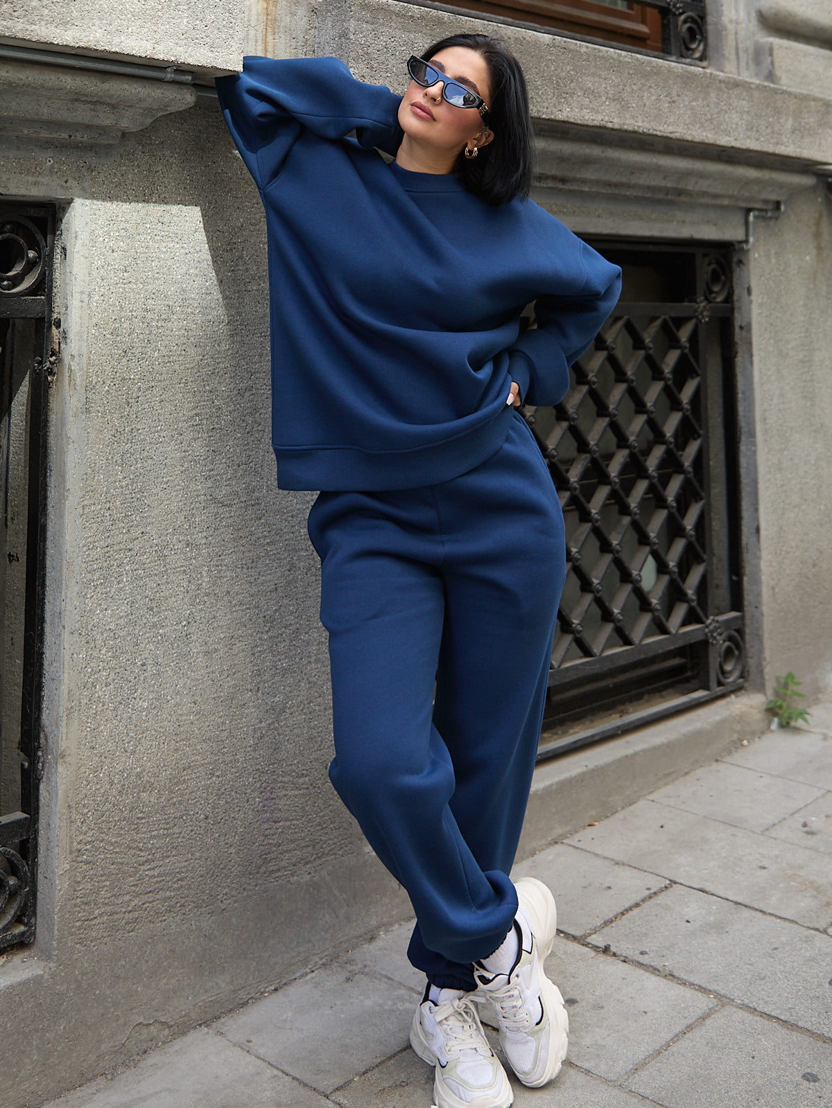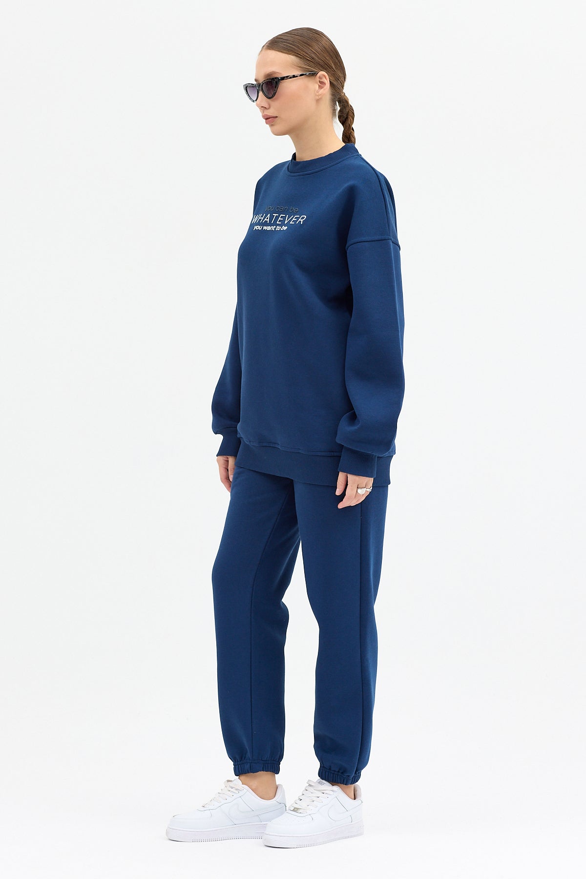 Kadın Oversize Kapüşonlu Lacivert Eşofman Takımı Kışlık Içi Pamuklu