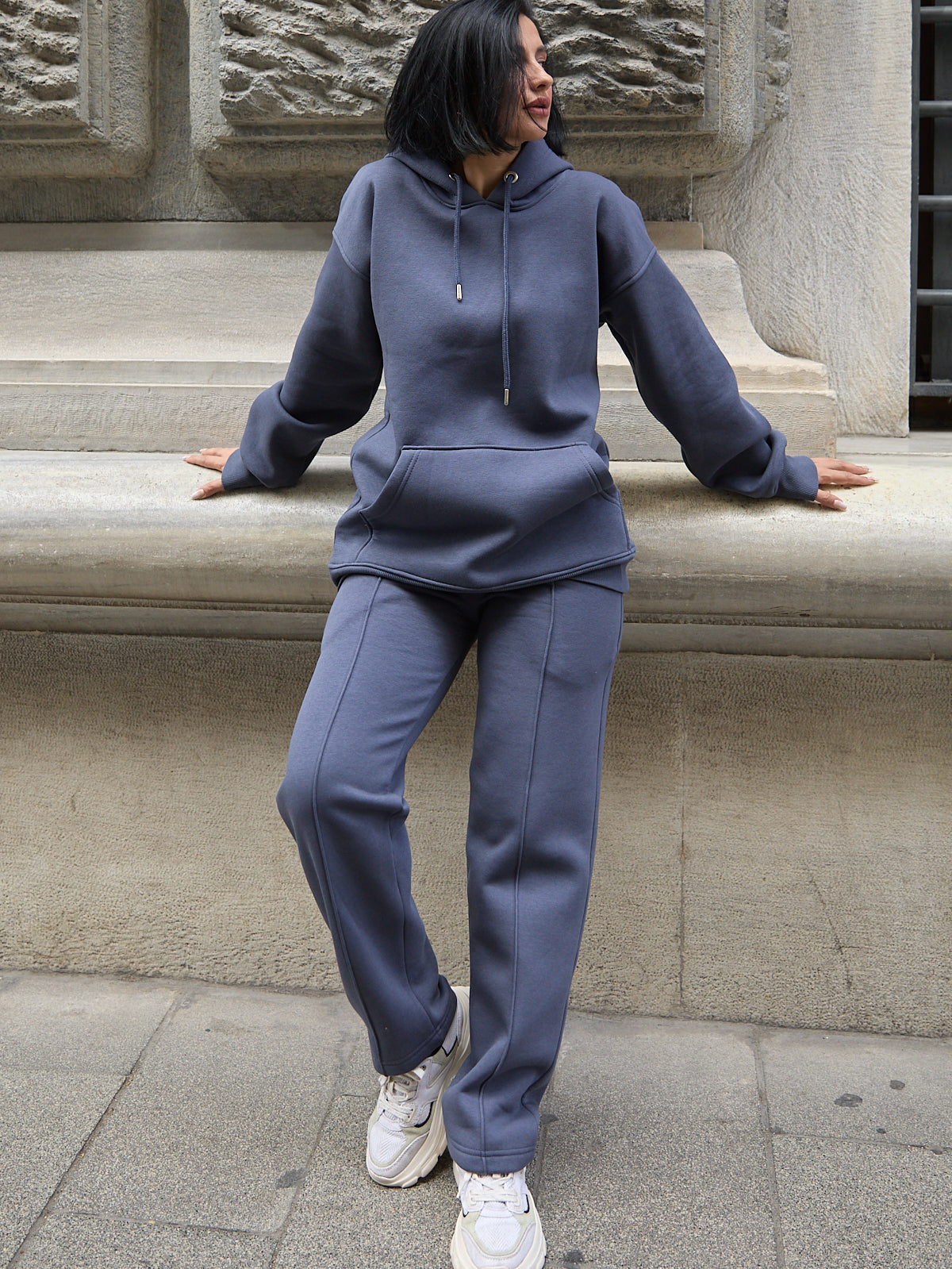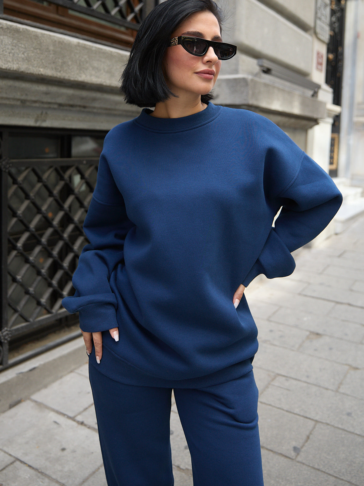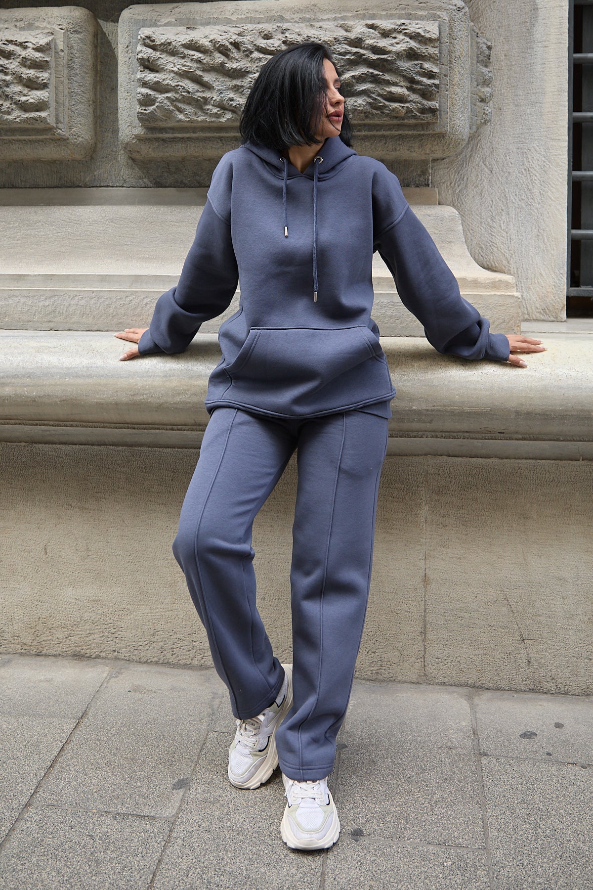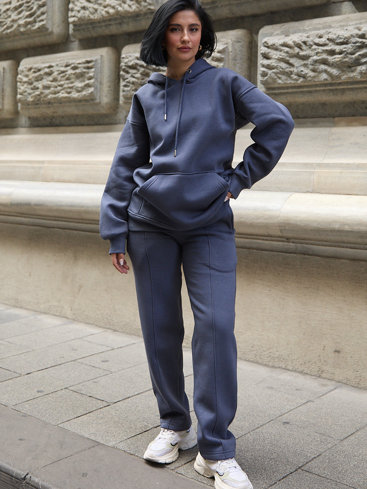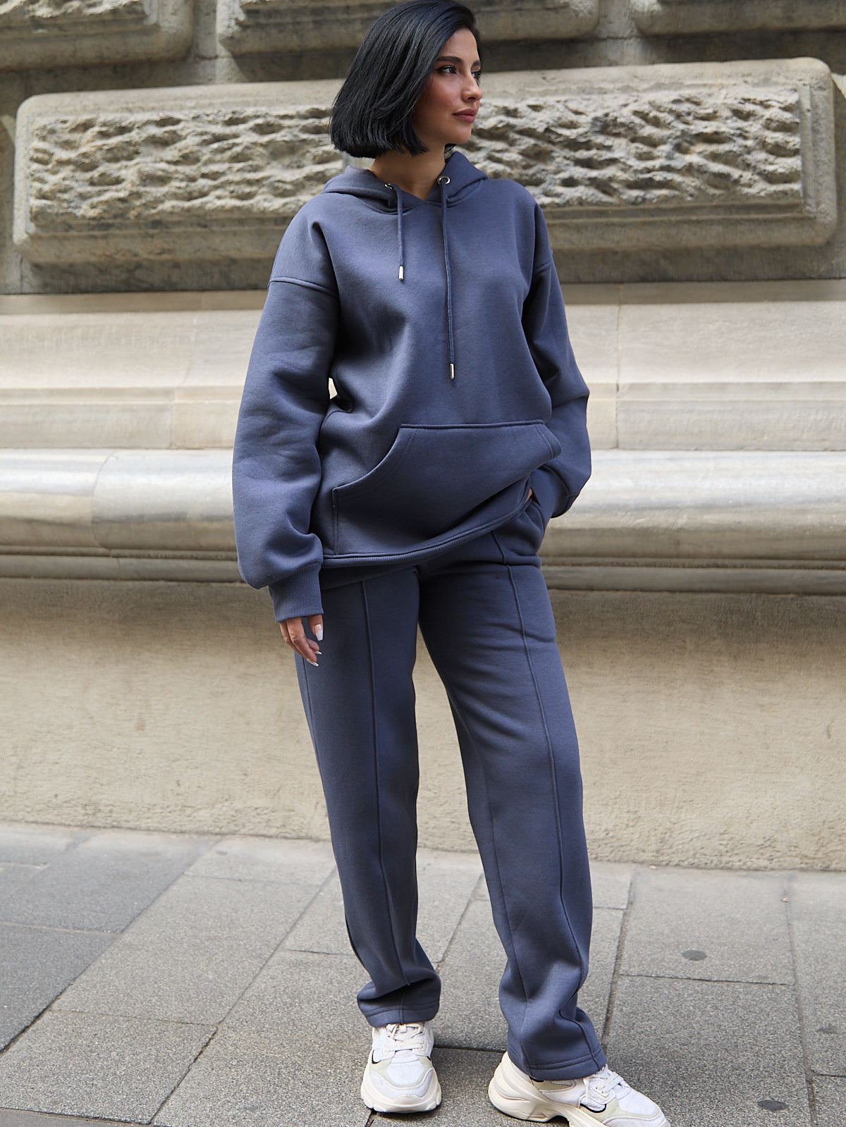 Kadın Oversize Kapüşonlu Lacivert Eşofman Takımı Kışlık Içi Pamuklu