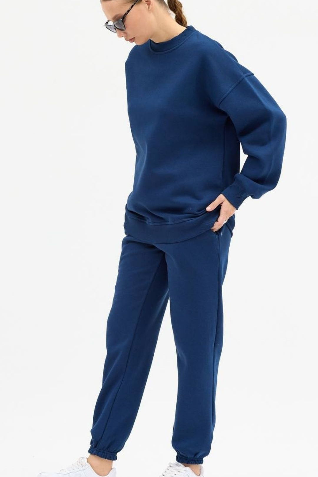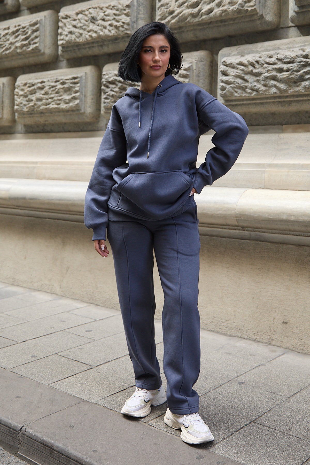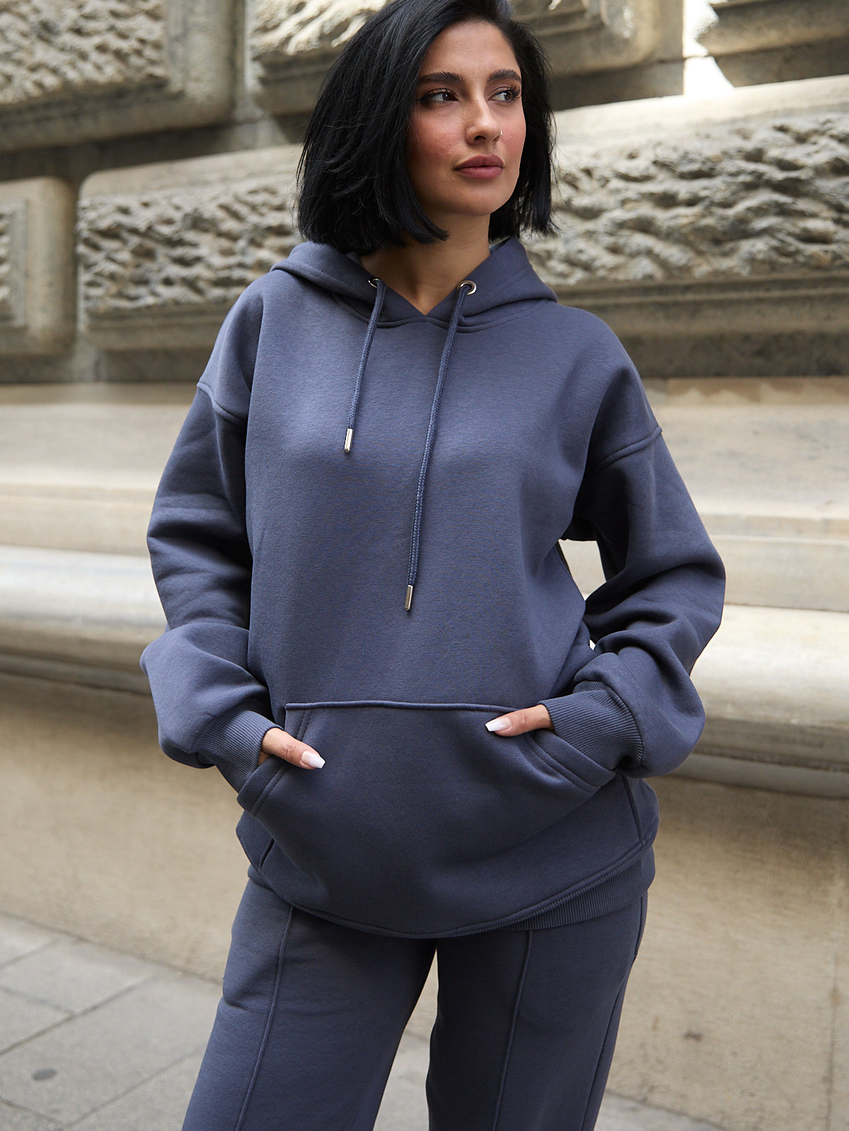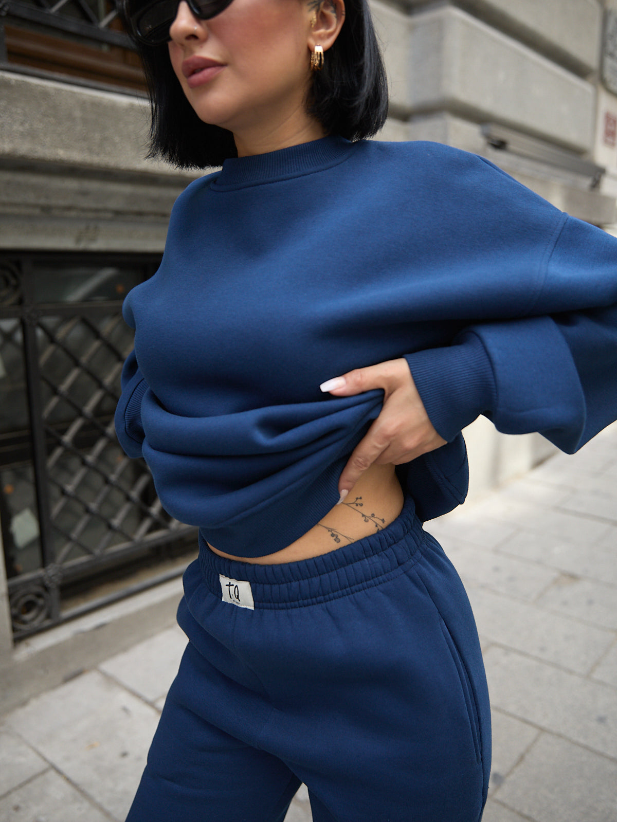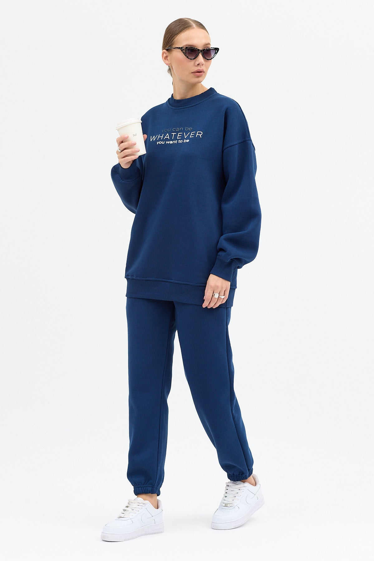 Kadın Oversize Kapüşonlu Lacivert Eşofman Takımı Kışlık Içi Pamuklu