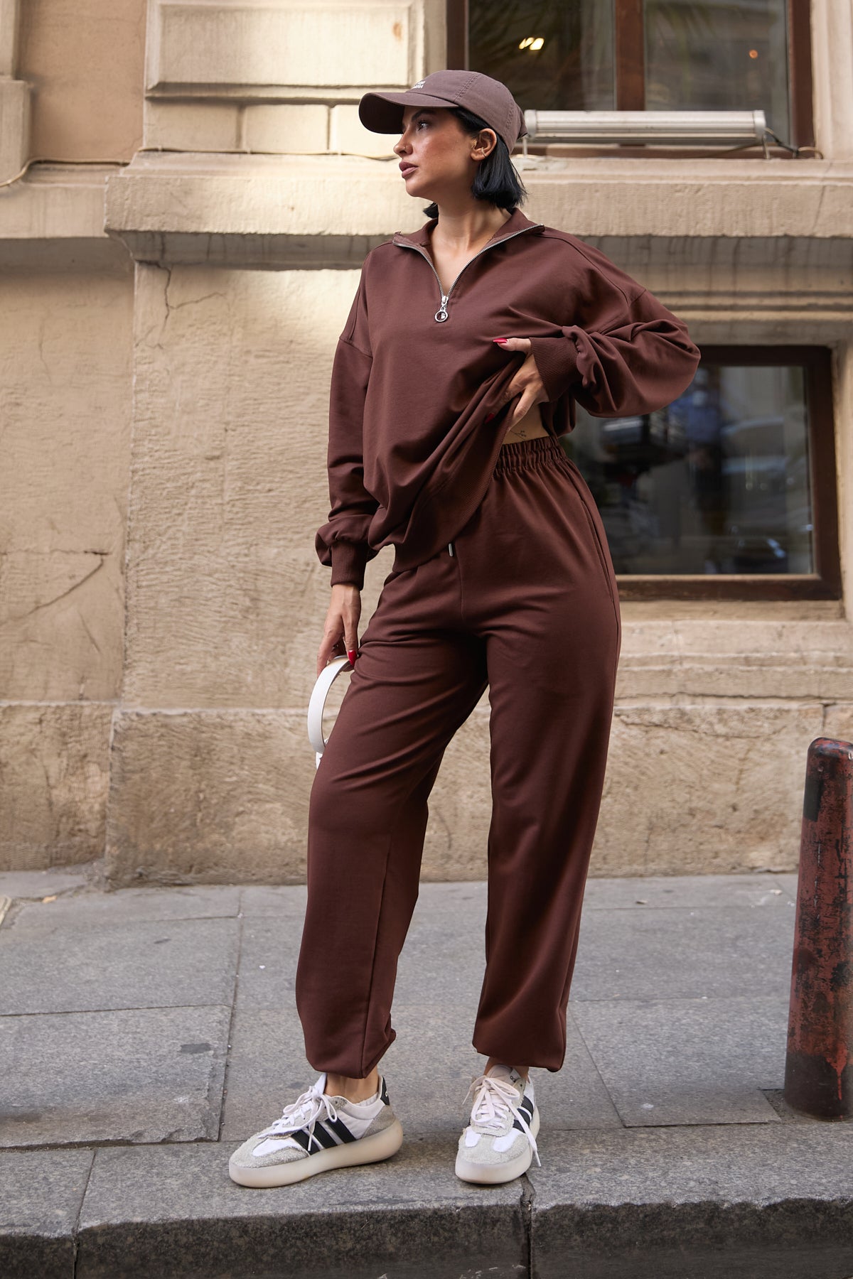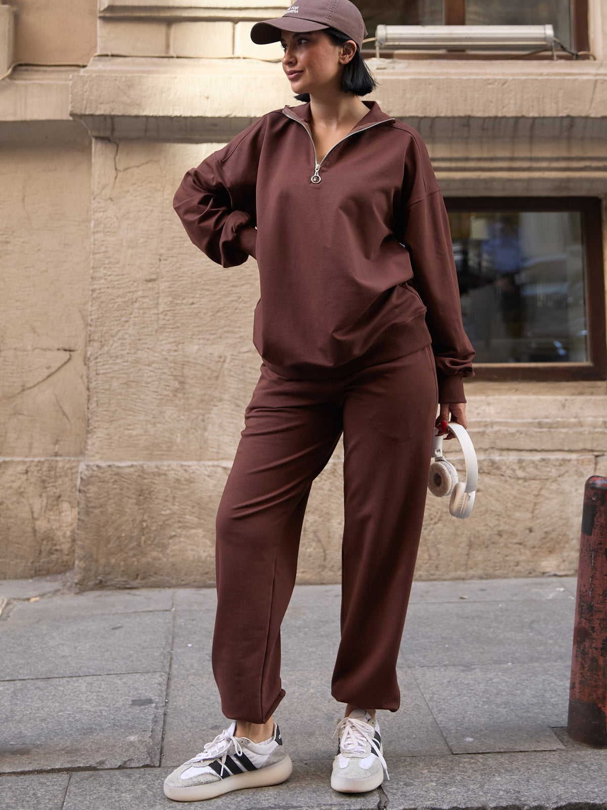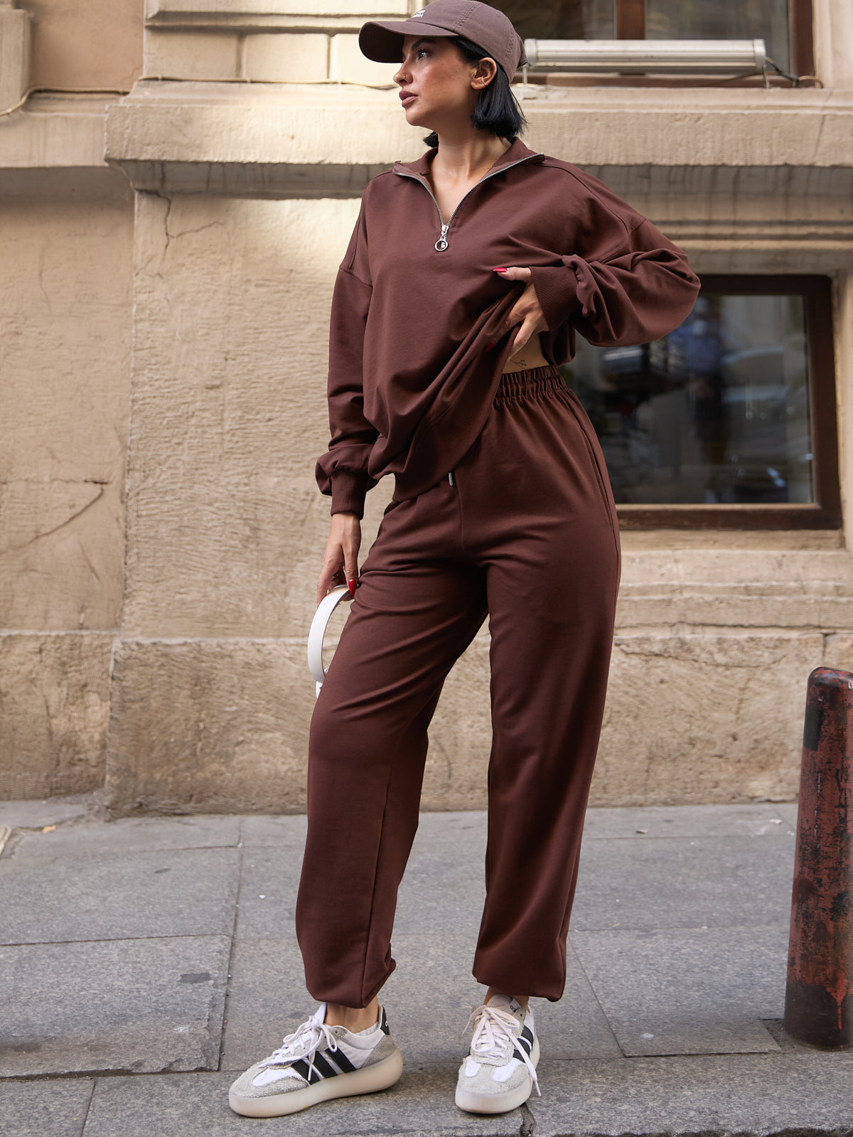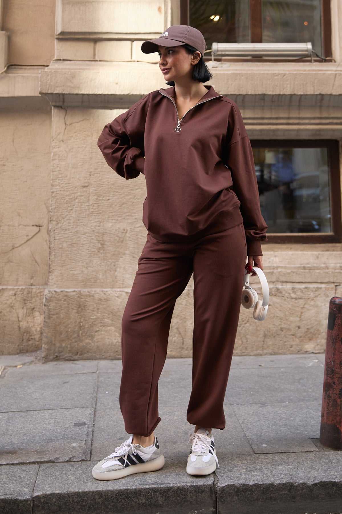 Kadın Yarım Fermuarlı Sweatshırt Ve Paçası Lastikli Kahverengi Eşofman Takımı