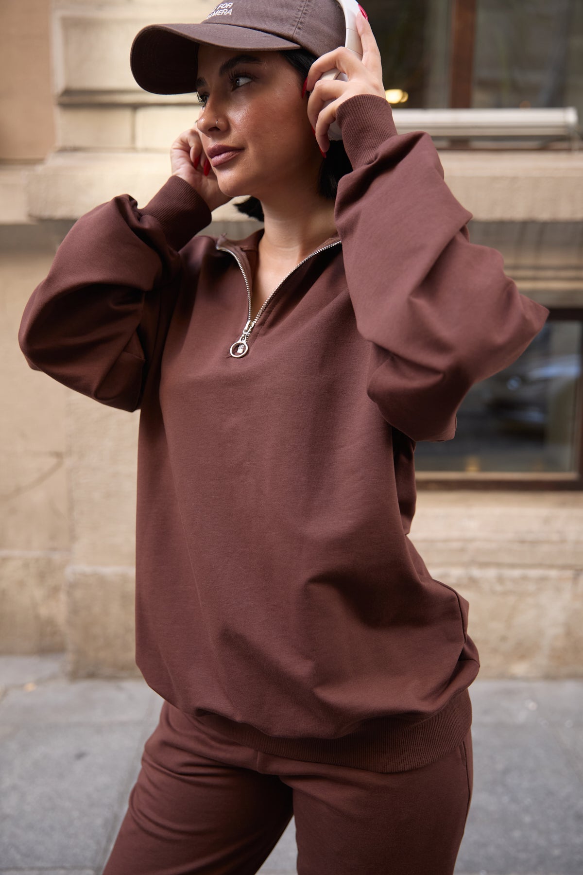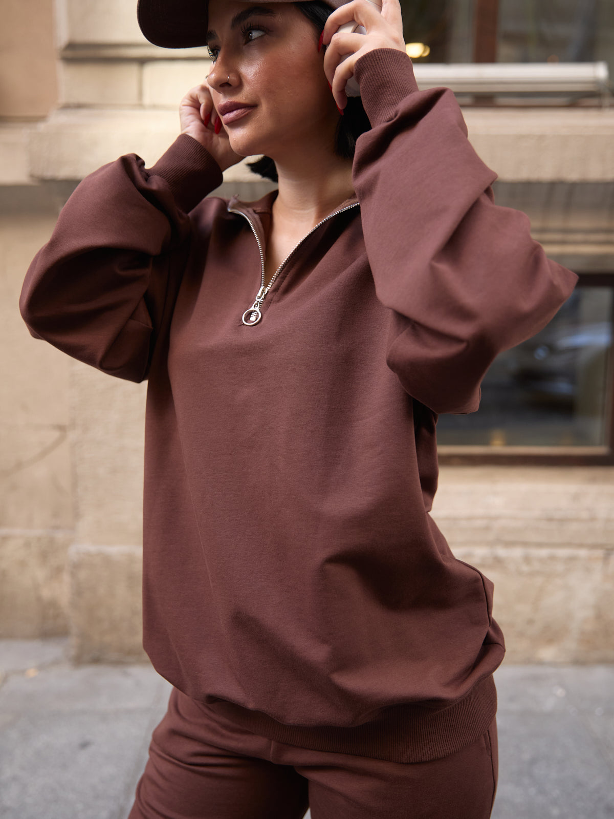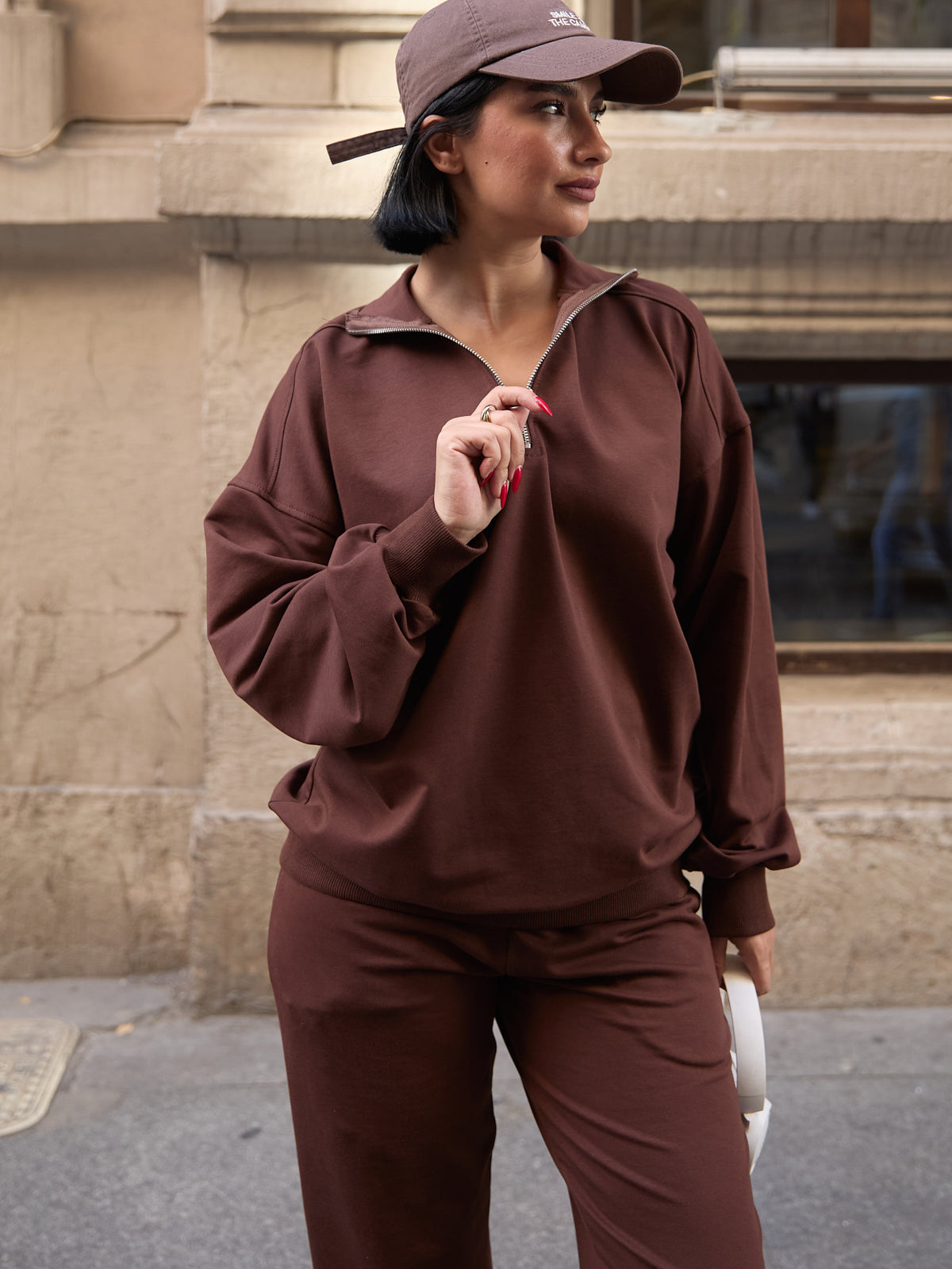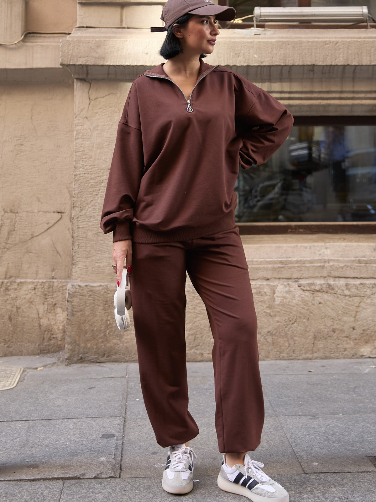 Kadın Yarım Fermuarlı Sweatshırt Ve Paçası Lastikli Kahverengi Eşofman Takımı