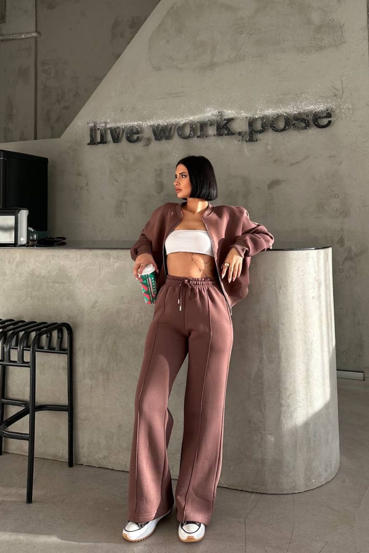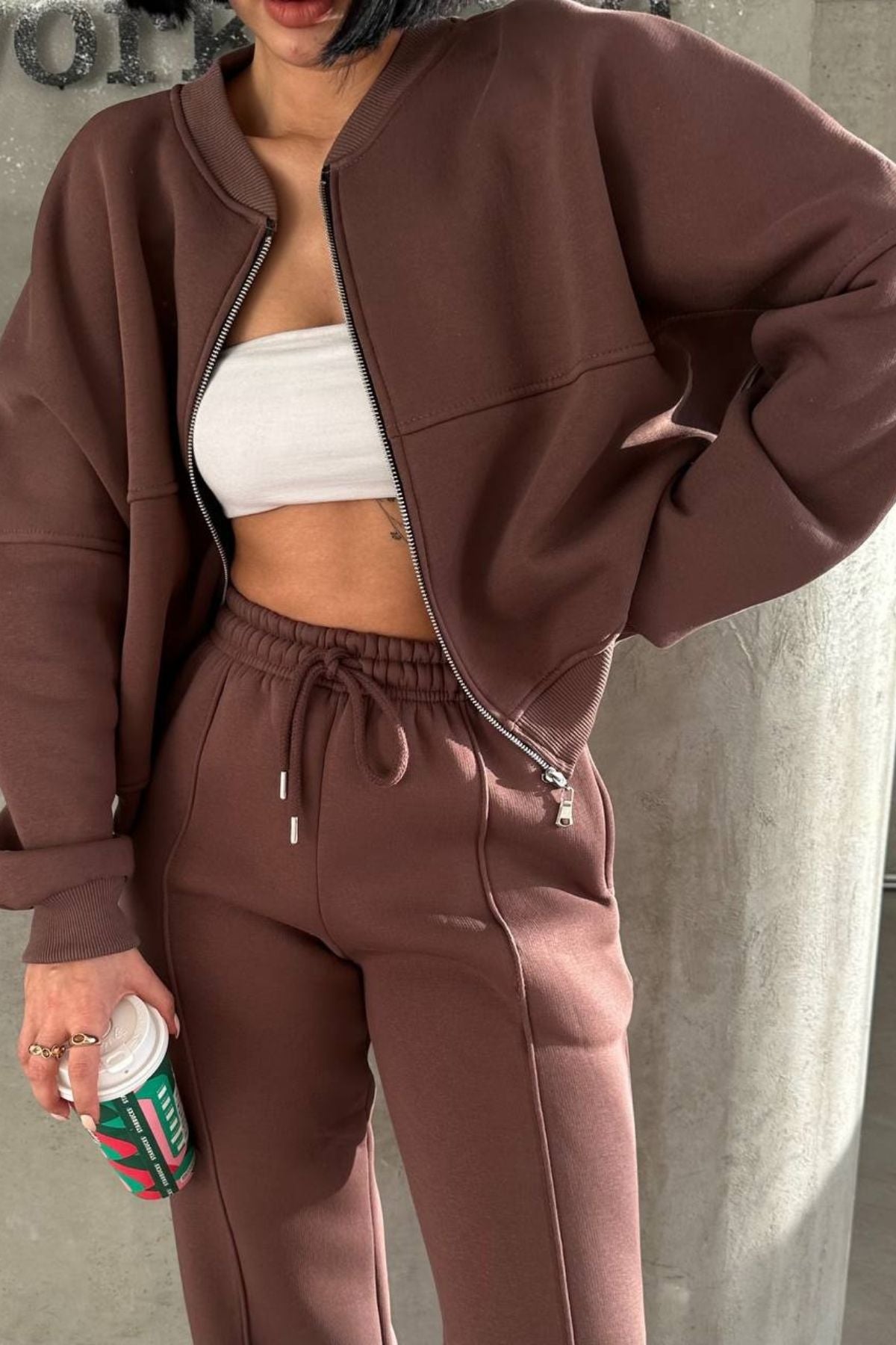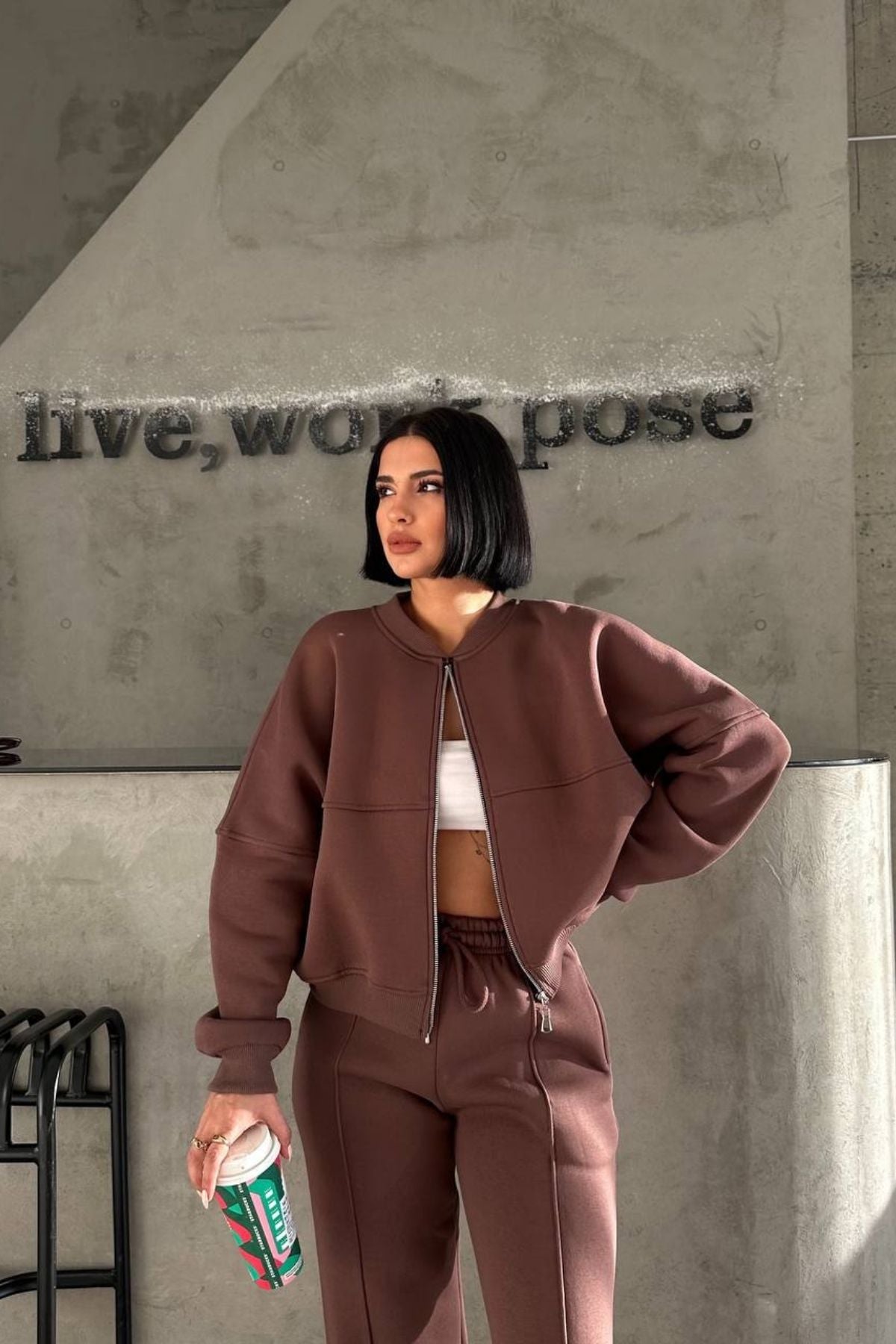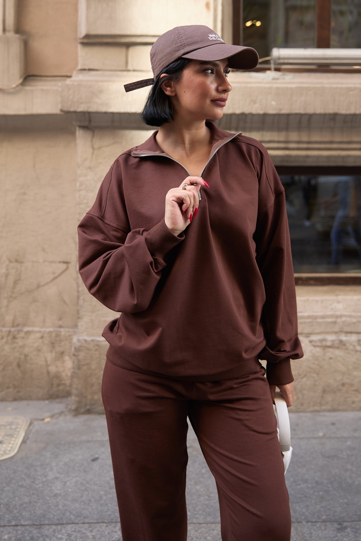 Kadın Yarım Fermuarlı Sweatshırt Ve Paçası Lastikli Kahverengi Eşofman Takımı