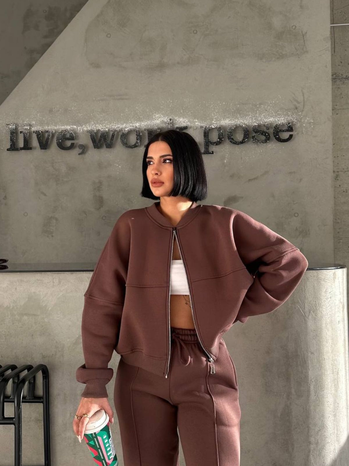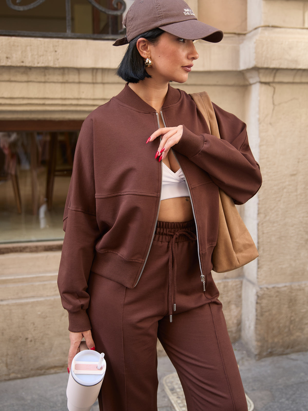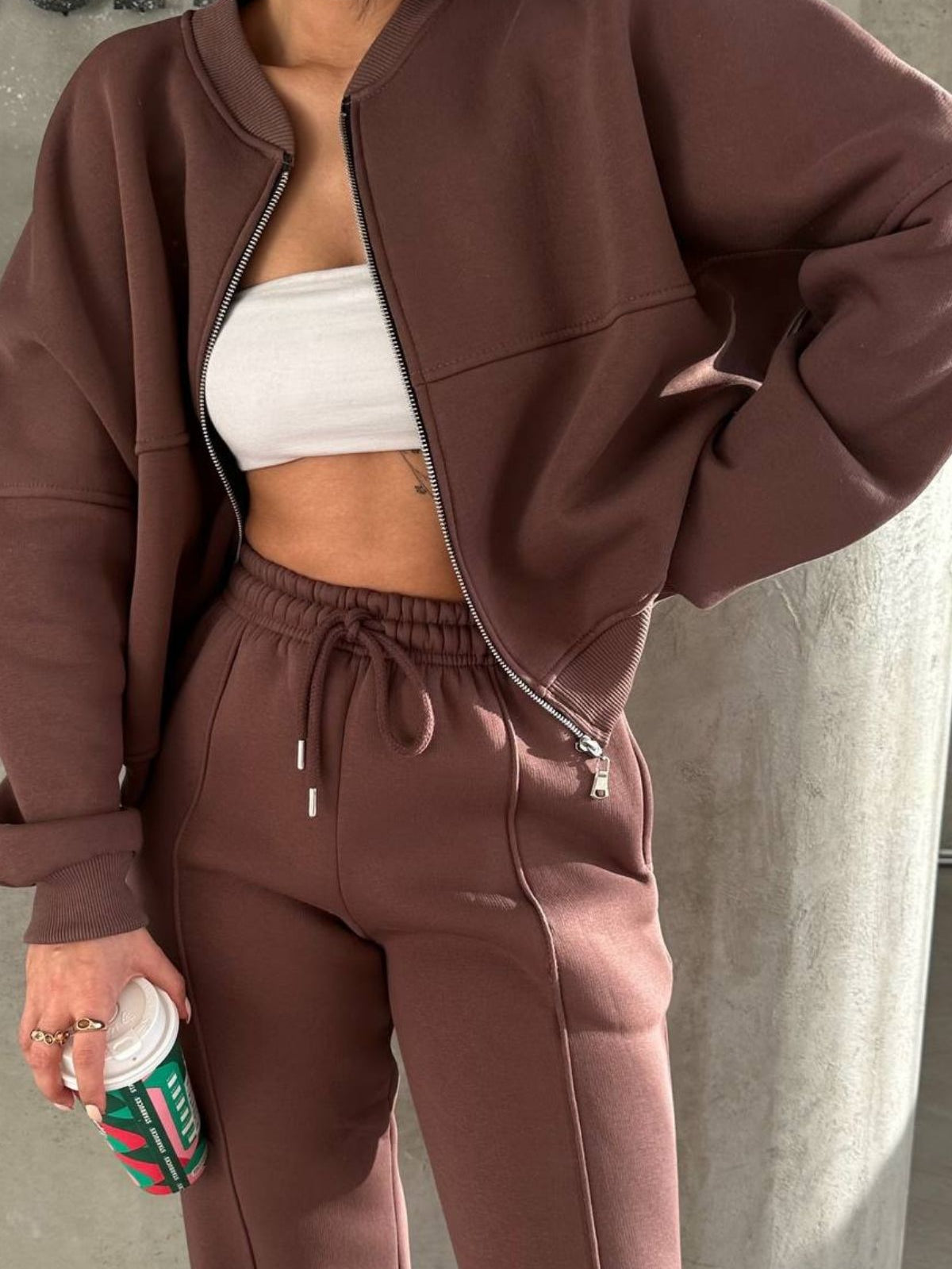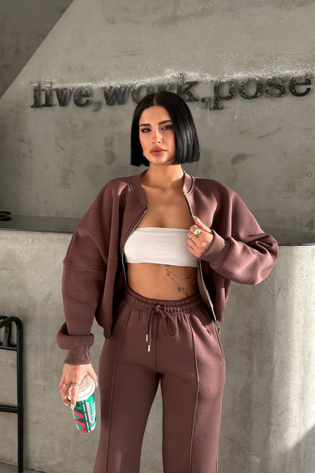 Kadın Yarım Fermuarlı Sweatshırt Ve Paçası Lastikli Kahverengi Eşofman Takımı