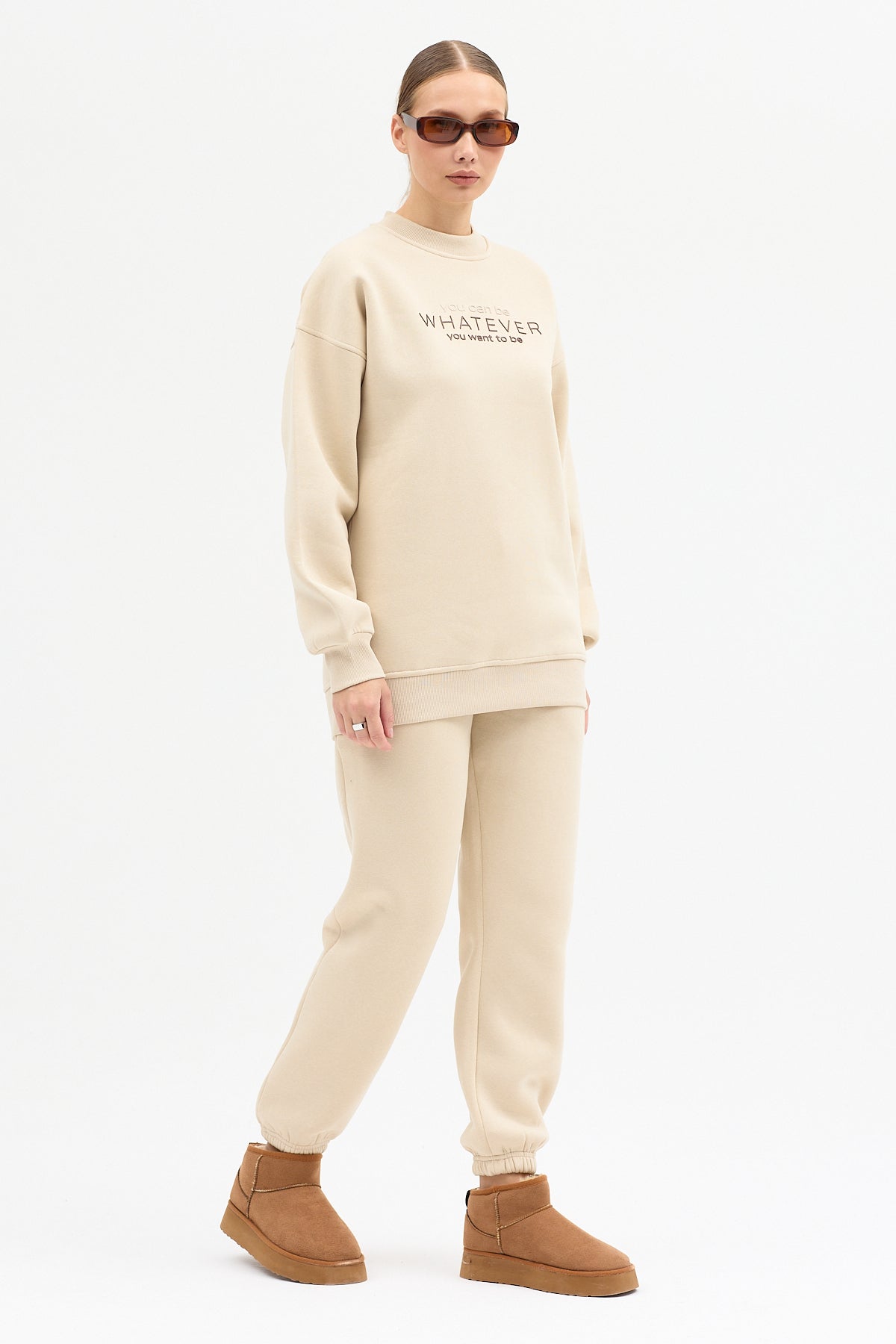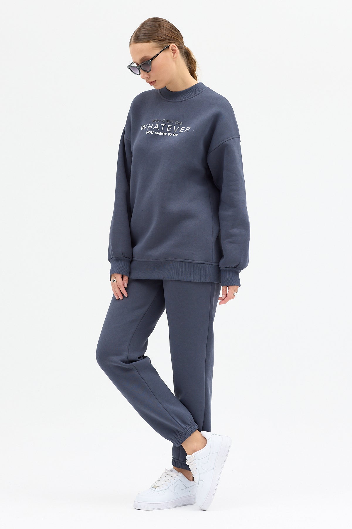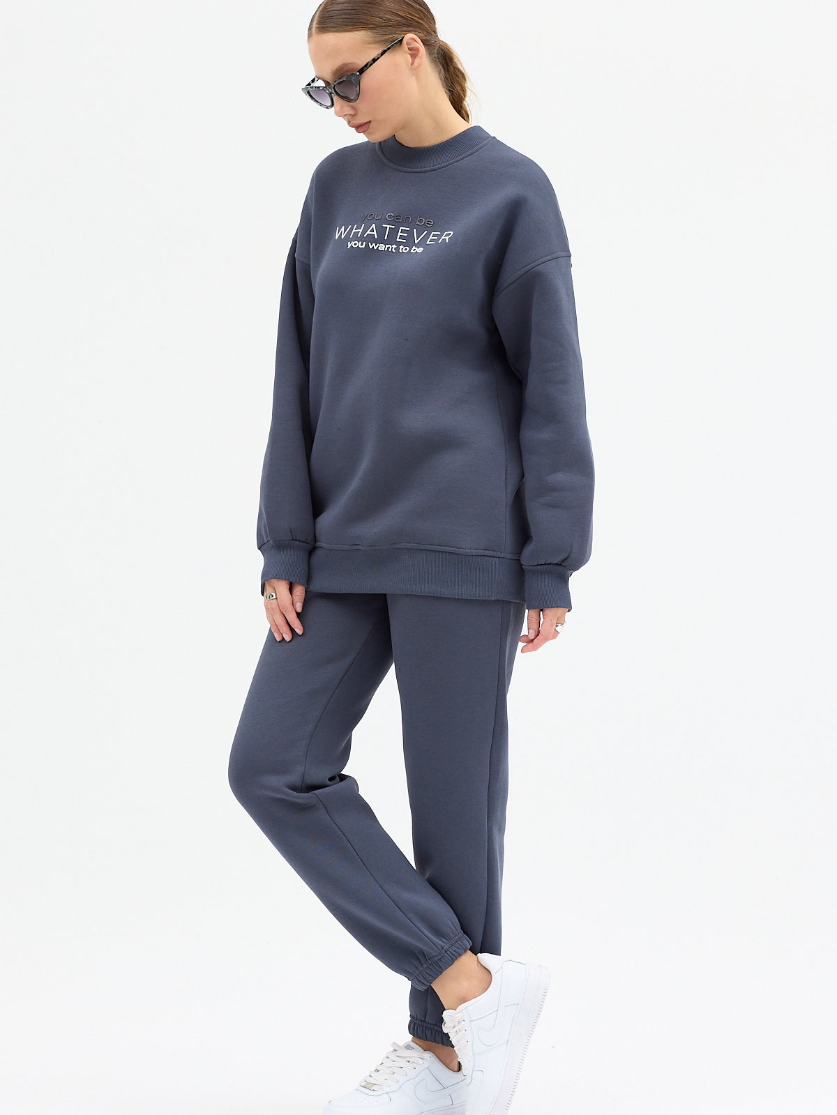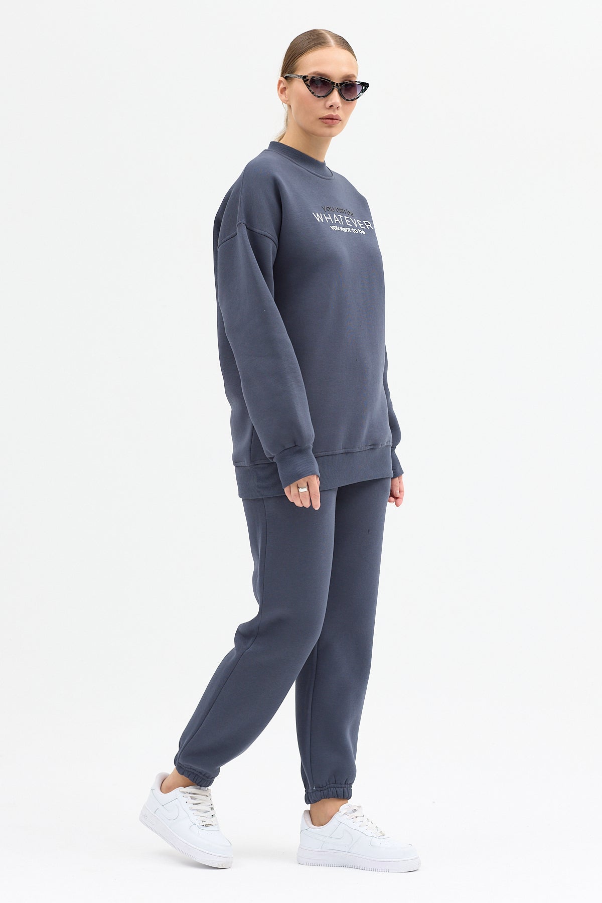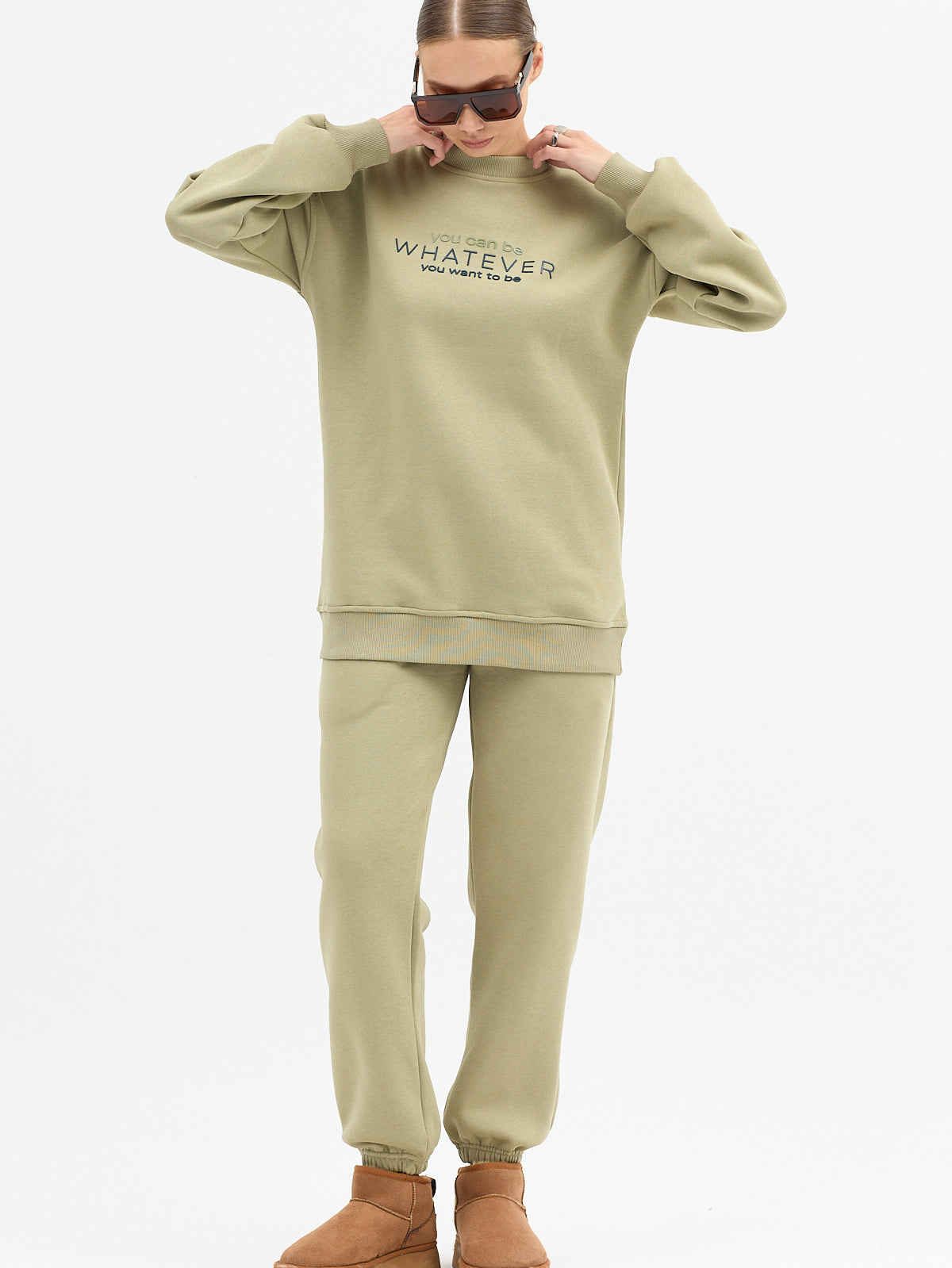Kadın Whatever Baskılı Bisiklet Yaka Paçası Lastikli Oversize Eşofman Takımı