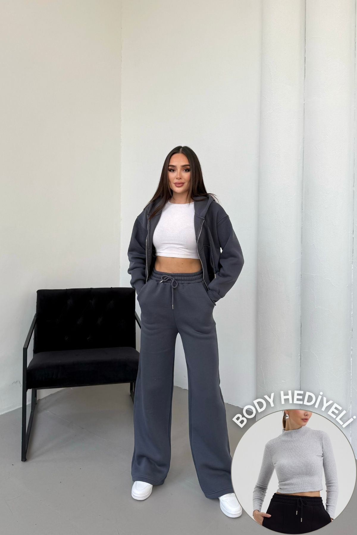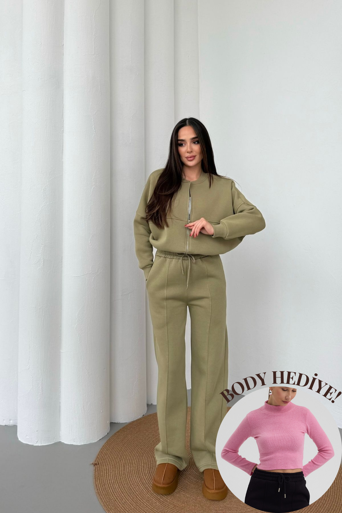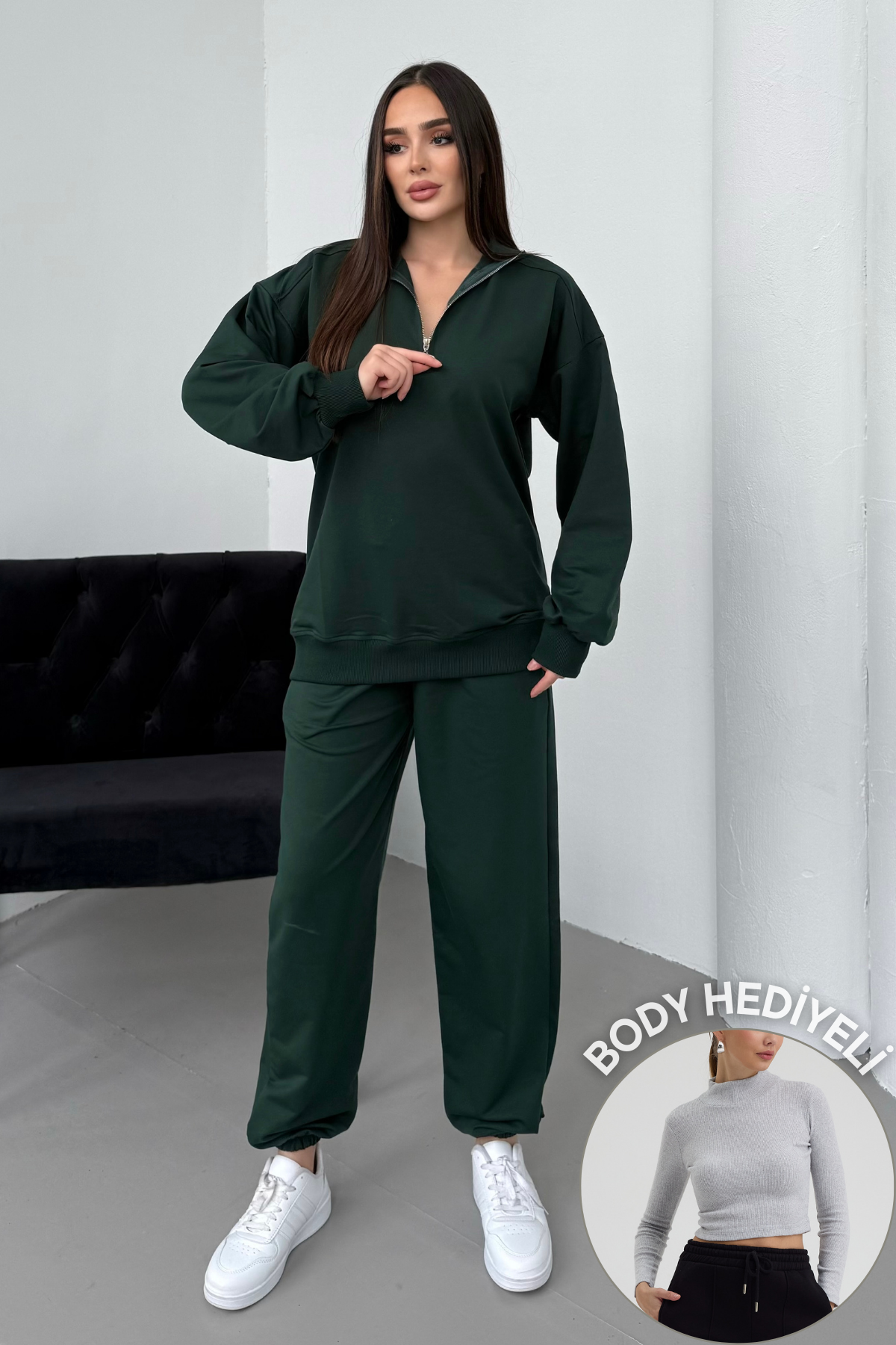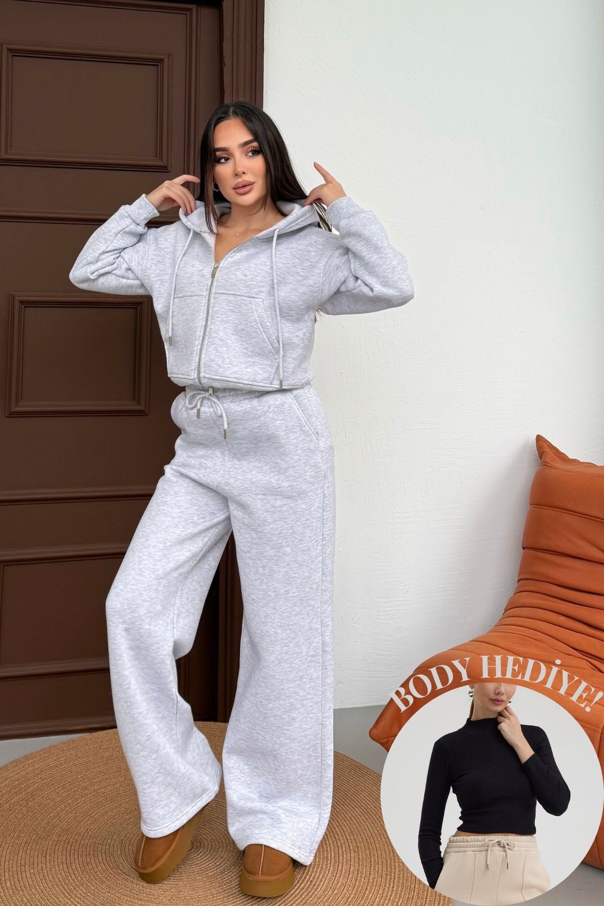 Kadın Şardonlu Fermuar Detaylı Üç Iplik Kışlık Eşofman Takımı
