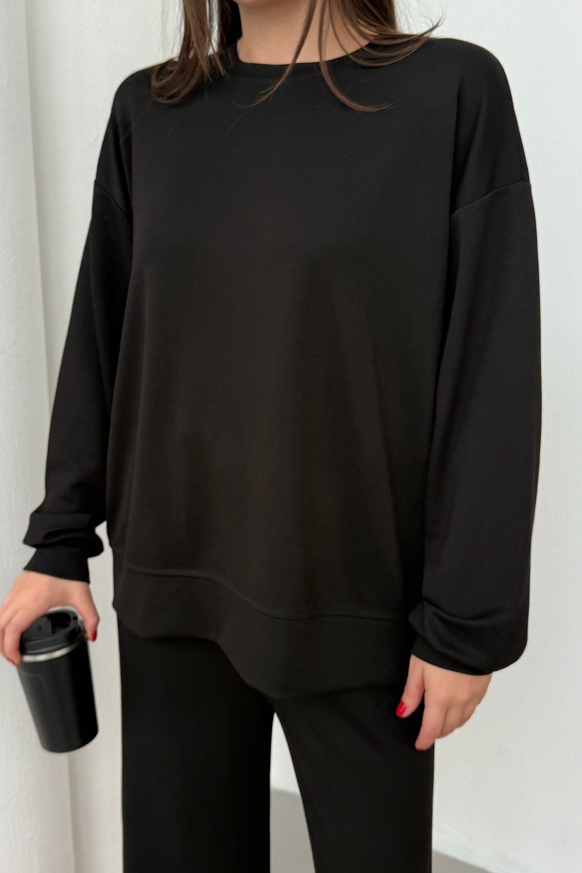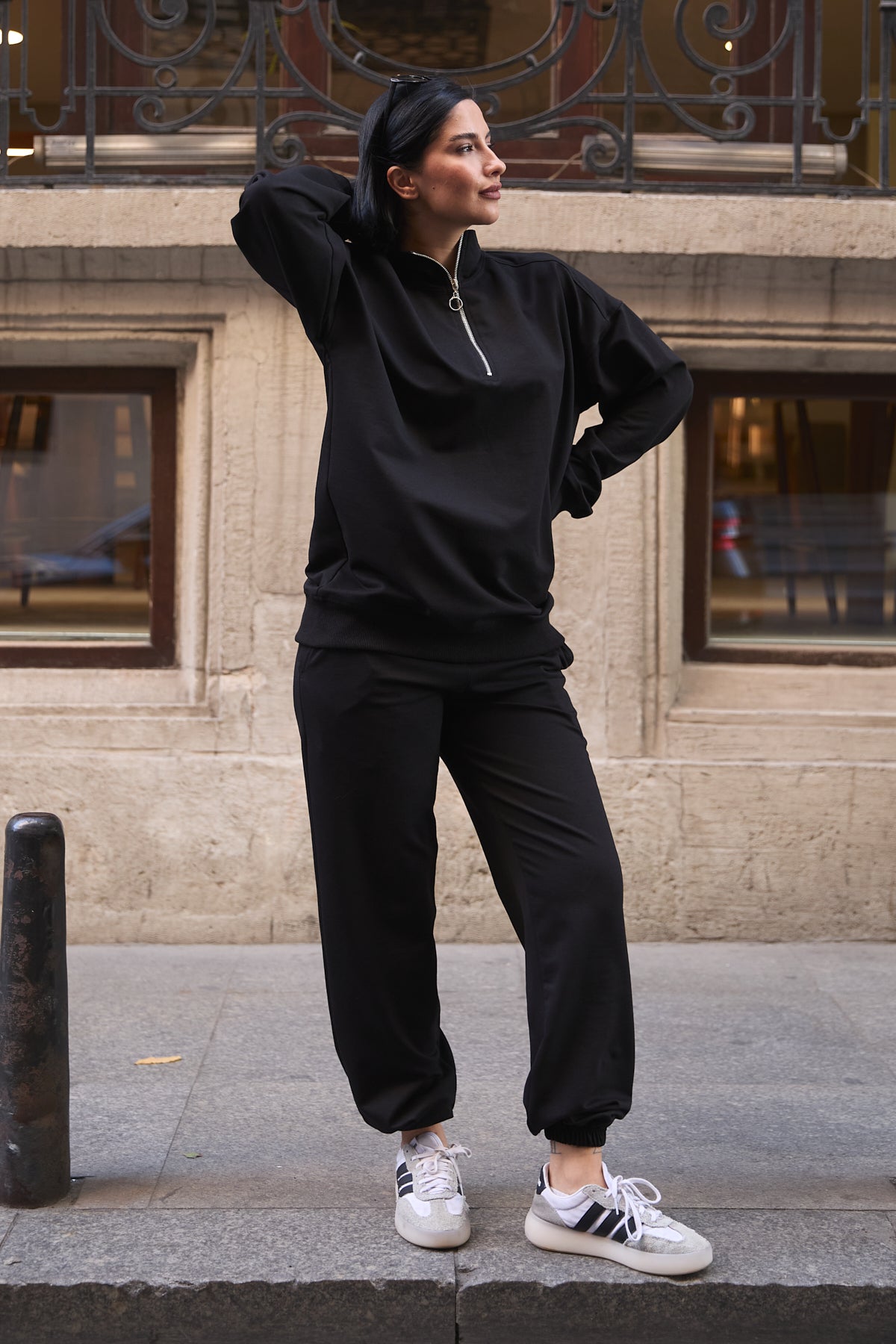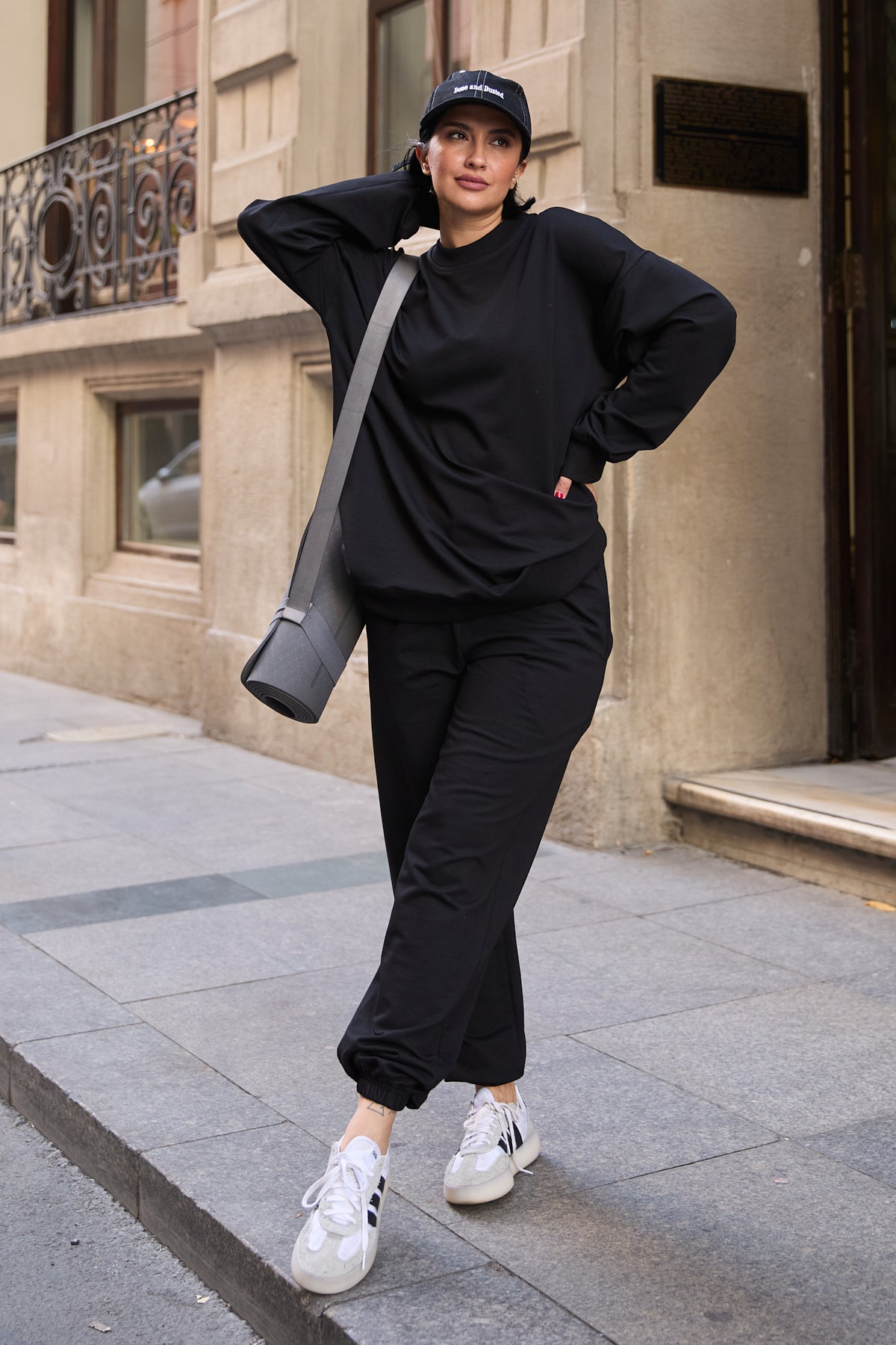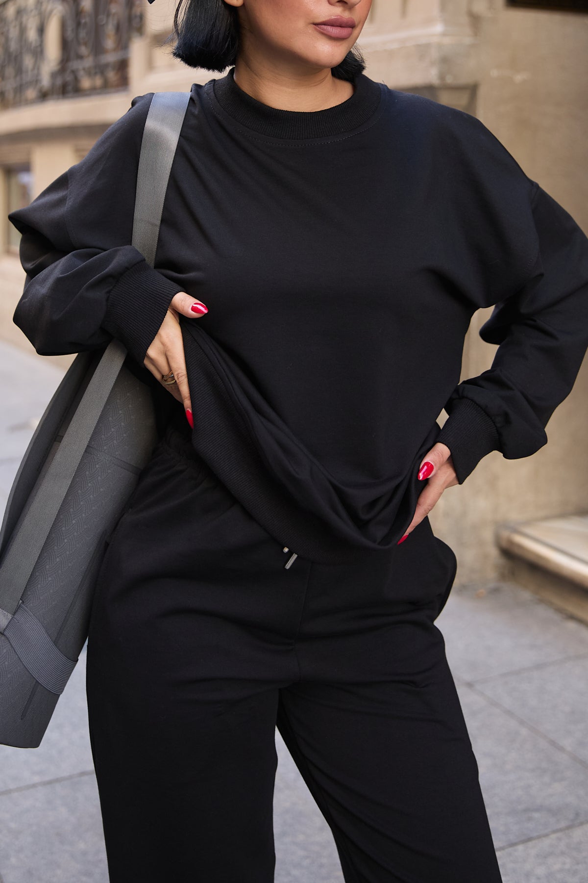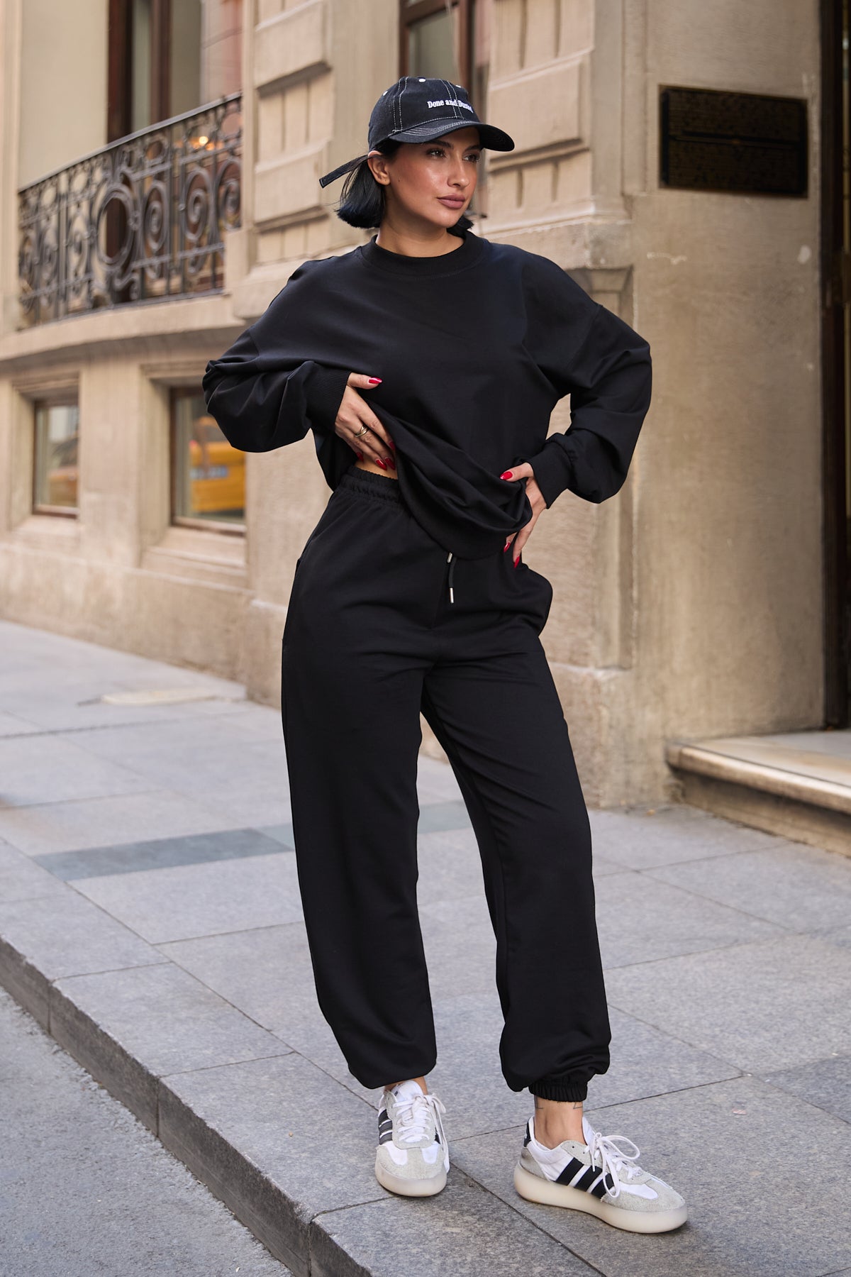 Regular Fit 2'li Takım Sweatshirt Beli Lastikli Jogger Siyah Eşofman Altı