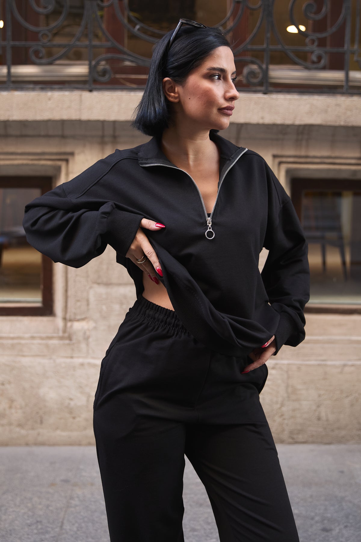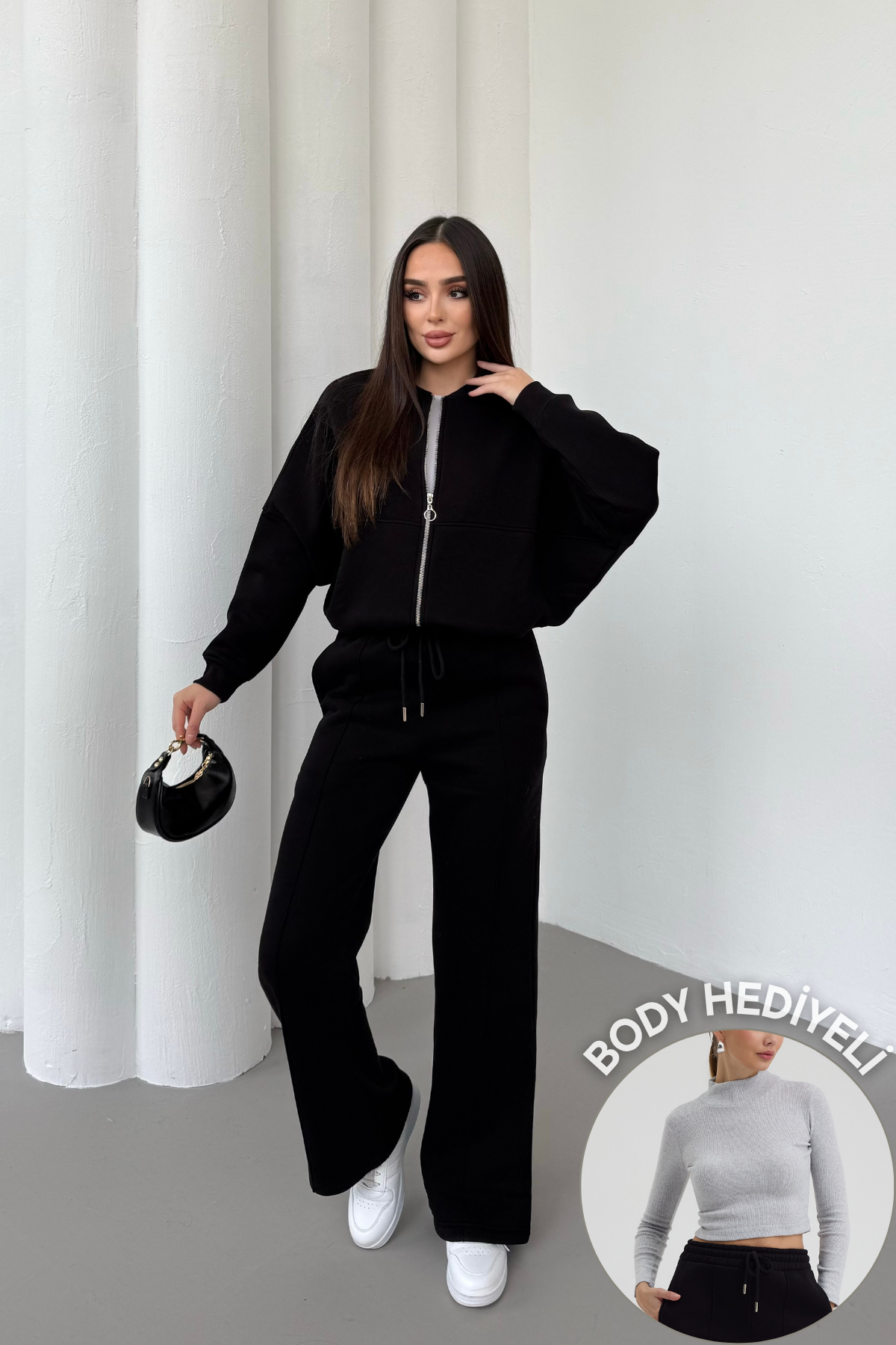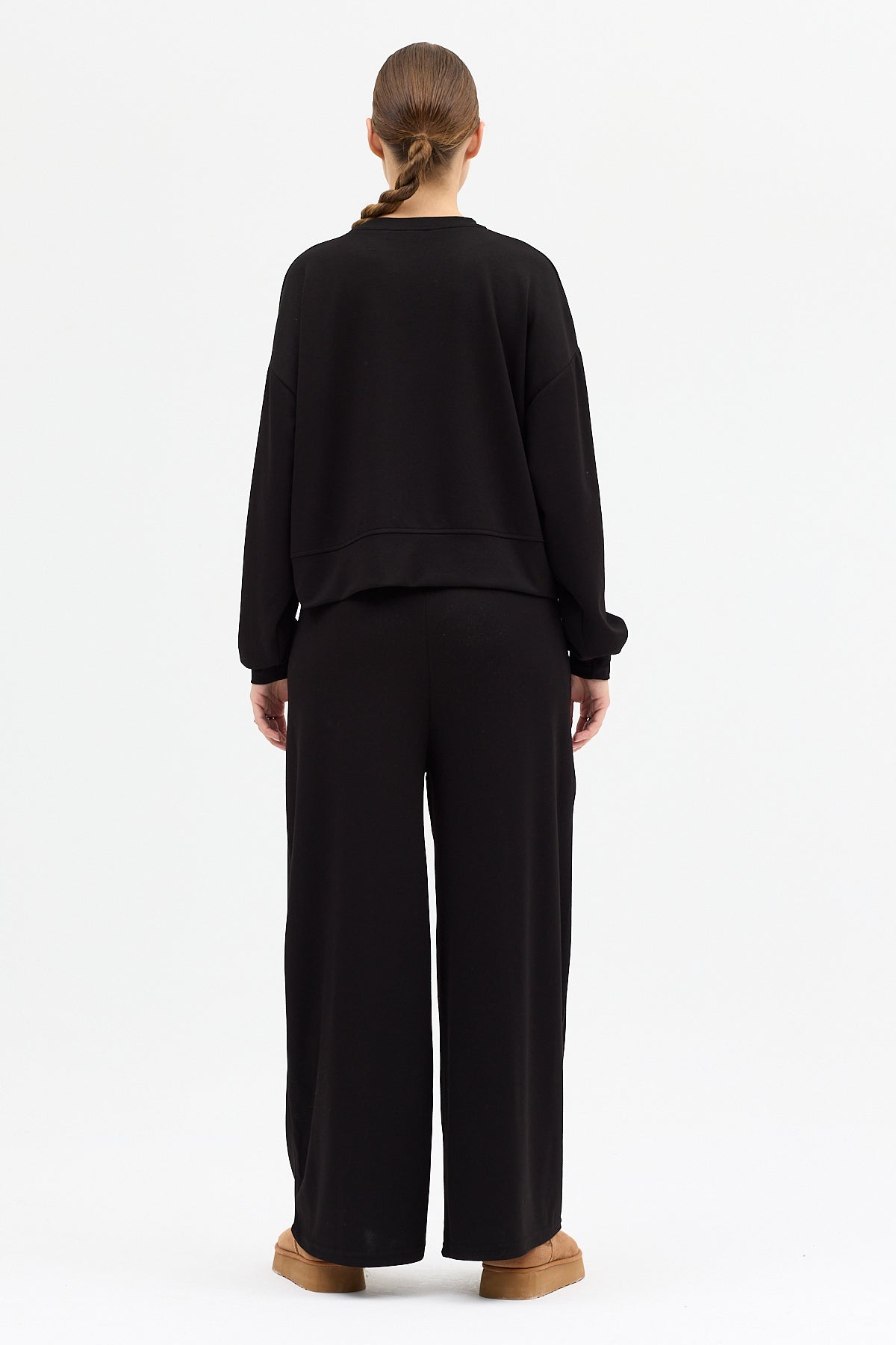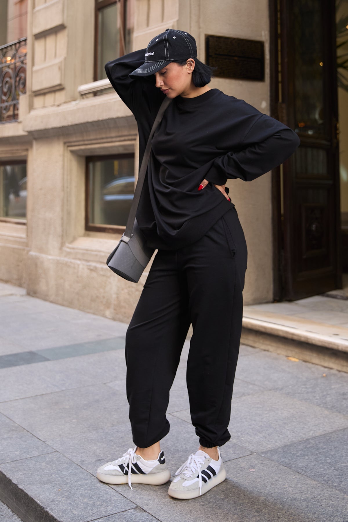 Regular Fit 2'li Takım Sweatshirt Beli Lastikli Jogger Siyah Eşofman Altı