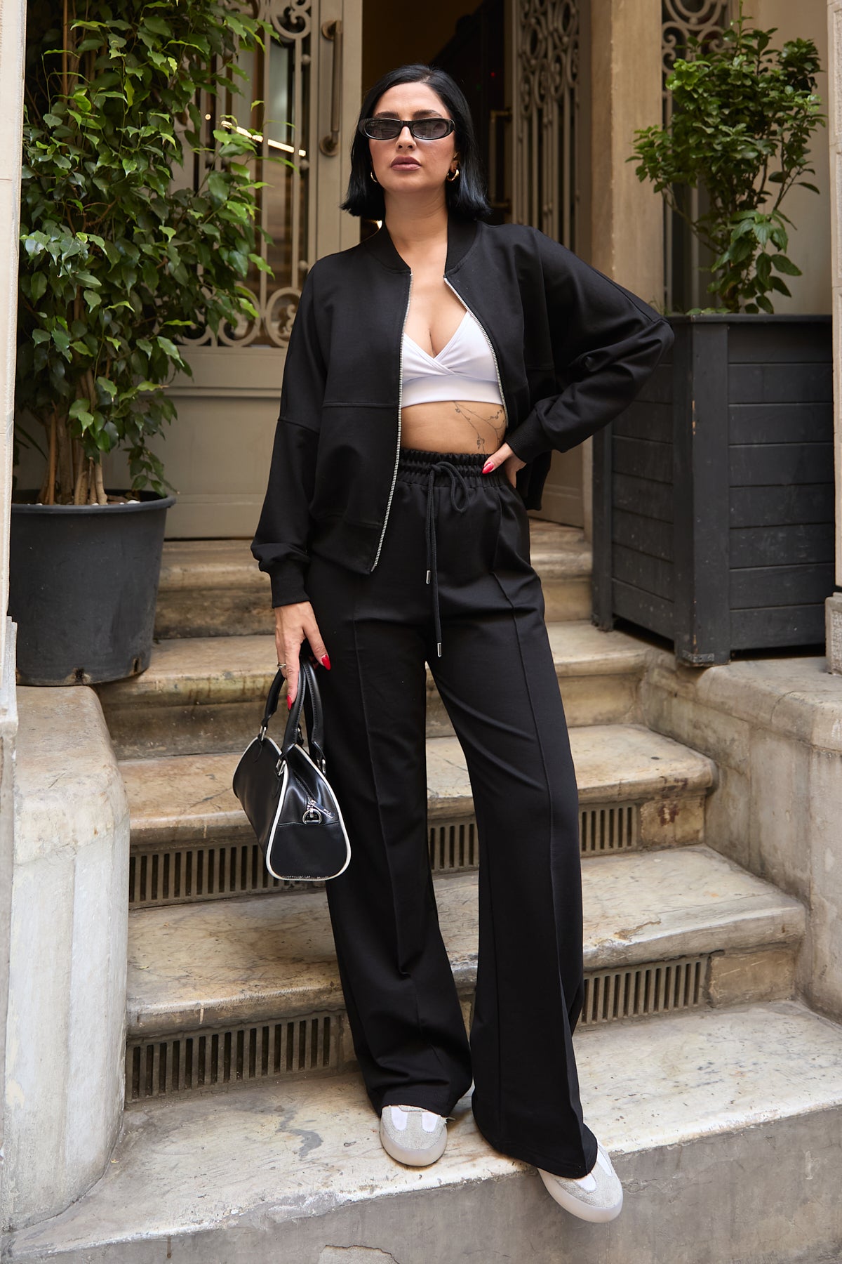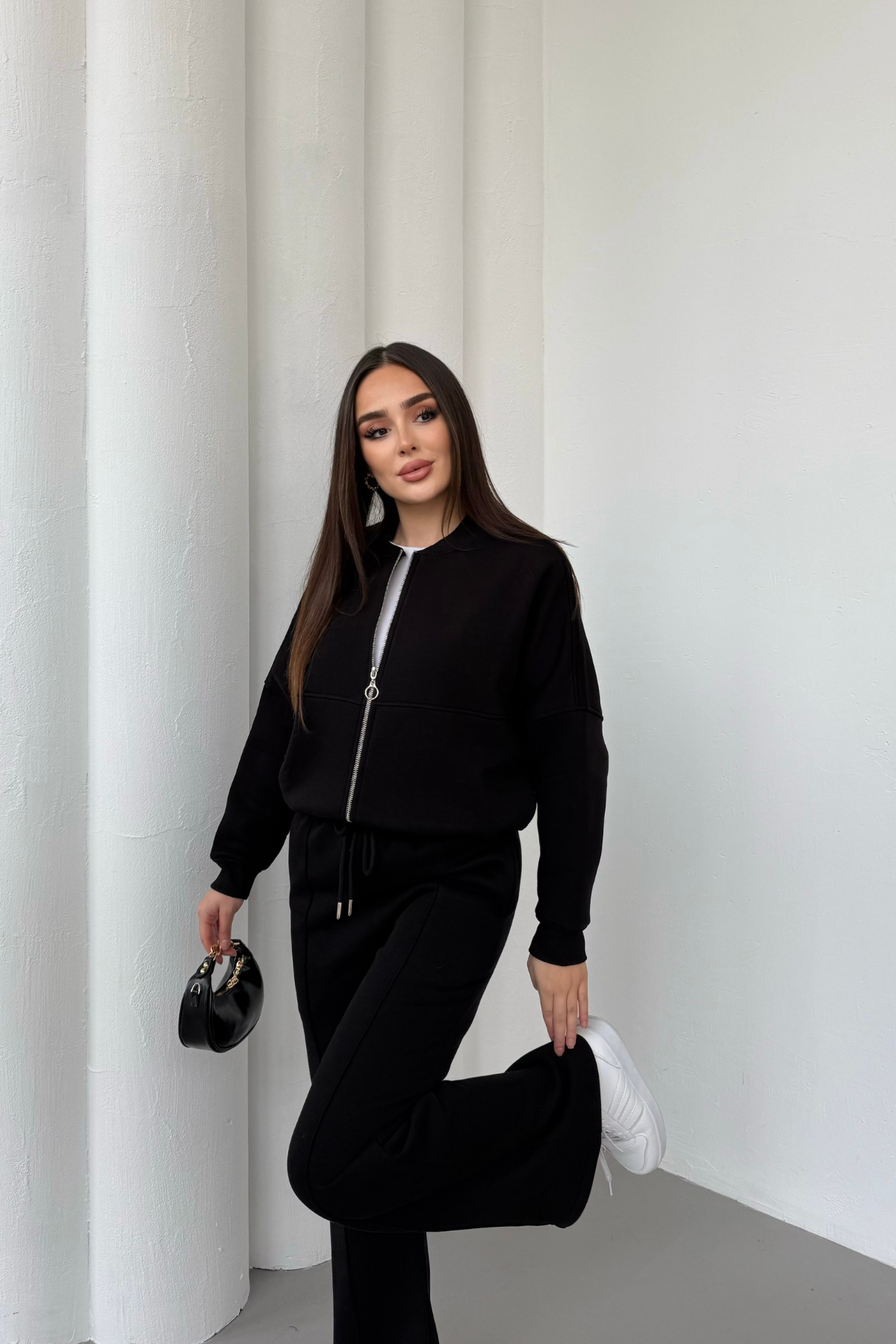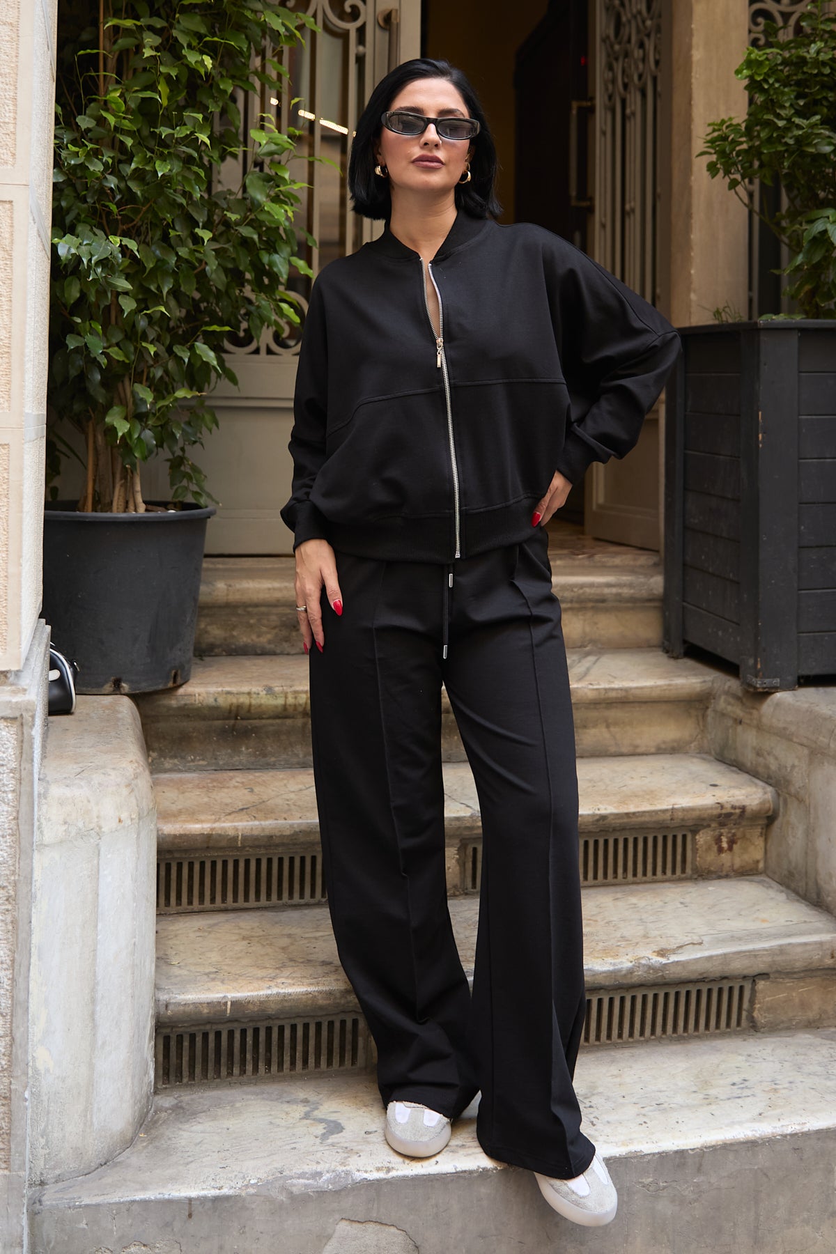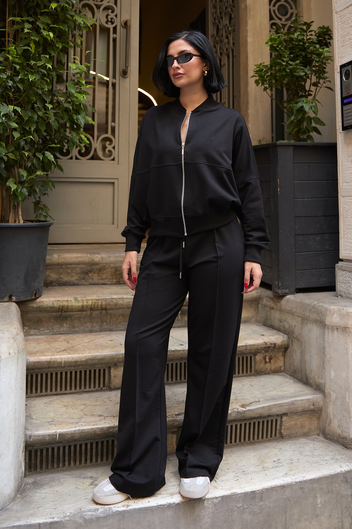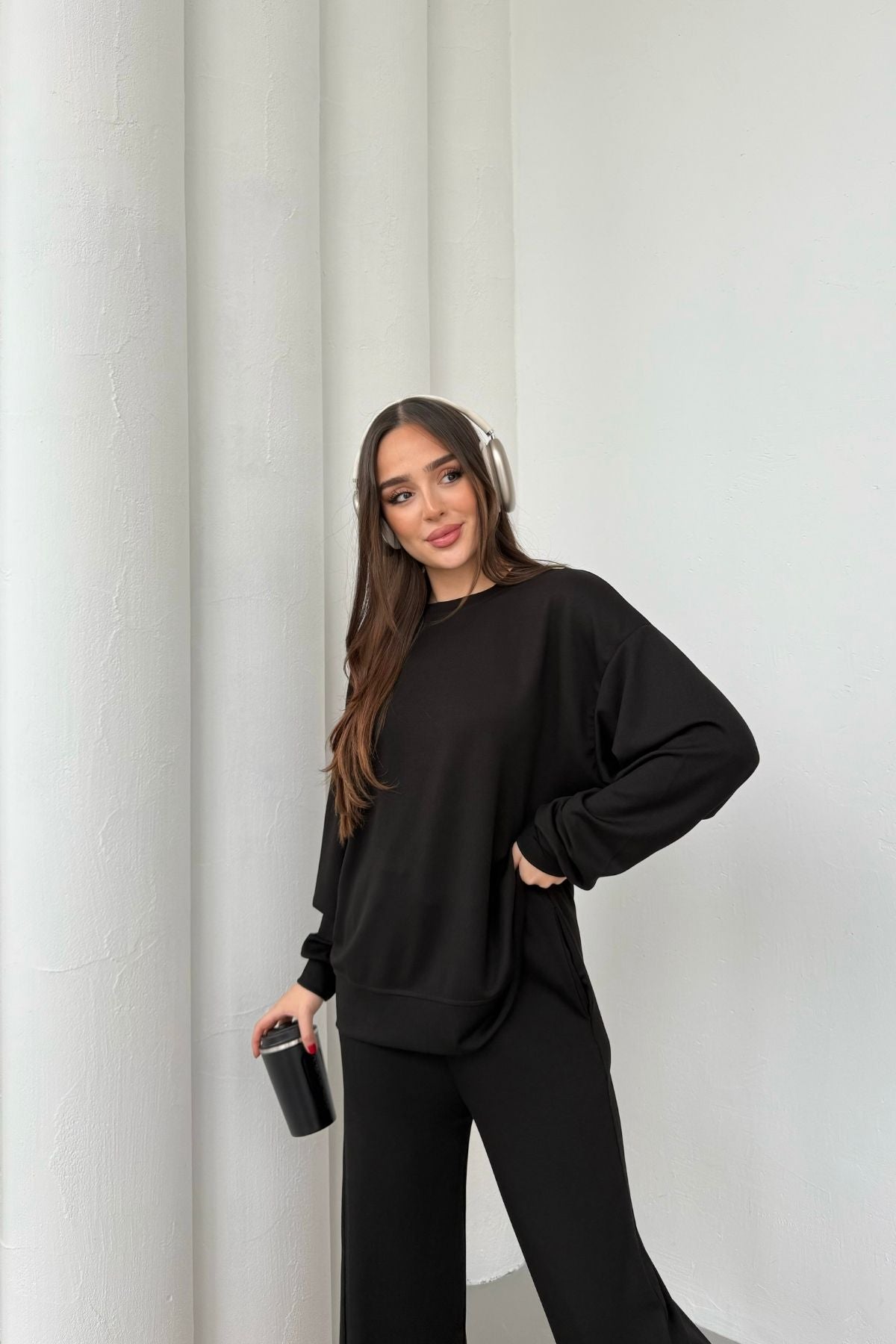 Regular Fit 2'li Takım Sweatshirt Beli Lastikli Jogger Siyah Eşofman Altı
