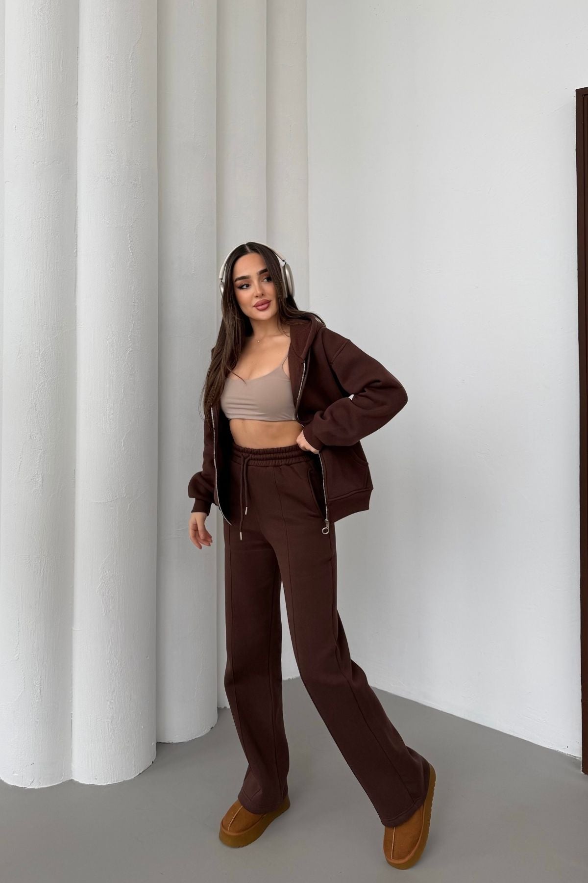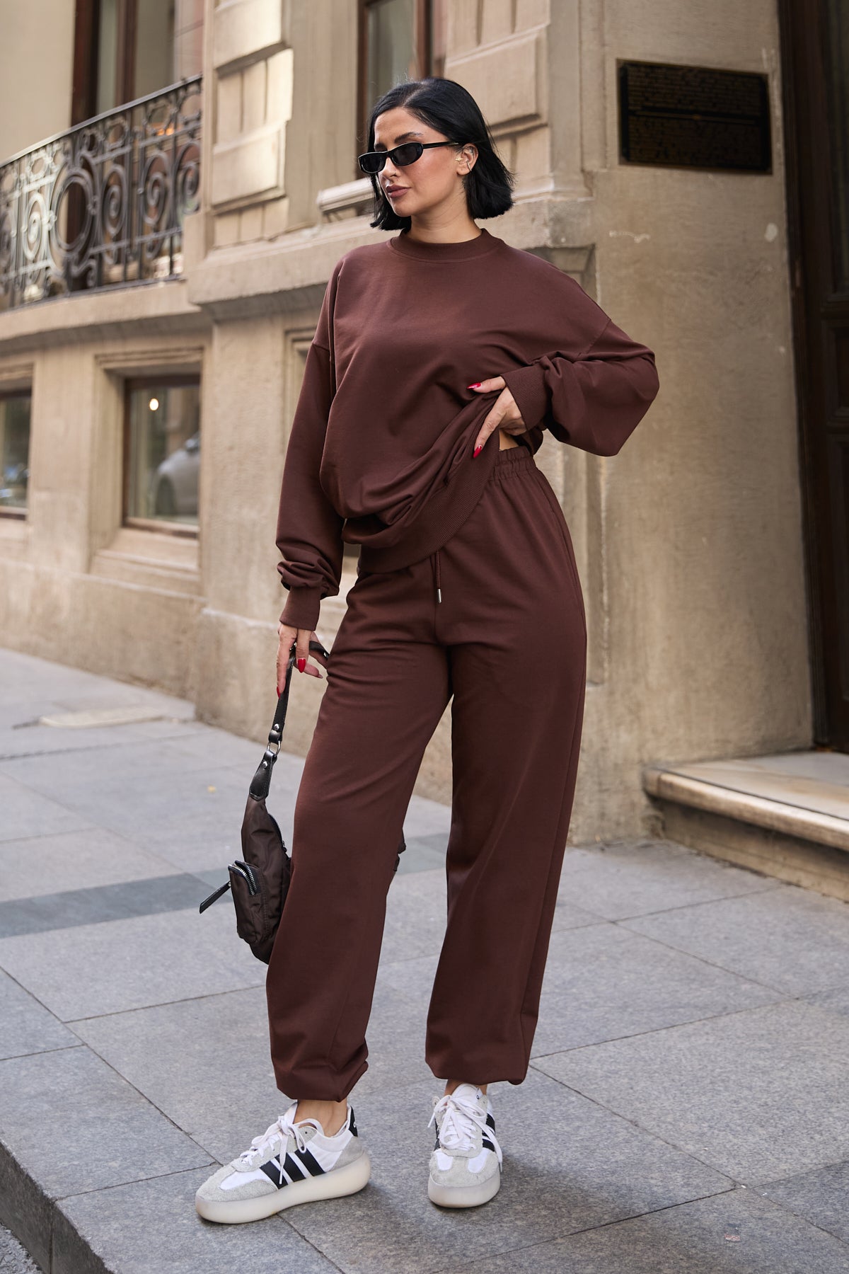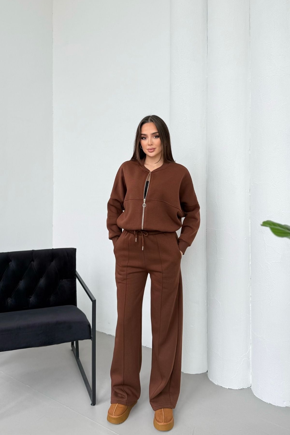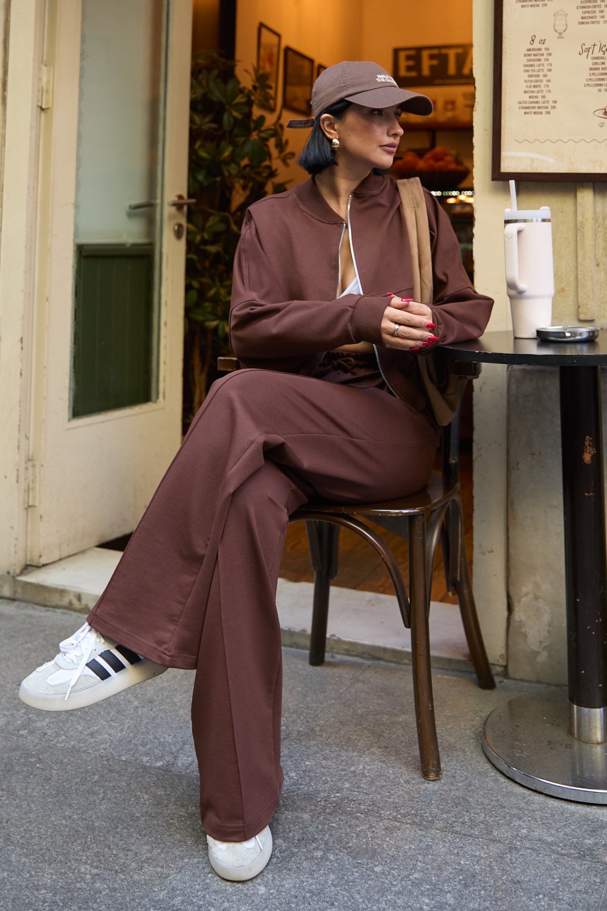 Kadın Yarım Fermuarlı Sweatshırt Ve Paçası Lastikli Kahverengi Eşofman Takımı
