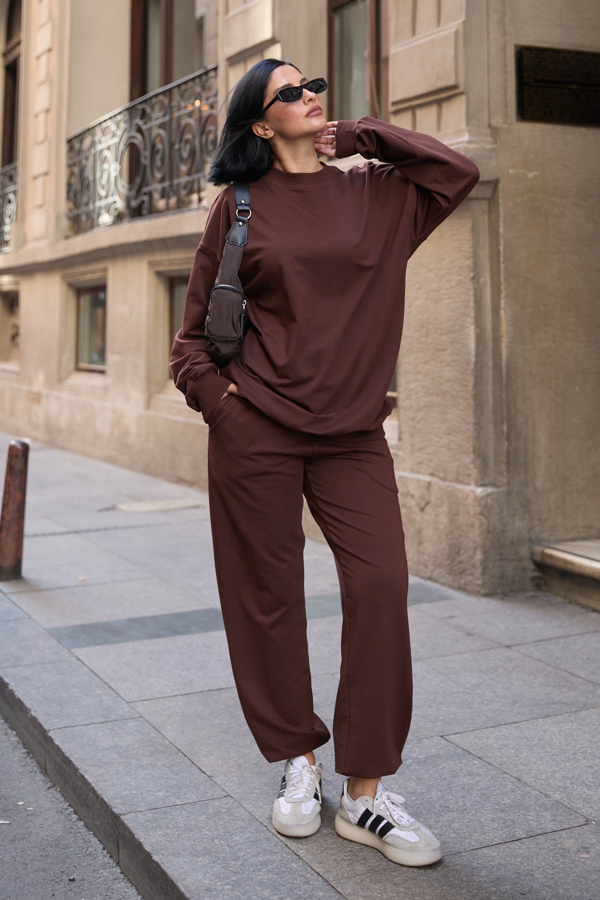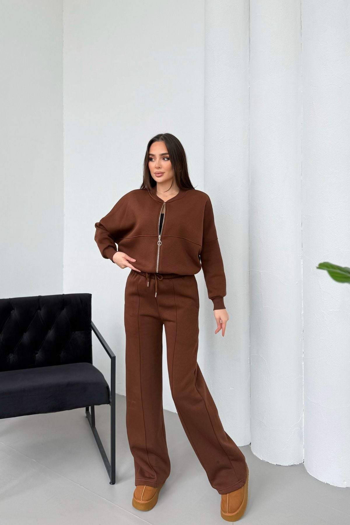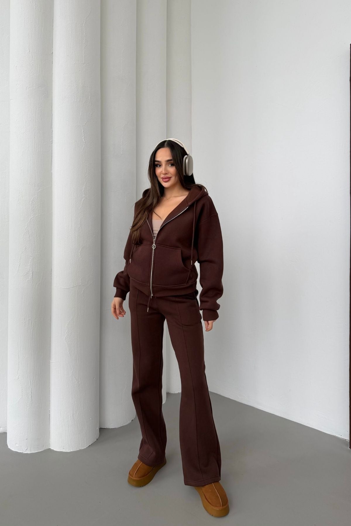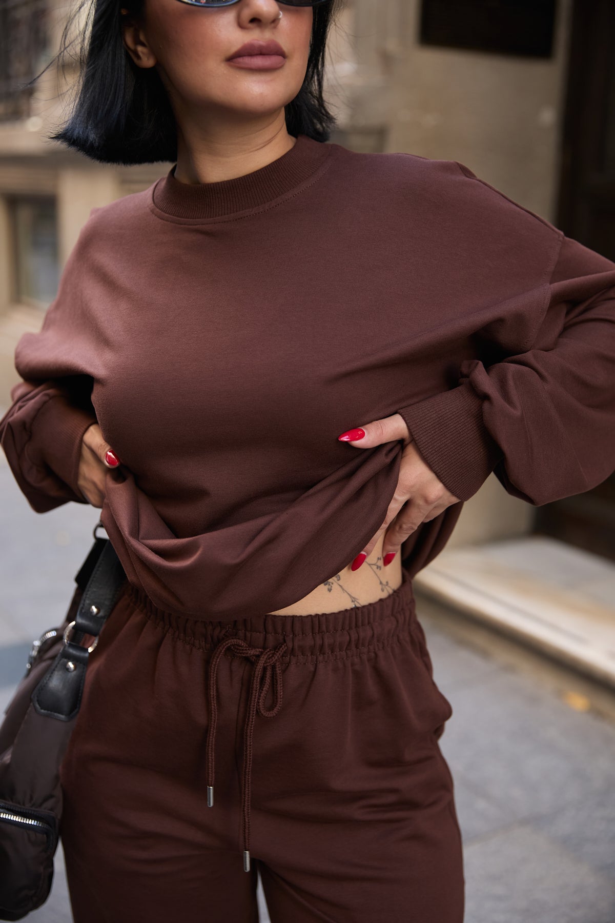 Kadın Yarım Fermuarlı Sweatshırt Ve Paçası Lastikli Kahverengi Eşofman Takımı