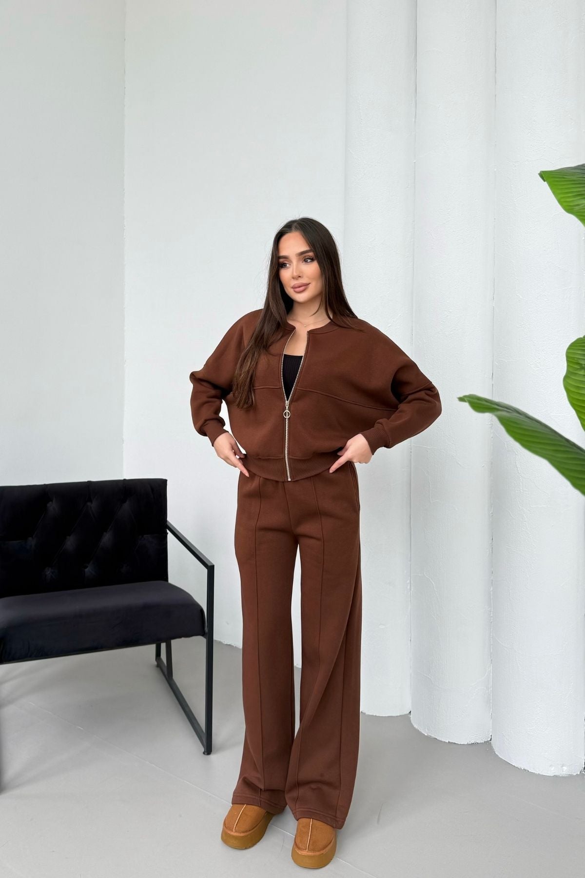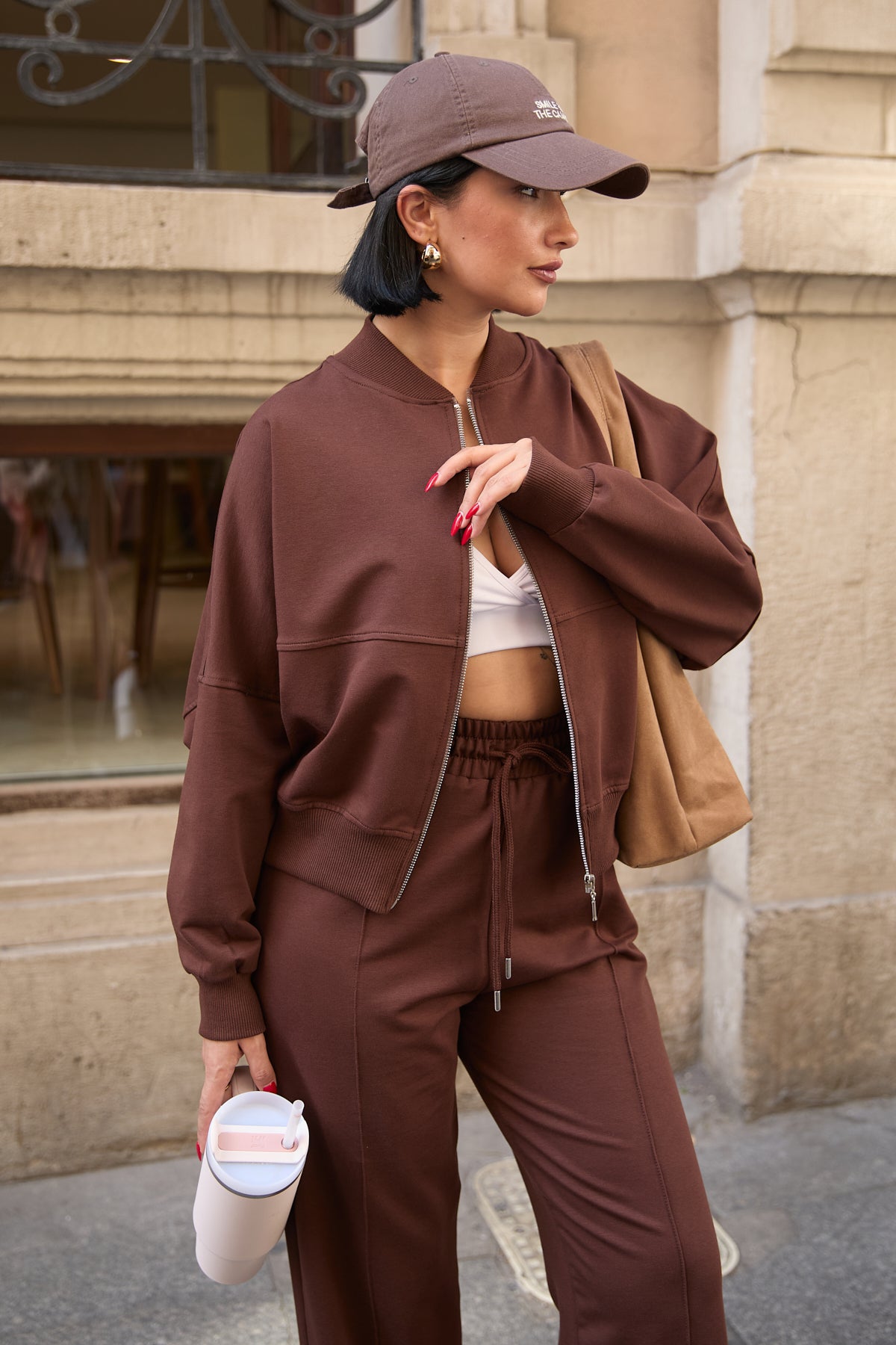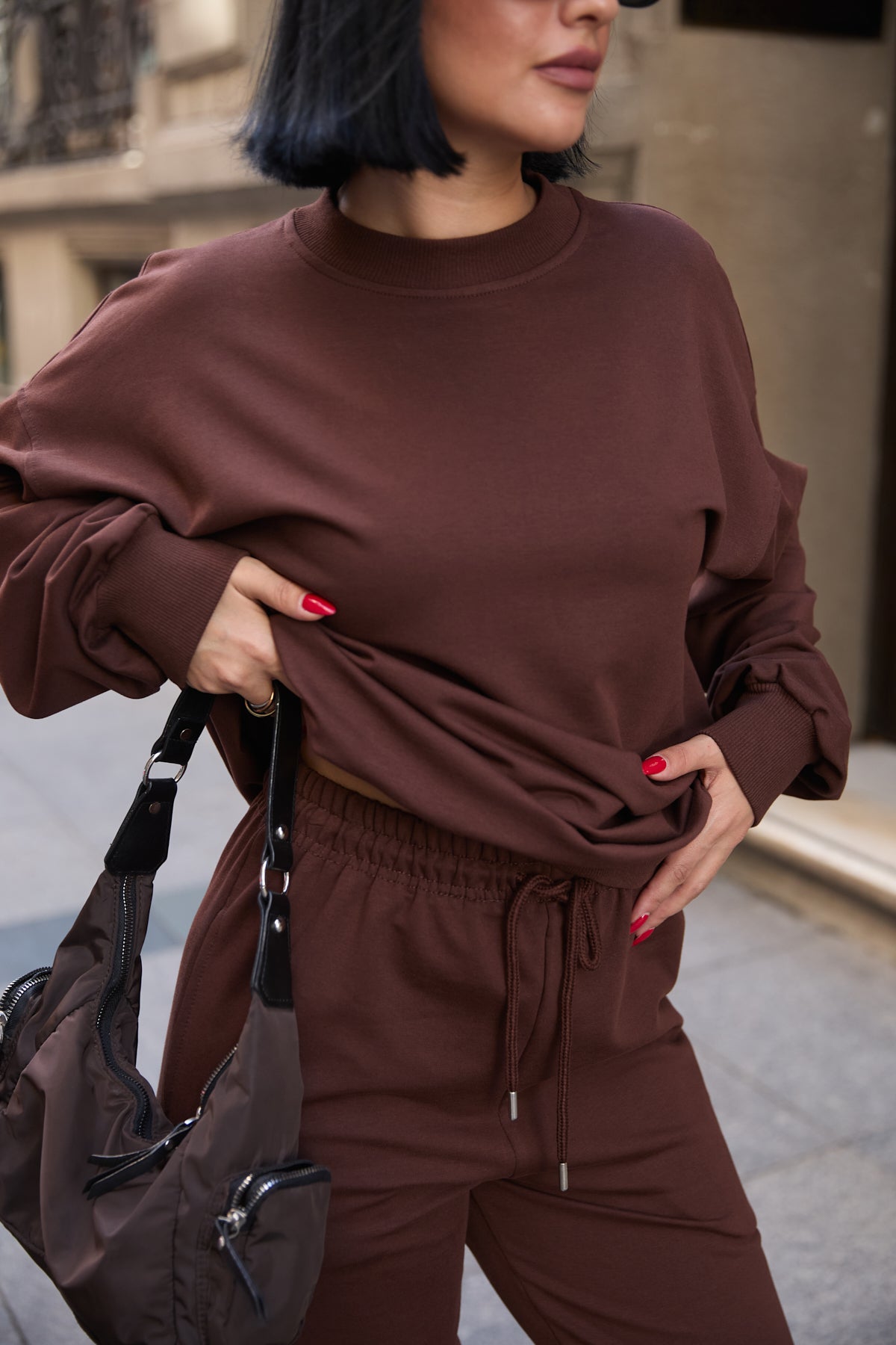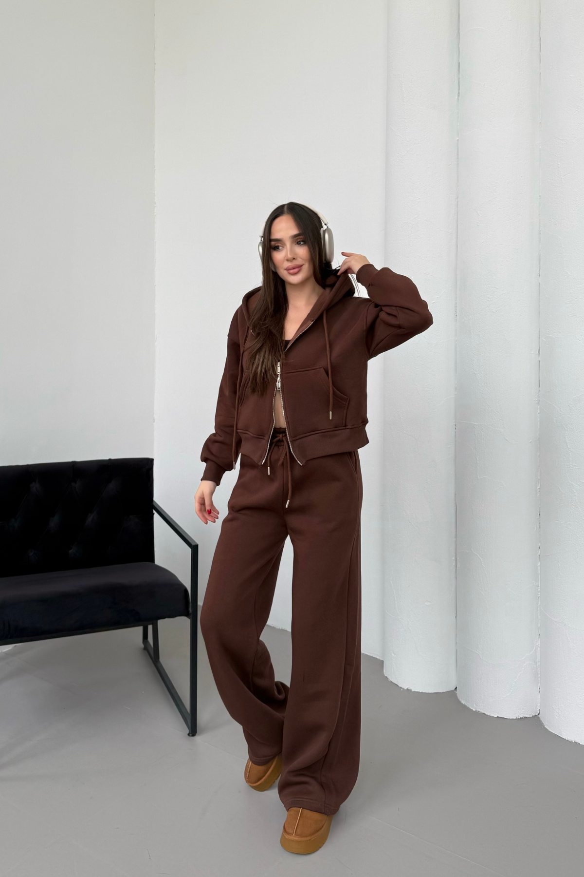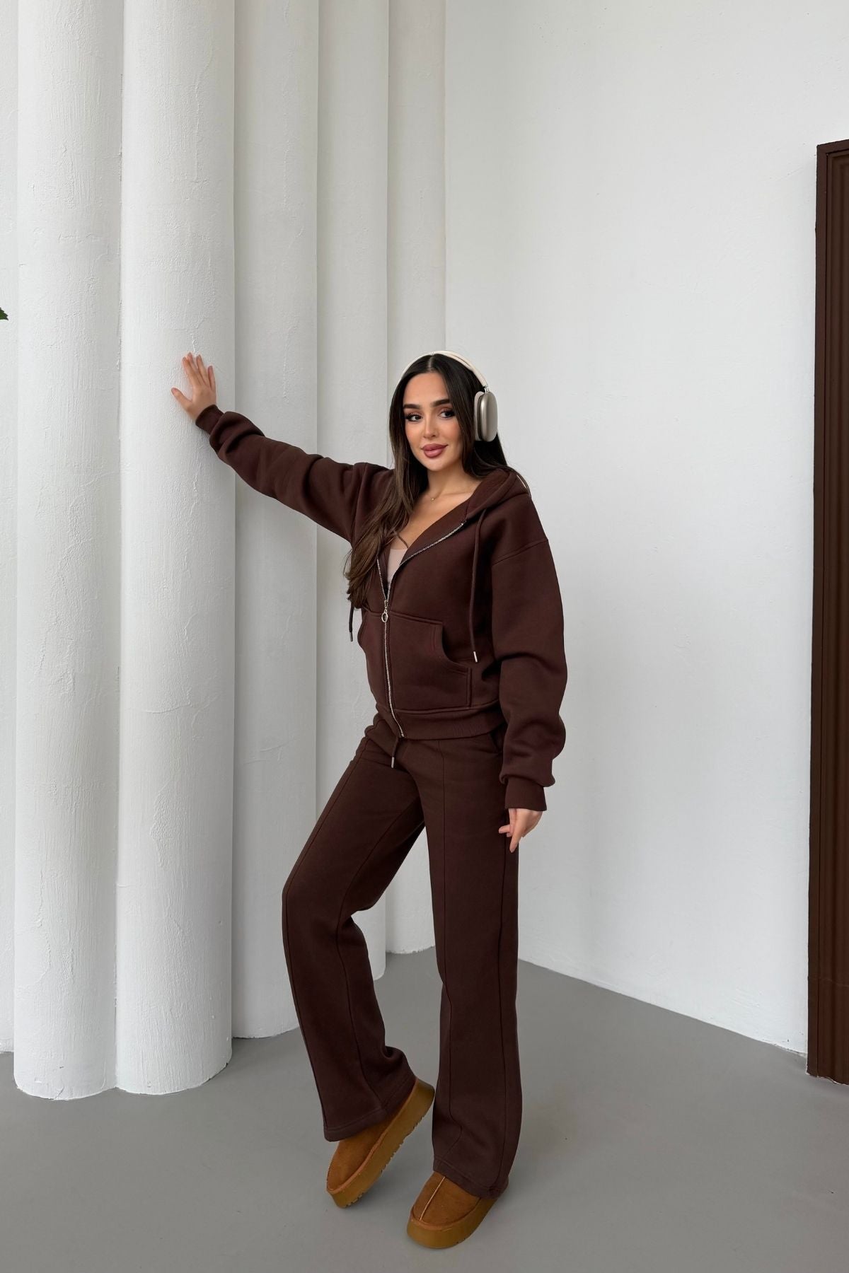 Kadın Yarım Fermuarlı Sweatshırt Ve Paçası Lastikli Kahverengi Eşofman Takımı